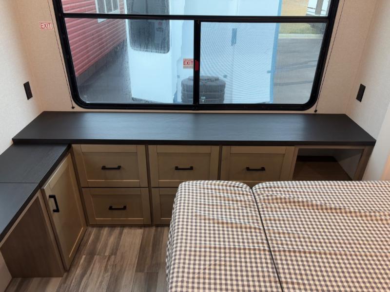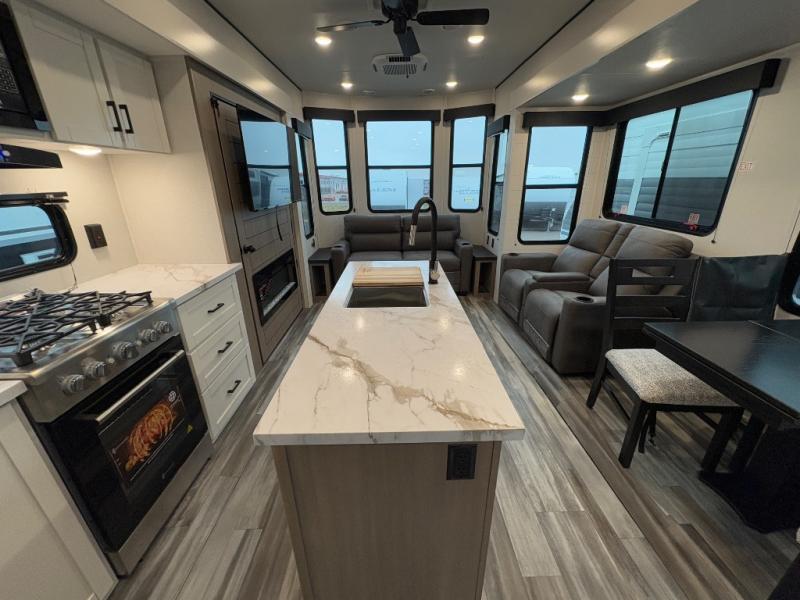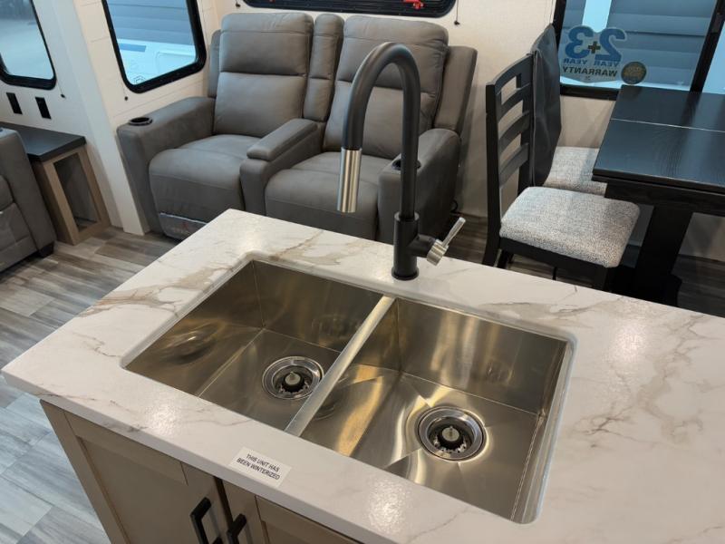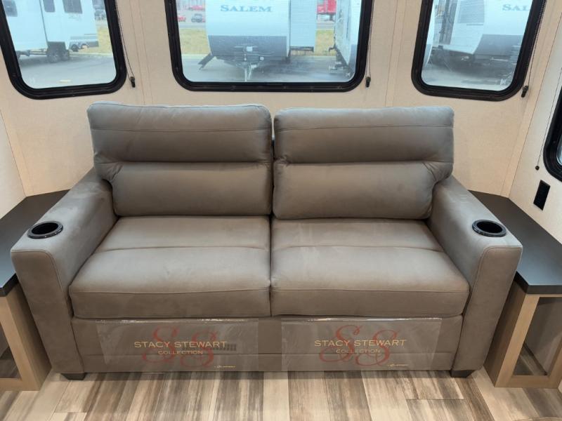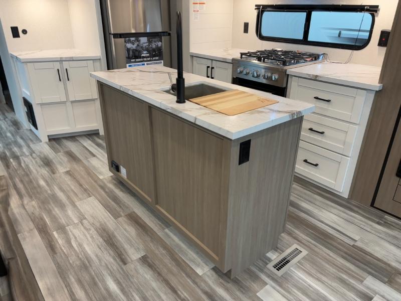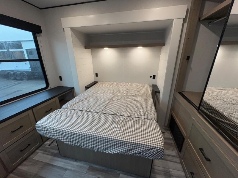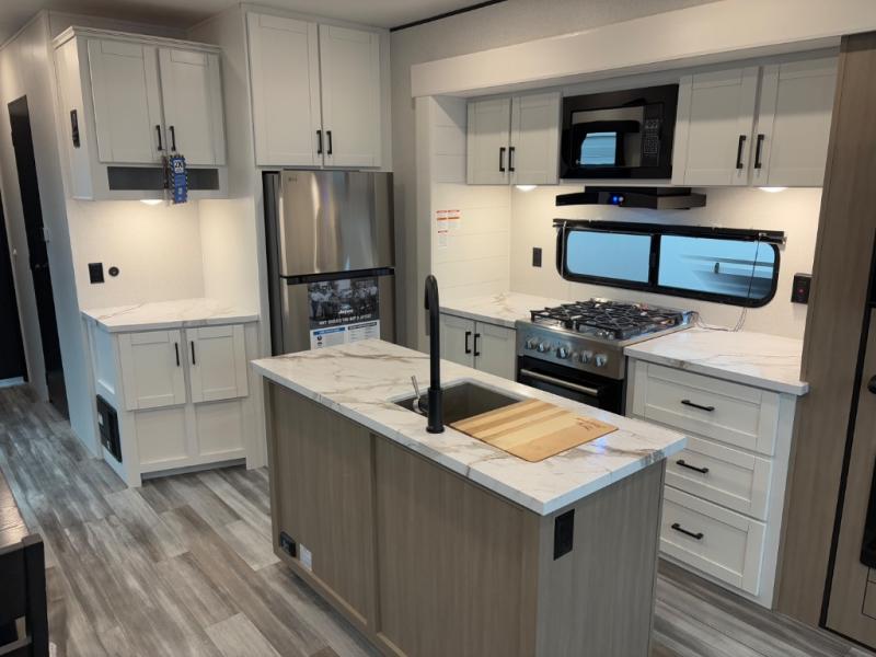 Your crew of four will love extended stays in this triple slide out trailer! Once you've unpacked your bags, you can head to the kitchen to prepare lunch on the cooktop and kitchen island. There is a table and chairs with a bench to dine at, and you can relax on the theater seat after your meal is cleaned up. A front tri-fold sofa will provide more seating space, along with sleeping space for guests. A full bath includes washer and dryer prep if you plan to add these appliances, and the rear private bedroom is sure to make you feel right at home. There is a queen bed slide, a wardrobe, vanity, and large dresser so nothing gets left behind!