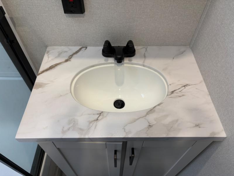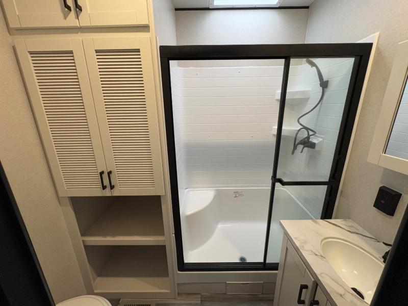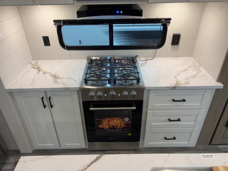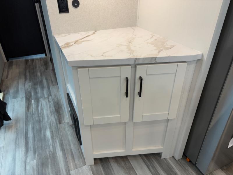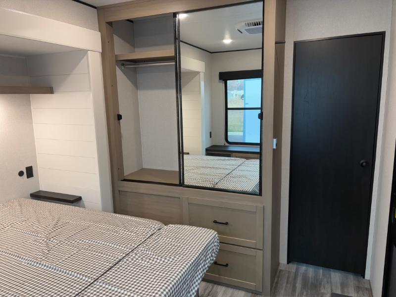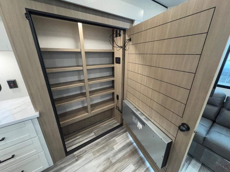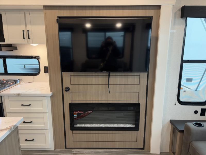 Your crew of four will love extended stays in this triple slide out trailer! Once you've unpacked your bags, you can head to the kitchen to prepare lunch on the cooktop and kitchen island. There is a table and chairs with a bench to dine at, and you can relax on the theater seat after your meal is cleaned up. A front tri-fold sofa will provide more seating space, along with sleeping space for guests. A full bath includes washer and dryer prep if you plan to add these appliances, and the rear private bedroom is sure to make you feel right at home. There is a queen bed slide, a wardrobe, vanity, and large dresser so nothing gets left behind!