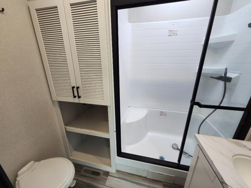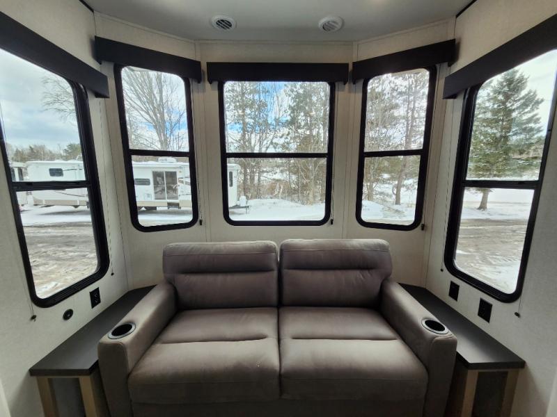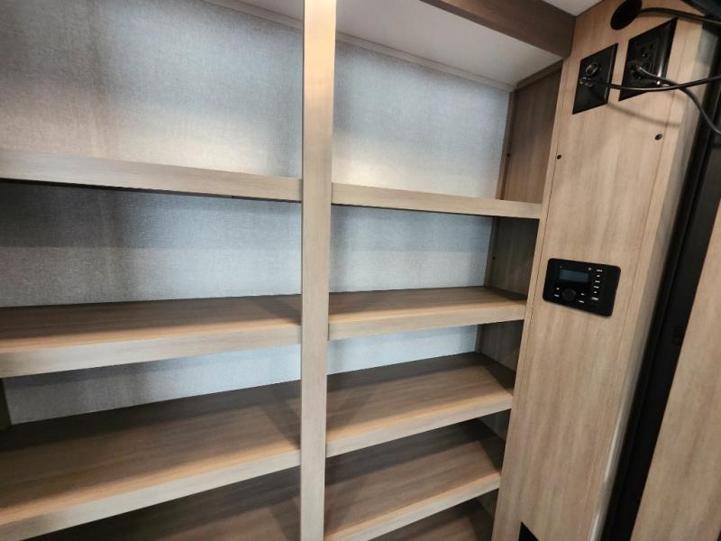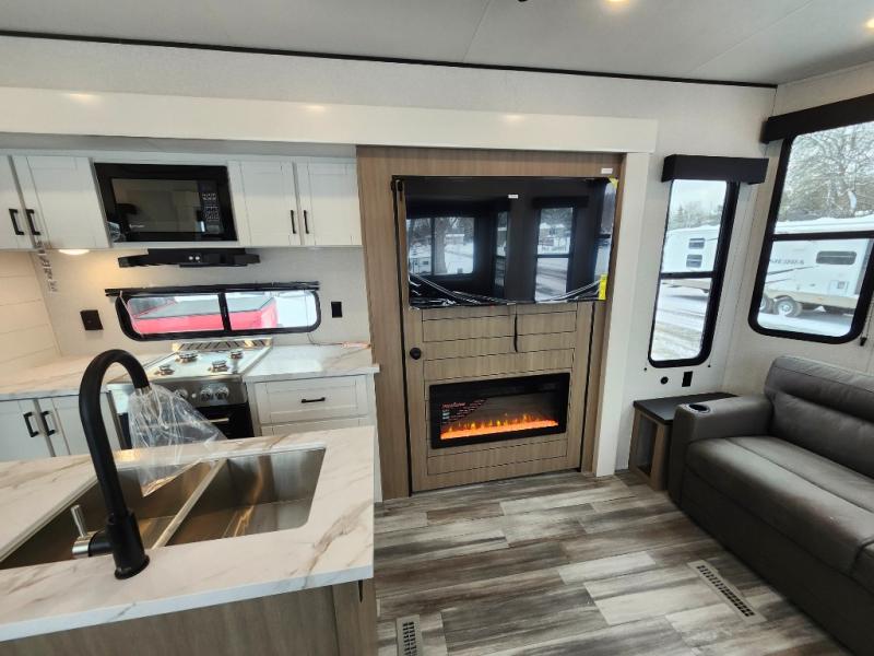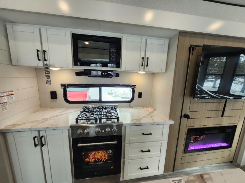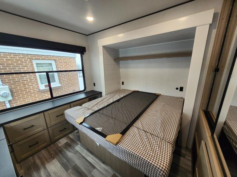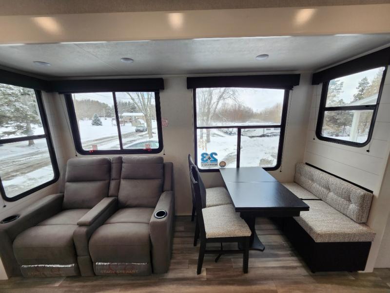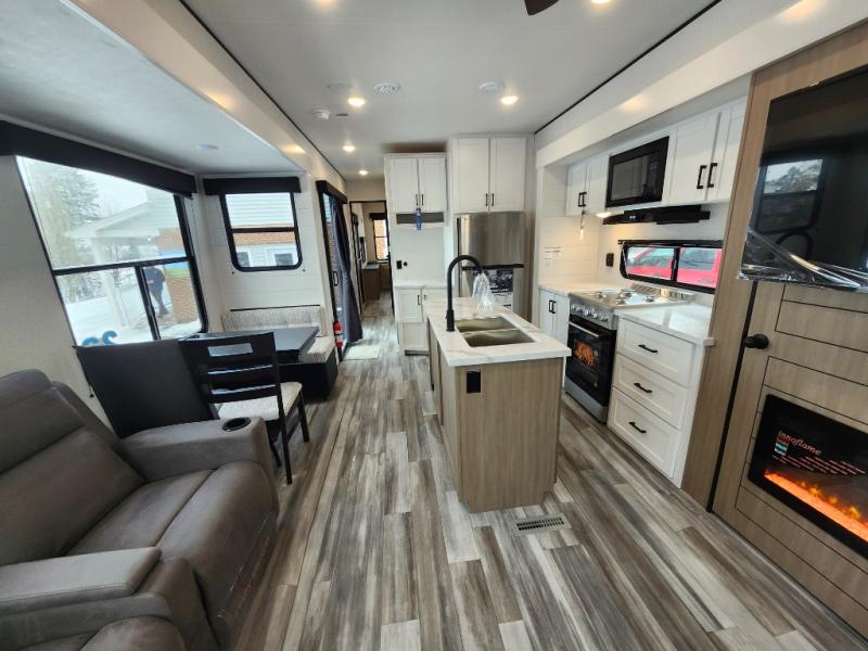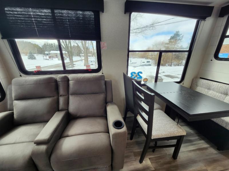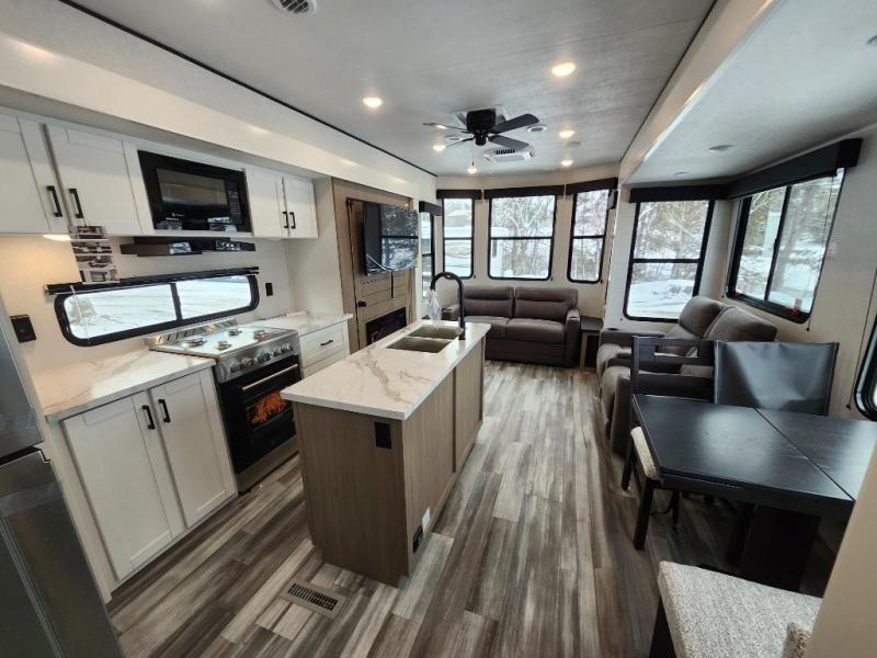 Your crew of four will love extended stays in this triple slide out trailer! Once you've unpacked your bags, you can head to the kitchen to prepare lunch on the cooktop and kitchen island. There is a table and chairs with a bench to dine at, and you can relax on the theater seat after your meal is cleaned up. A front tri-fold sofa will provide more seating space, along with sleeping space for guests. A full bath includes washer and dryer prep if you plan to add these appliances, and the rear private bedroom is sure to make you feel right at home. There is a queen bed slide, a wardrobe, vanity, and large dresser so nothing gets left behind!