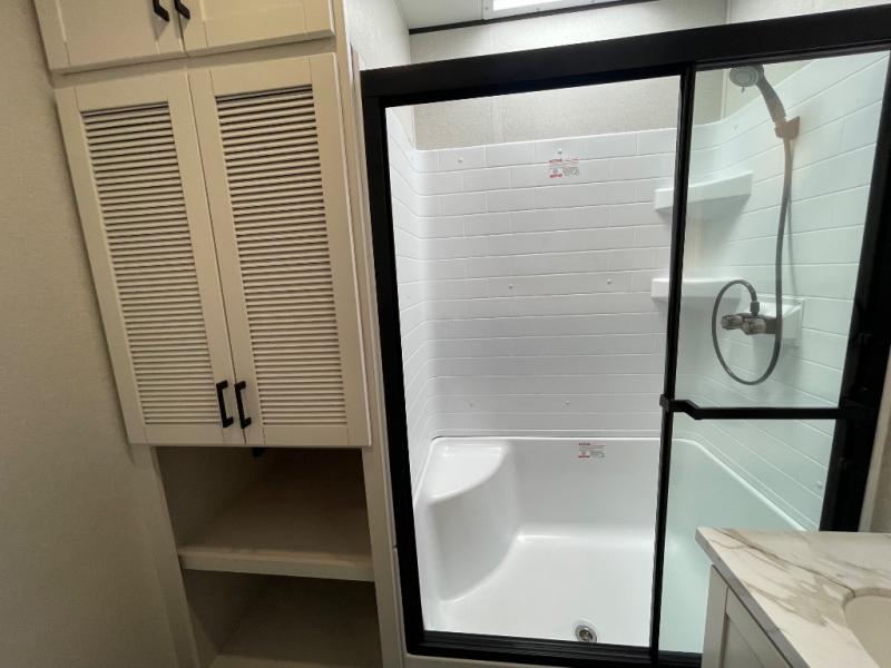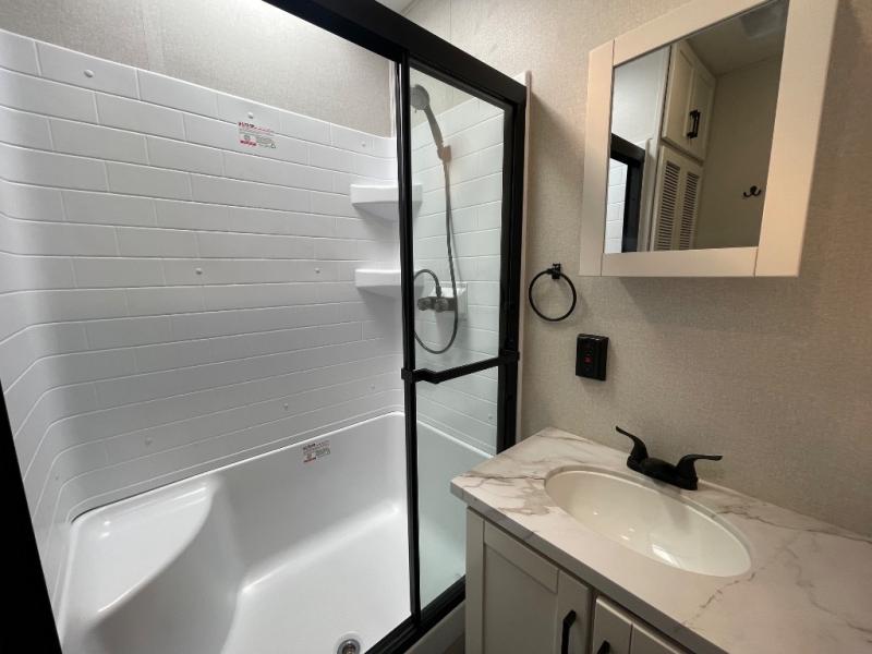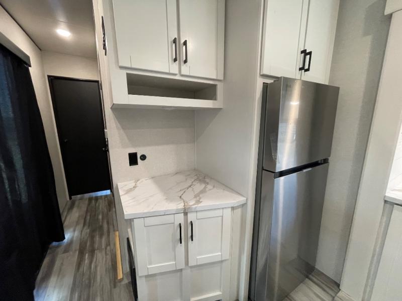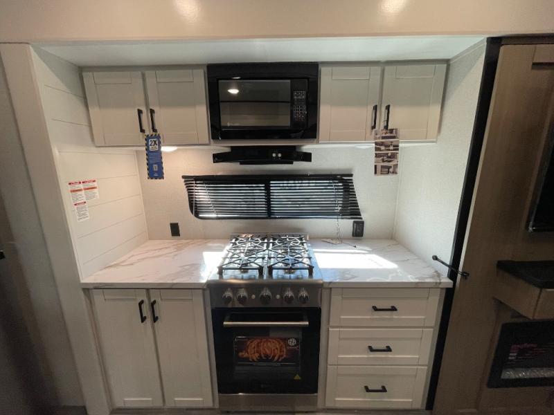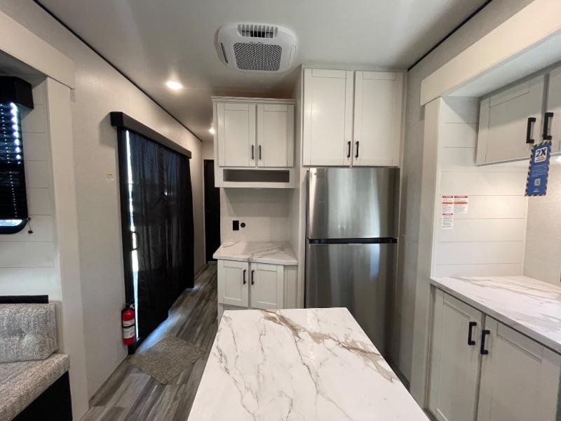 Your crew of four will love extended stays in this triple slide out trailer! Once you've unpacked your bags, you can head to the kitchen to prepare lunch on the cooktop and kitchen island. There is a table and chairs with a bench to dine at, and you can relax on the theater seat after your meal is cleaned up. A front tri-fold sofa will provide more seating space, along with sleeping space for guests. A full bath includes washer and dryer prep if you plan to add these appliances, and the rear private bedroom is sure to make you feel right at home. There is a queen bed slide, a wardrobe, vanity, and large dresser so nothing gets left behind!
