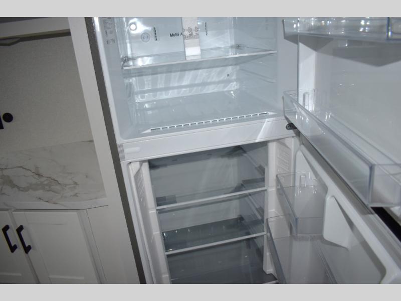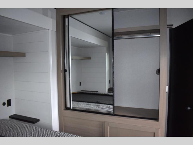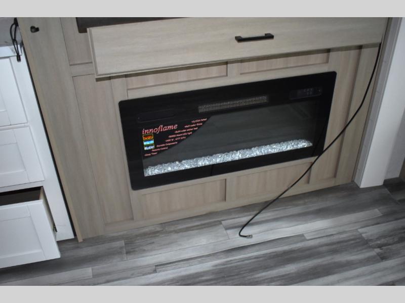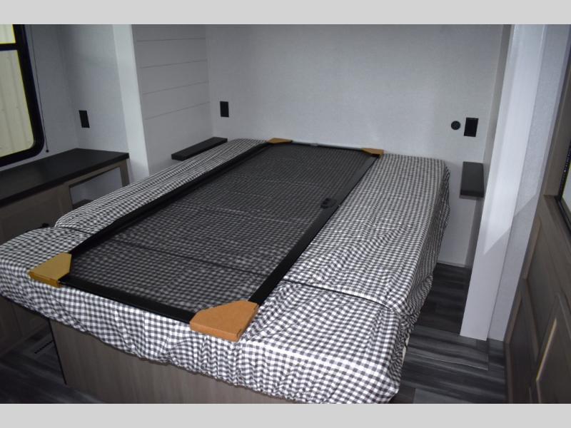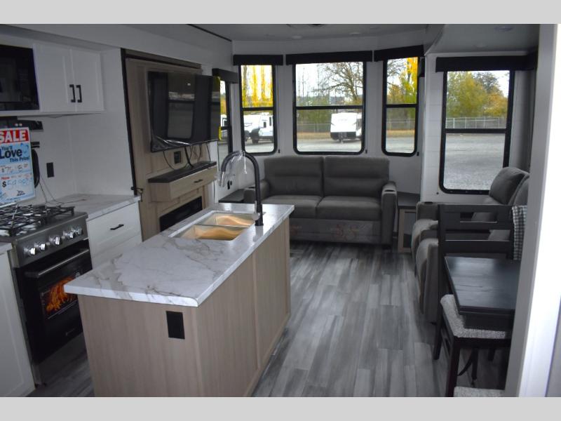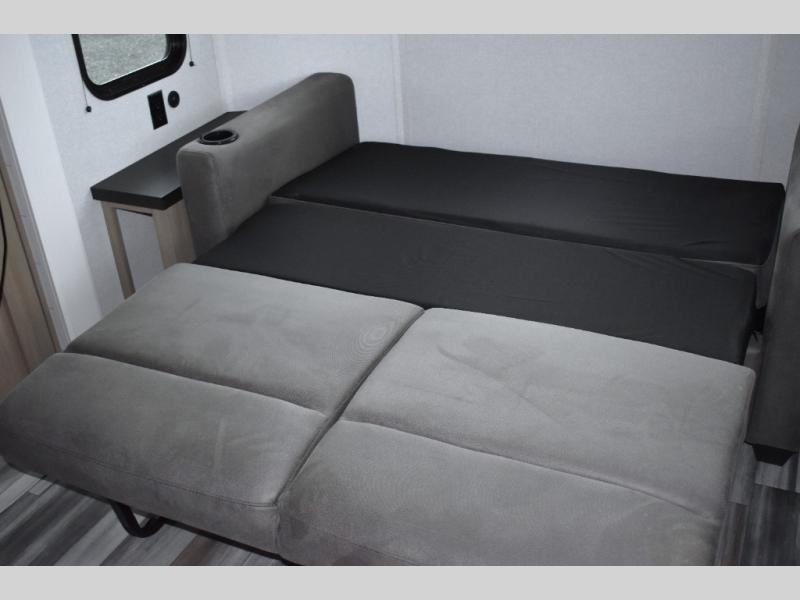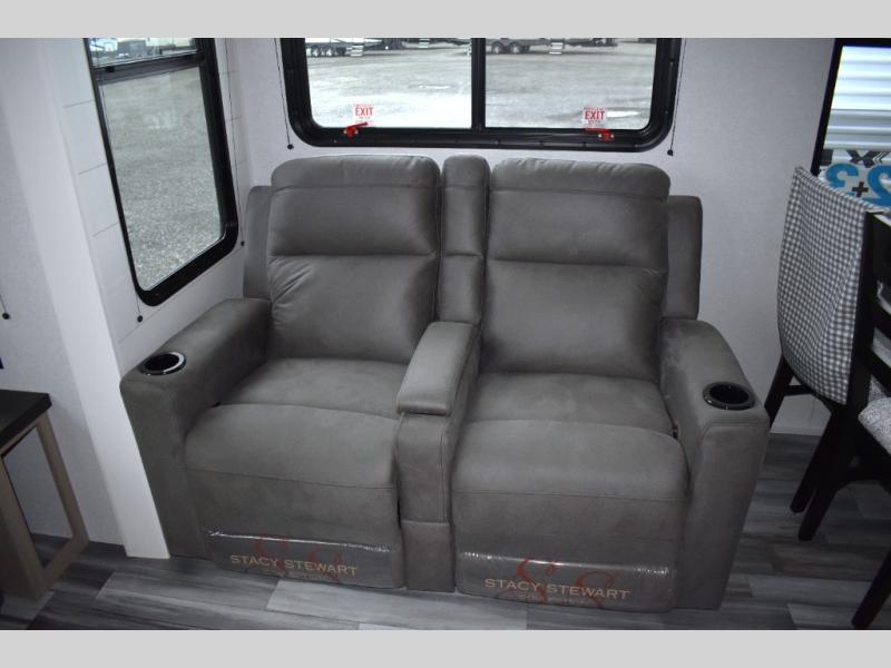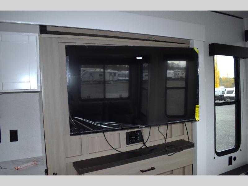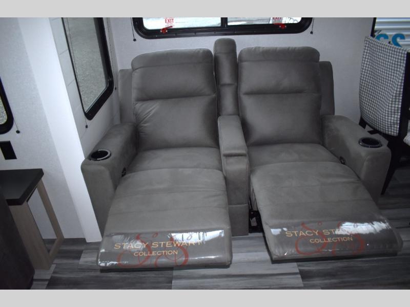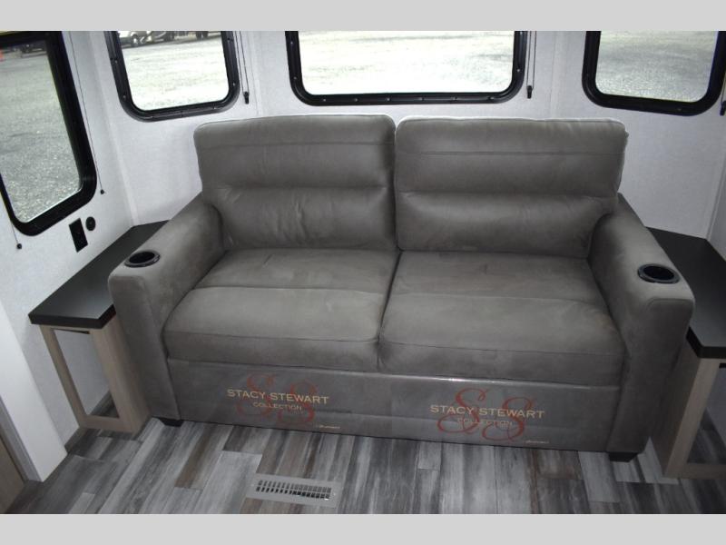 Your crew of four will love extended stays in this triple slide out trailer! Once you've unpacked your bags, you can head to the kitchen to prepare lunch on the cooktop and kitchen island. There is a table and chairs with a bench to dine at, and you can relax on the theater seat after your meal is cleaned up. A front tri-fold sofa will provide more seating space, along with sleeping space for guests. A full bath includes washer and dryer prep if you plan to add these appliances, and the rear private bedroom is sure to make you feel right at home. There is a queen bed slide, a wardrobe, vanity, and large dresser so nothing gets left behind!