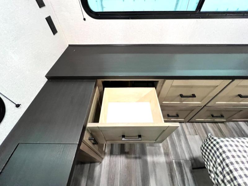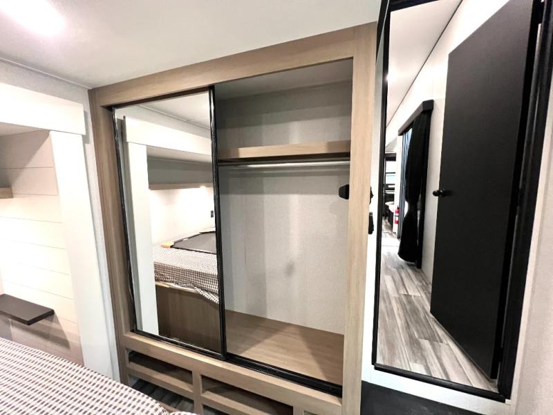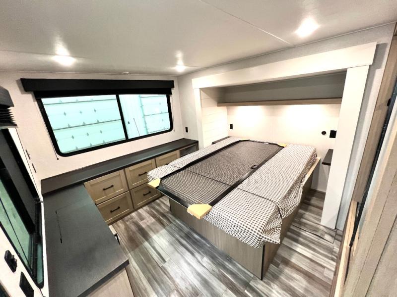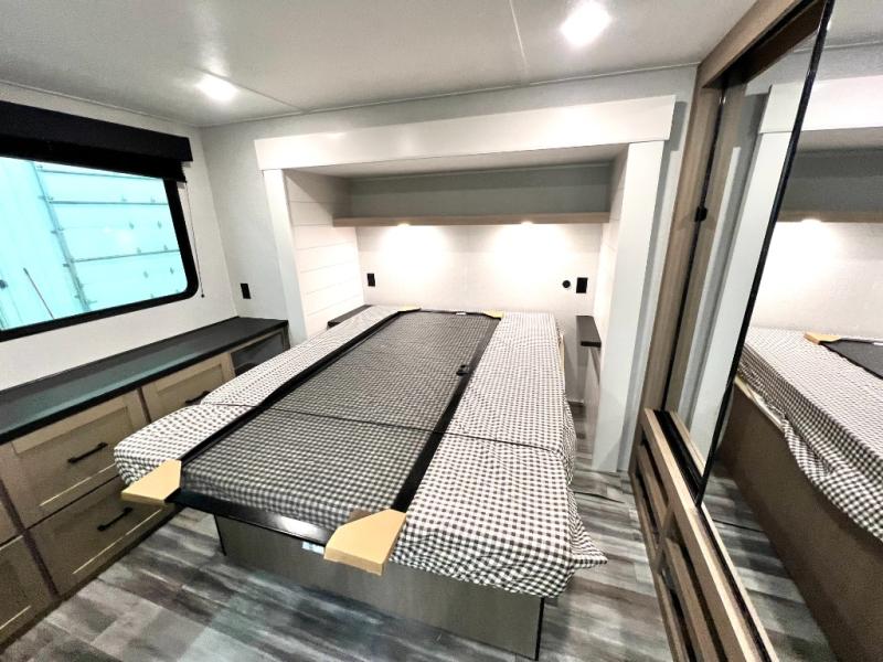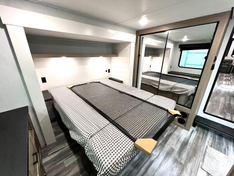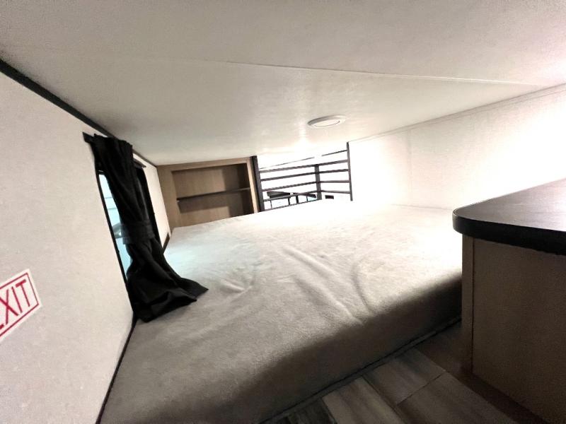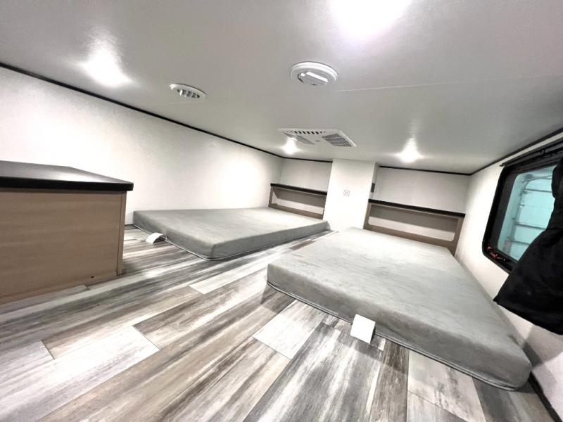 Your crew of four will love extended stays in this triple slide out trailer! This unit has a similar layout to 401FLTS DS, but you'll enjoy the added double loft areas in this Jay Flight Bungalow! There are three bunk mats here, two wardrobes, storage shelves, and TV prep if you plan to add entertainment. Once you've unpacked your bags, you can head to the kitchen to prepare lunch on the cooktop and kitchen island. There is a table and chairs with a bench to dine at, and you can relax on the theater seat after your meal is cleaned up. A front tri-fold sofa will provide more seating space, along with sleeping space for guests. A full bath includes washer and dryer prep if you plan to add these appliances, and the rear private bedroom is sure to make you feel right at home. There is a queen bed slide, a wardrobe, vanity, and large dresser so nothing gets left behind!
