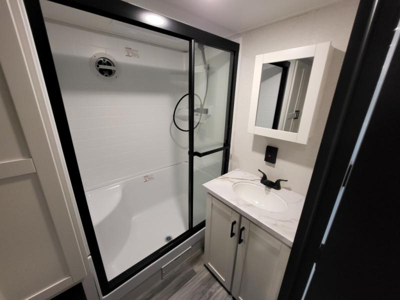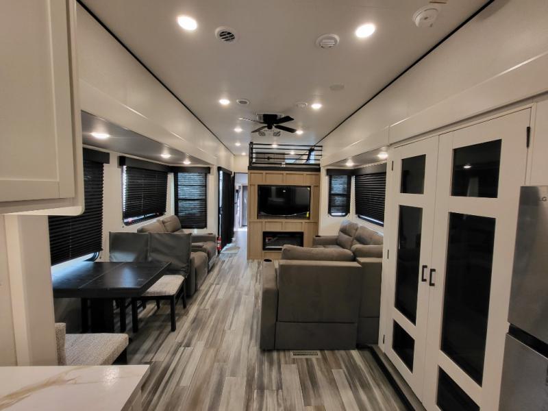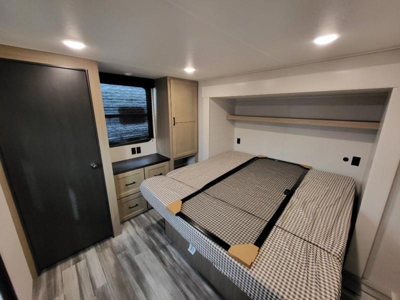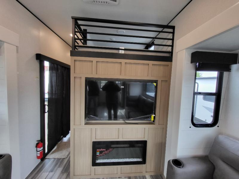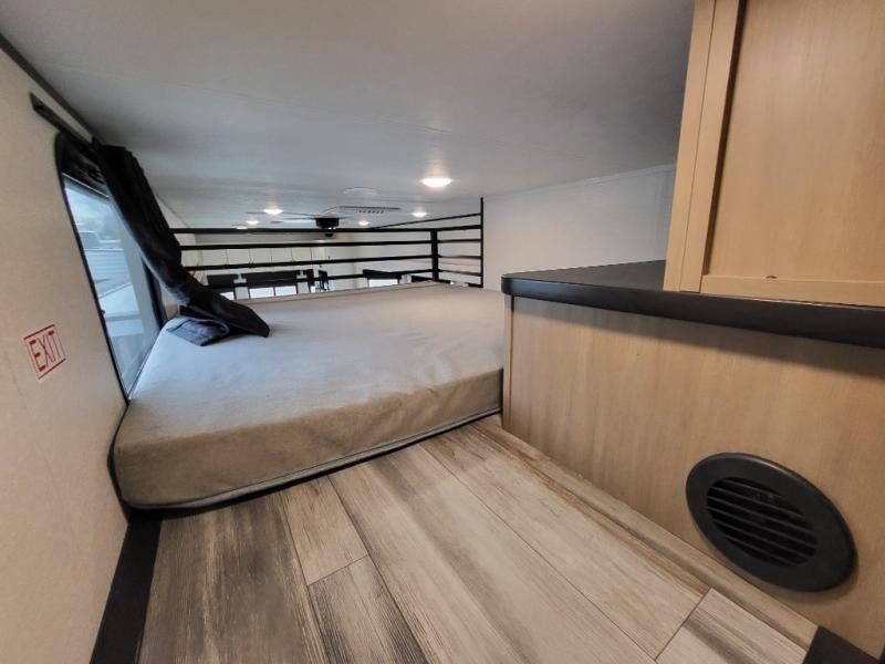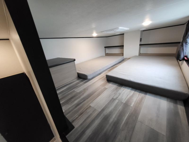 It won't be hard to find comfort in this spacious trailer for eight! The front kitchen features ample counter space to prep meals plus a residential refrigerator and double door pantry for food storage! You can dine at the table and chairs with a bench, then head to the living area to relax on the tri-fold L-lounge with a recliner on rollers. Across from the sliding patio doors, you'll find the spacious full bath, and the steps next to the bath lead to the double loft areas. The little ones will have three bunk mats to sleep on, two loft desks, shelves, and TV prep for added convenience! And don't overlook the spacious rear private bedroom with a queen bed slide, storage space, plus washer and dryer prep if you want the option to make laundry day easier!