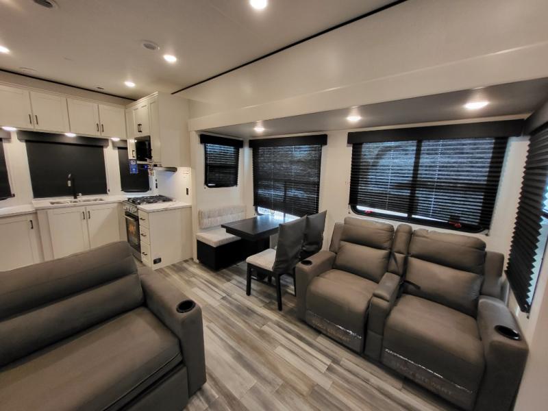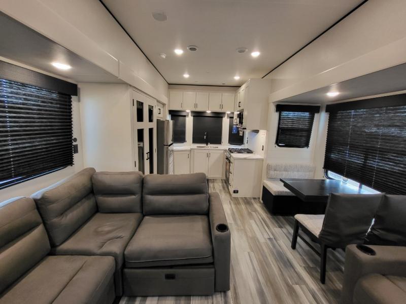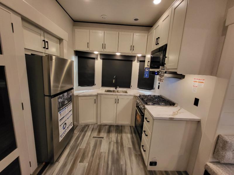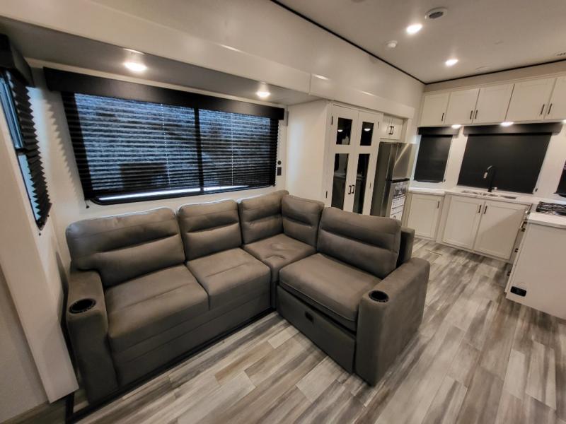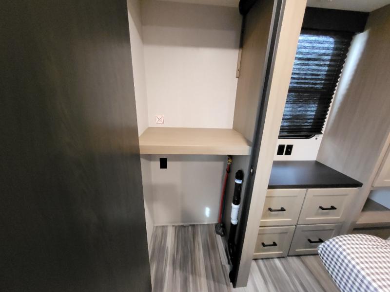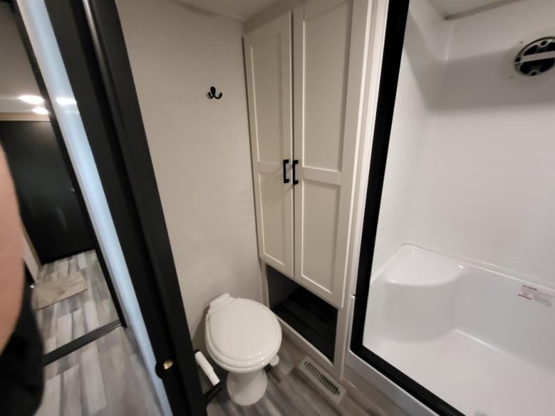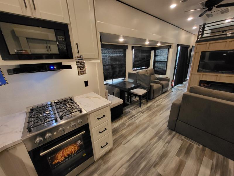 It won't be hard to find comfort in this spacious trailer for eight! The front kitchen features ample counter space to prep meals plus a residential refrigerator and double door pantry for food storage! You can dine at the table and chairs with a bench, then head to the living area to relax on the tri-fold L-lounge with a recliner on rollers. Across from the sliding patio doors, you'll find the spacious full bath, and the steps next to the bath lead to the double loft areas. The little ones will have three bunk mats to sleep on, two loft desks, shelves, and TV prep for added convenience! And don't overlook the spacious rear private bedroom with a queen bed slide, storage space, plus washer and dryer prep if you want the option to make laundry day easier!
