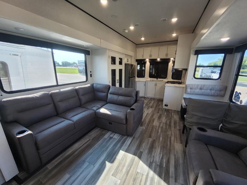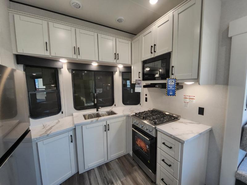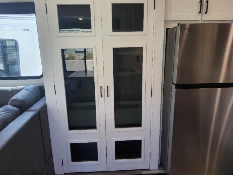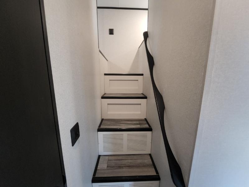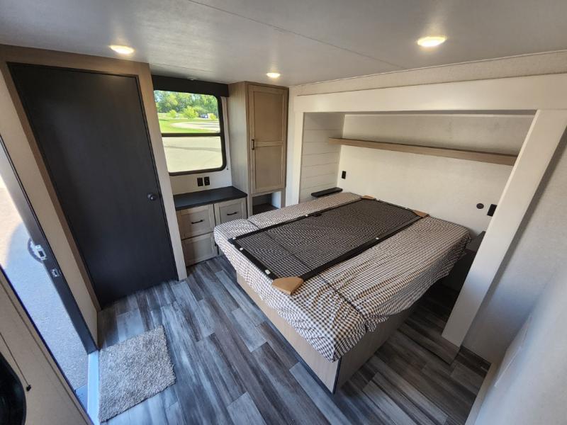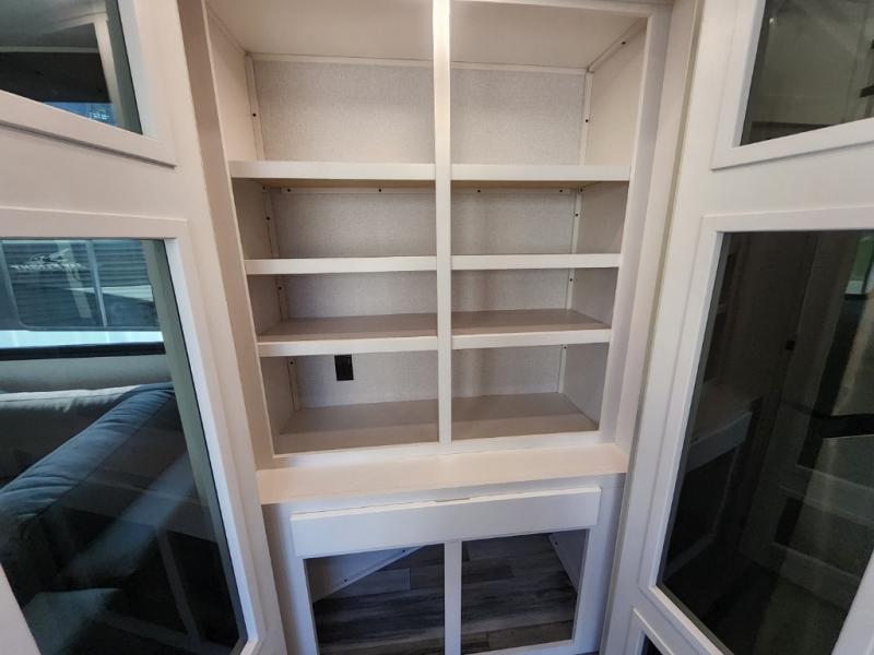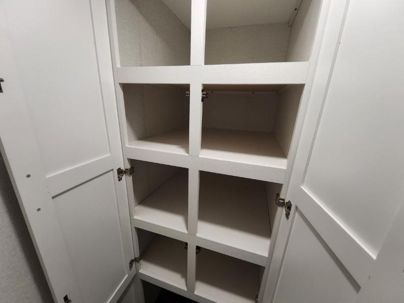It won't be hard to find comfort in this spacious trailer for eight! The front kitchen features ample counter space to prep meals plus a residential refrigerator and double door pantry for food storage! You can dine at the table and chairs with a bench, then head to the living area to relax on the tri-fold L-lounge with a recliner on rollers. Across from the sliding patio doors, you'll find the spacious full bath, and the steps next to the bath lead to the double loft areas. The little ones will have three bunk mats to sleep on, two loft desks, shelves, and TV prep for added convenience! And don't overlook the spacious rear private bedroom with a queen bed slide, storage space, plus washer and dryer prep if you want the option to make laundry day easier!