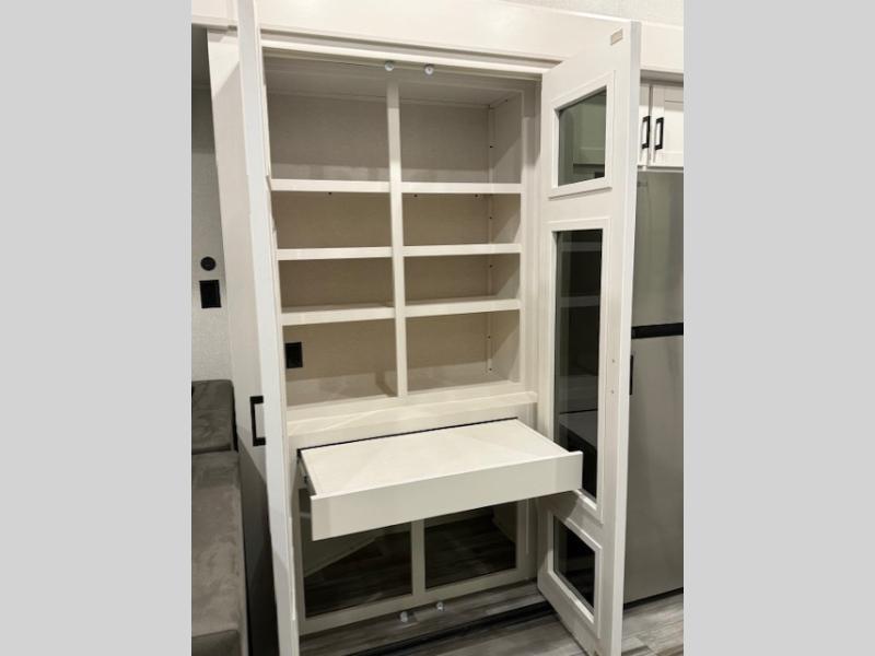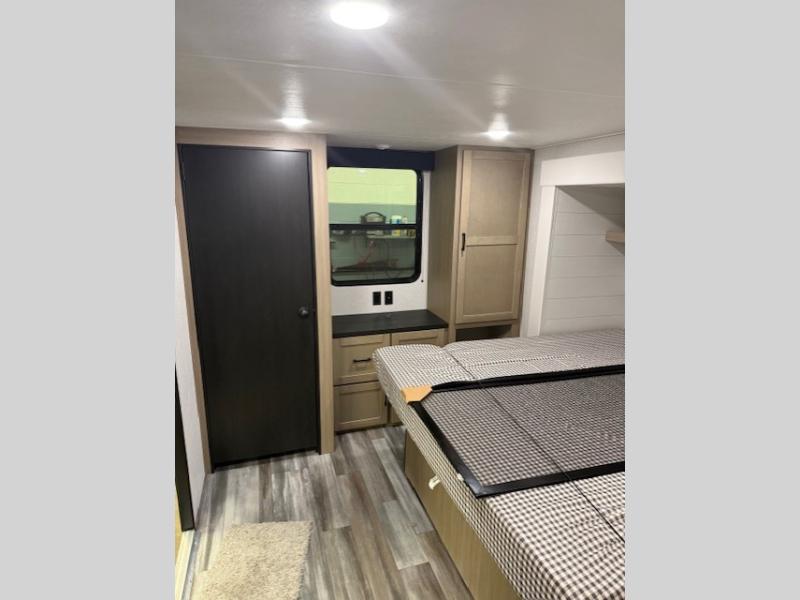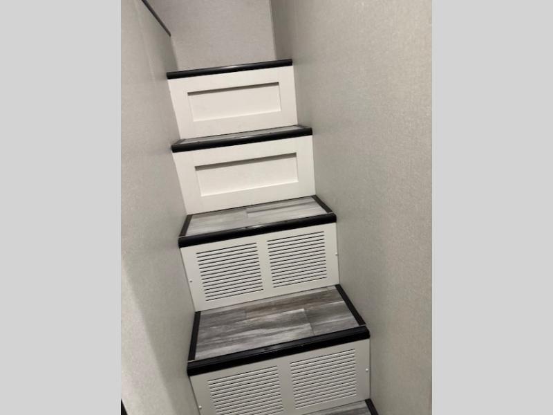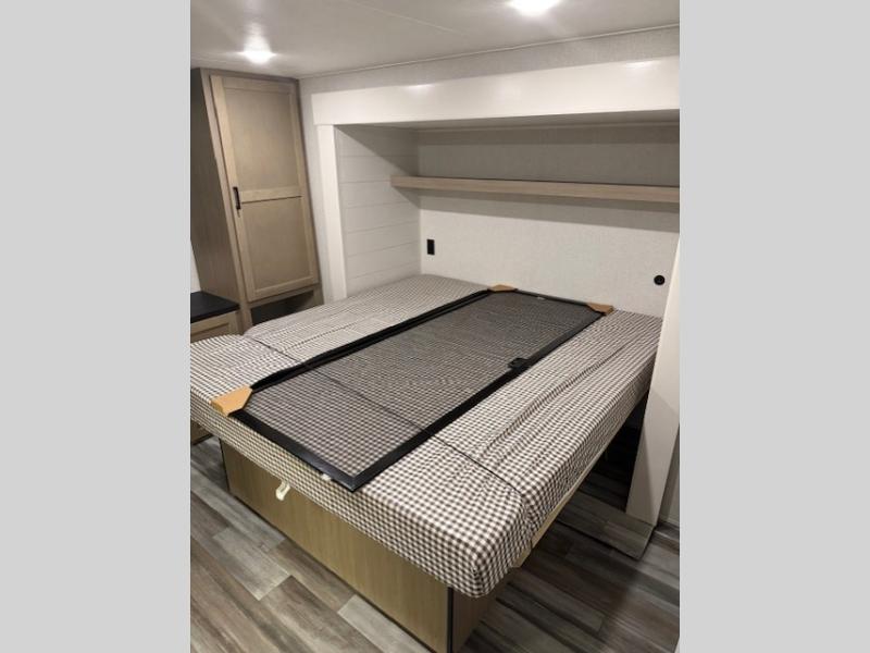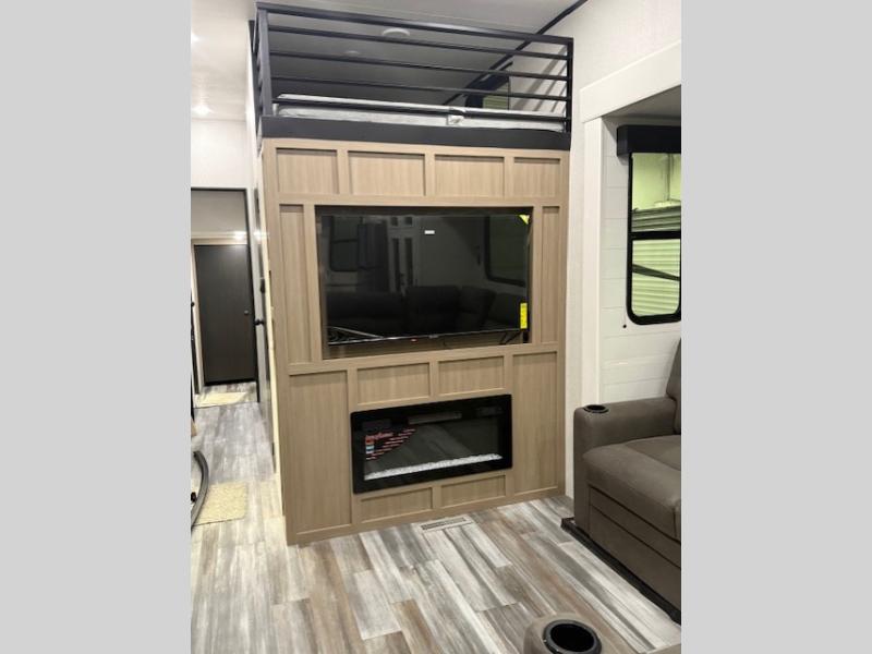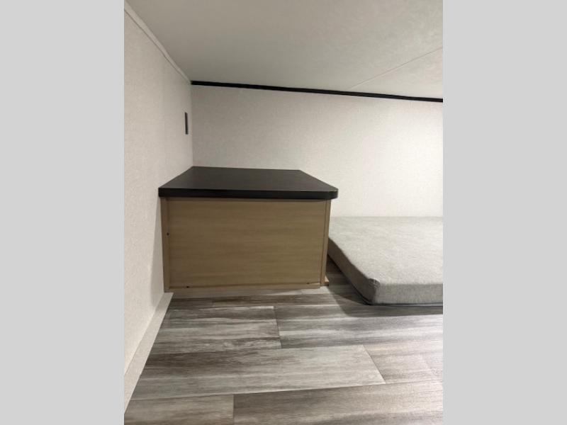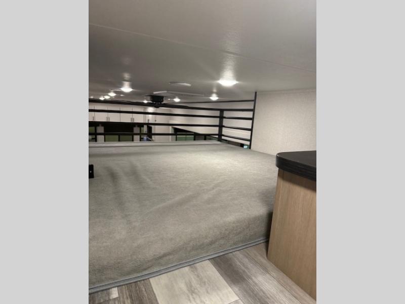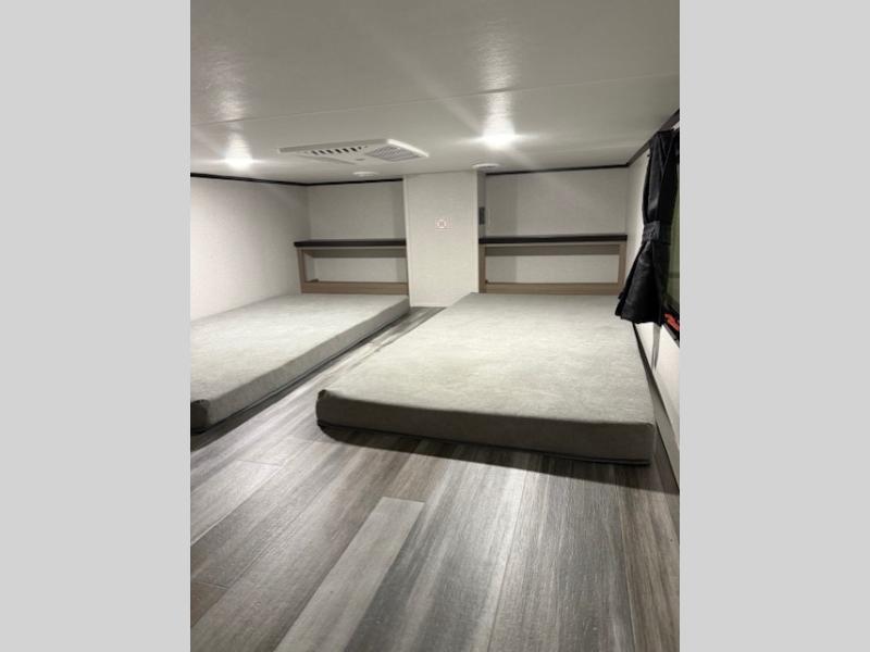 It won't be hard to find comfort in this spacious trailer for eight! The front kitchen features ample counter space to prep meals plus a residential refrigerator and double door pantry for food storage! You can dine at the table and chairs with a bench, then head to the living area to relax on the tri-fold L-lounge with a recliner on rollers. Across from the sliding patio doors, you'll find the spacious full bath, and the steps next to the bath lead to the double loft areas. The little ones will have three bunk mats to sleep on, two loft desks, shelves, and TV prep for added convenience! And don't overlook the spacious rear private bedroom with a queen bed slide, storage space, plus washer and dryer prep if you want the option to make laundry day easier!