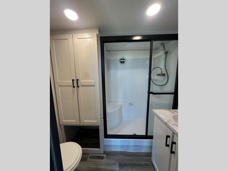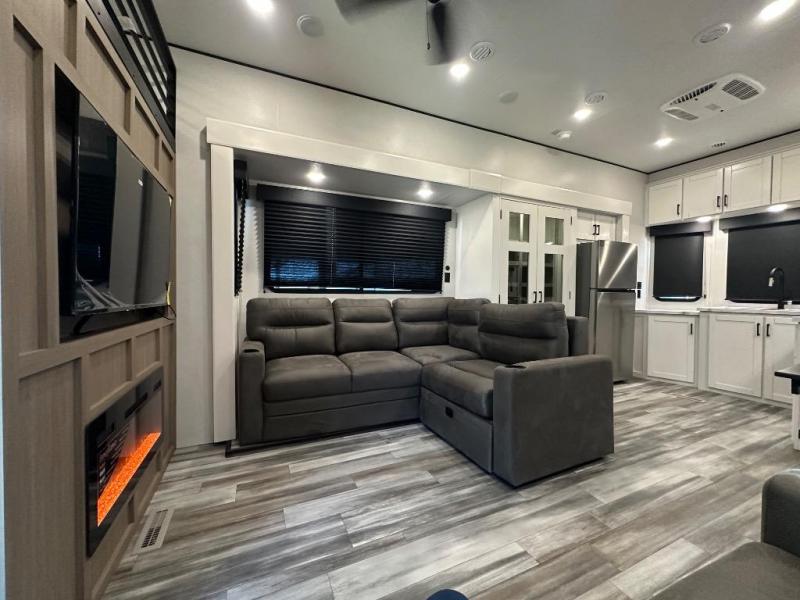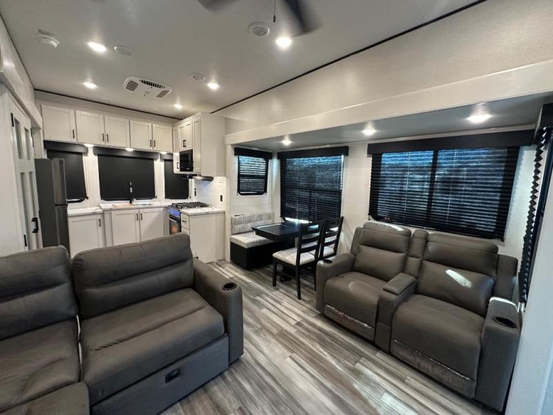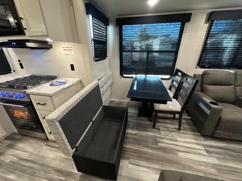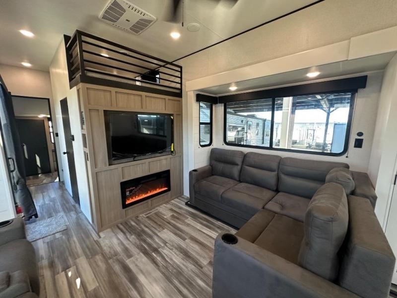 It won't be hard to find comfort in this spacious trailer for eight! The front kitchen features ample counter space to prep meals plus a residential refrigerator and double door pantry for food storage! You can dine at the table and chairs with a bench, then head to the living area to relax on the tri-fold L-lounge with a recliner on rollers. Across from the sliding patio doors, you'll find the spacious full bath, and the steps next to the bath lead to the double loft areas. The little ones will have three bunk mats to sleep on, two loft desks, shelves, and TV prep for added convenience! And don't overlook the spacious rear private bedroom with a queen bed slide, storage space, plus washer and dryer prep if you want the option to make laundry day easier!