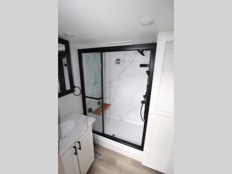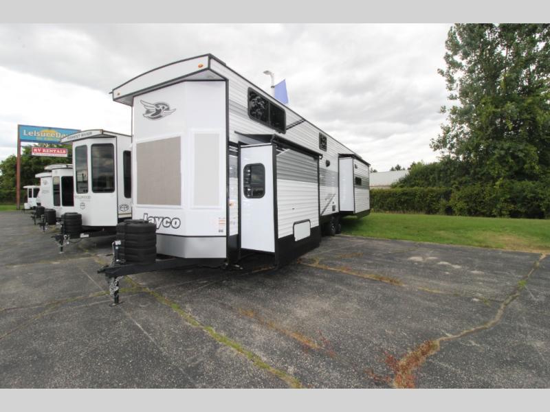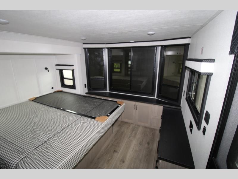 Each Jay Flight Bungalow travel trailer by Jayco features a Magnum Truss roof system, an 8' 6" wide-body construction, and an insulated and enclosed underbelly for added protection against the elements. You will love the open living space and the atrium-style front wall, along with oversized side windows and hardwood look vinyl flooring. A central vacuum with a push button retract makes cleaning and hose storage easier than ever, and the four burner Insignia gas range and 30" microwave will complete the chef's dream kitchen. These travel trailers also include an AM/FM/Bluetooth stereo and marine grade exterior speakers, a power awning with an LED light, an outside shower, plus many more exterior conveniences!
