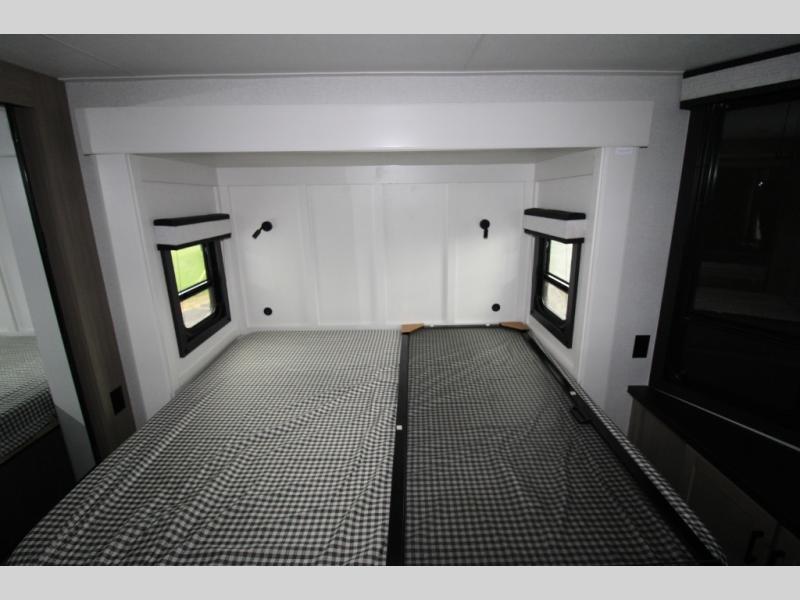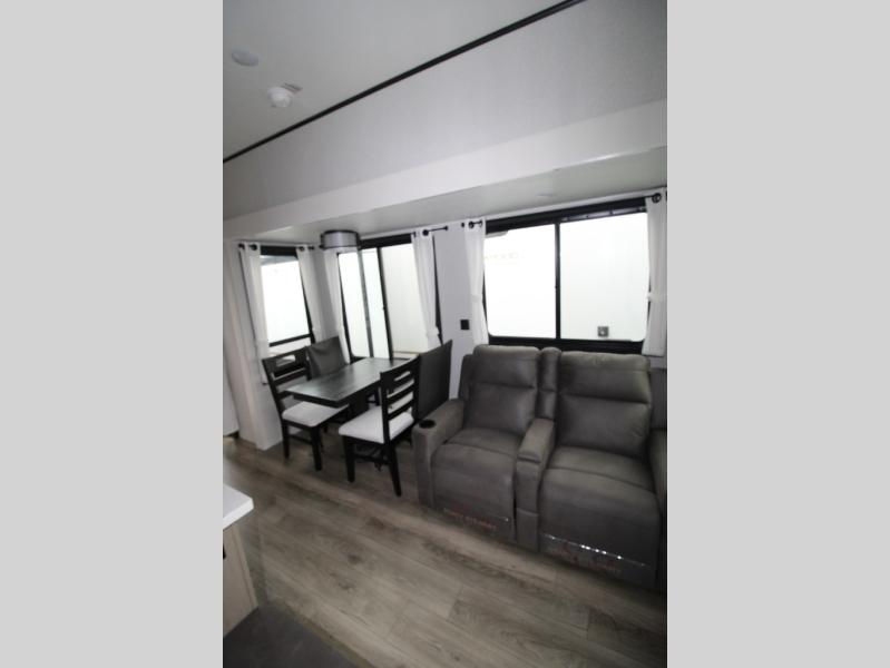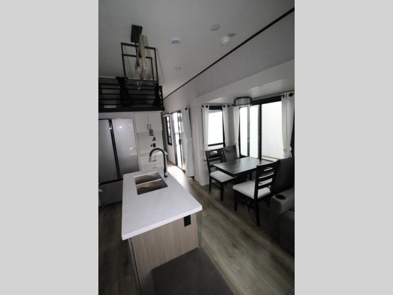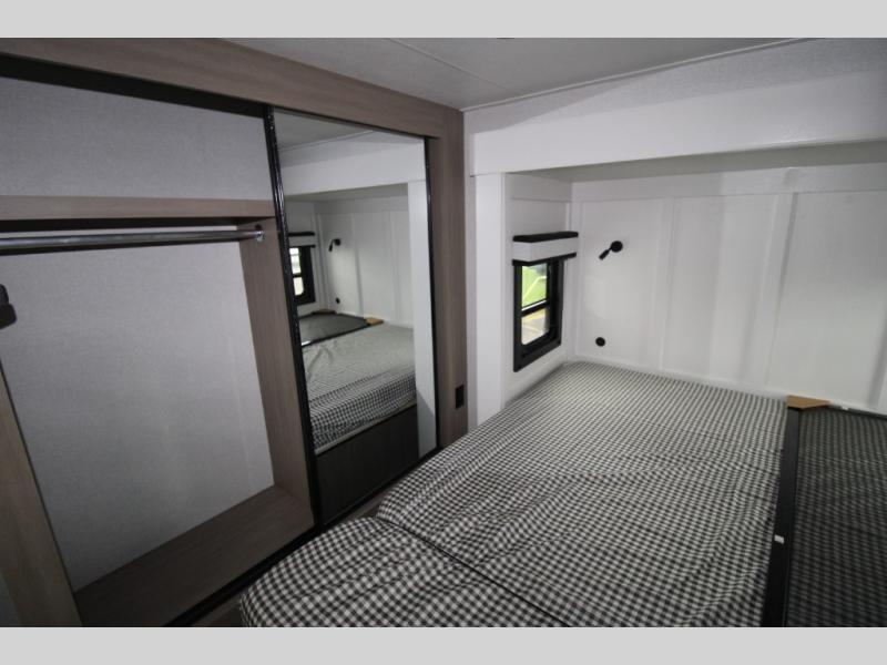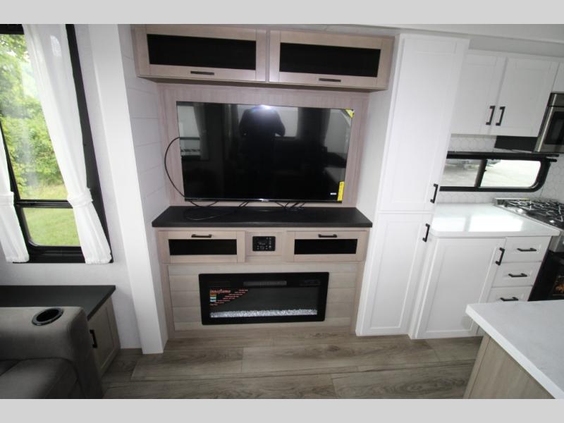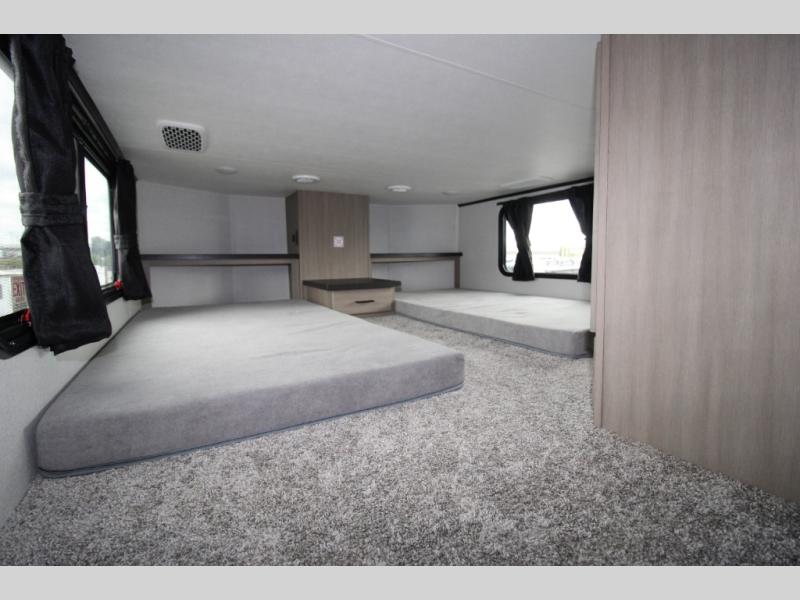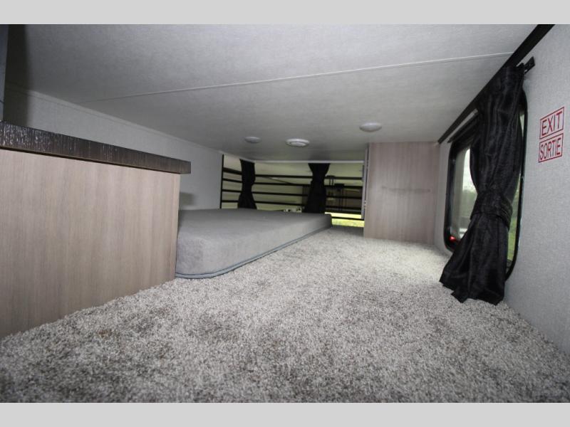 Wherever you choose you camp, you'll be camping in comfort with this travel trailer. There are dual opposing slides in the main living area, allowing everyone space to stretch out, and the cook will love having more space at the kitchen island. After dinner is cleaned up you can relax on the theater seat across from the TV and fireplace, or you can play a game at the free-standing table and chairs. The little ones are sure to head up to the double loft area to play or rest. Here, you'll find three bunk mats, two wardrobes, and shelves for plenty of storage space. The front private bedroom incudes a cozy queen bed, plus a dresser, wardrobe, and storage cabinets for all your belongings. You can even choose the king bed option in place of the queen bed if you want more space to stretch out!