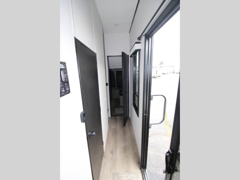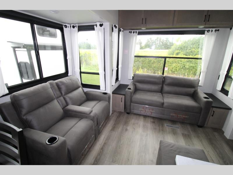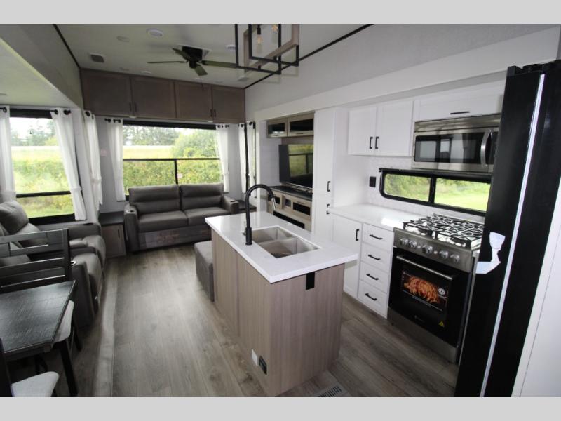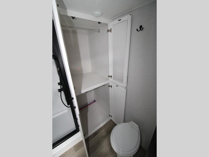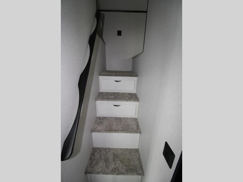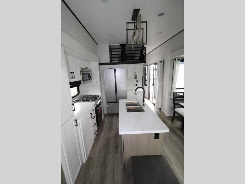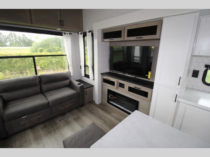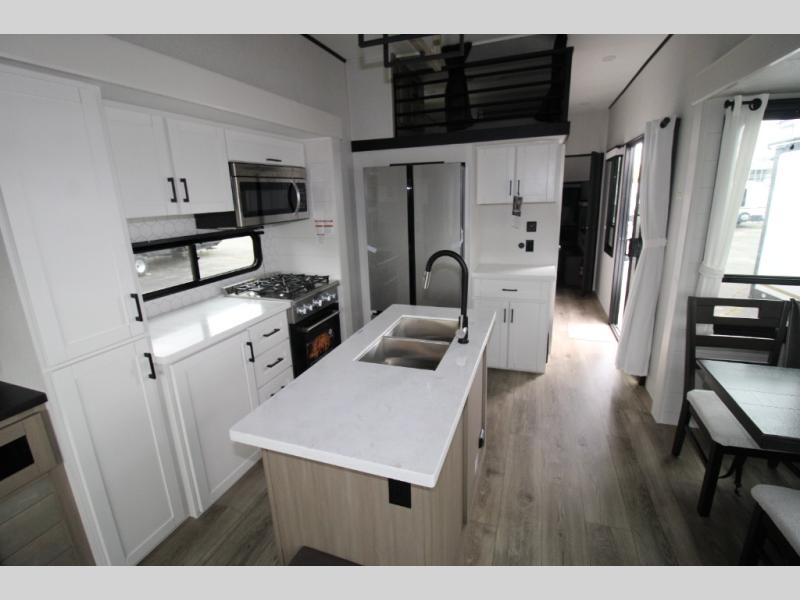 Wherever you choose you camp, you'll be camping in comfort with this travel trailer. There are dual opposing slides in the main living area, allowing everyone space to stretch out, and the cook will love having more space at the kitchen island. After dinner is cleaned up you can relax on the theater seat across from the TV and fireplace, or you can play a game at the free-standing table and chairs. The little ones are sure to head up to the double loft area to play or rest. Here, you'll find three bunk mats, two wardrobes, and shelves for plenty of storage space. The front private bedroom incudes a cozy queen bed, plus a dresser, wardrobe, and storage cabinets for all your belongings. You can even choose the king bed option in place of the queen bed if you want more space to stretch out!