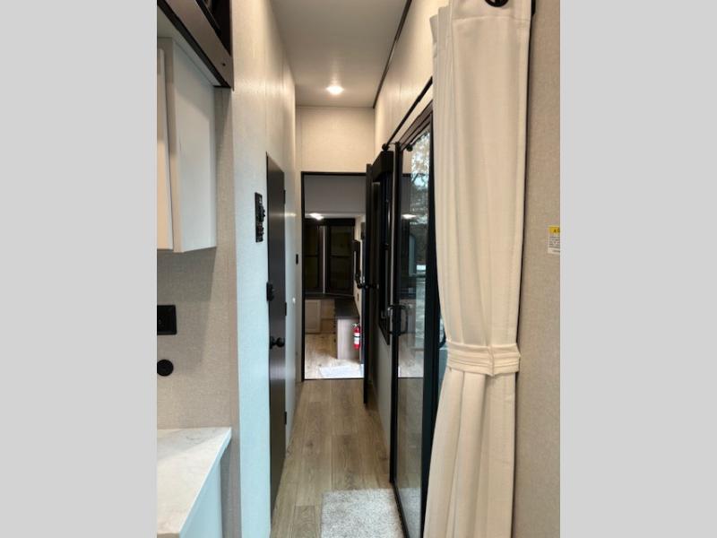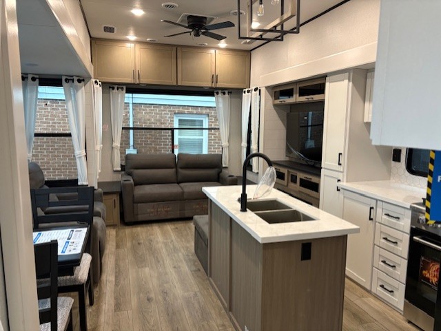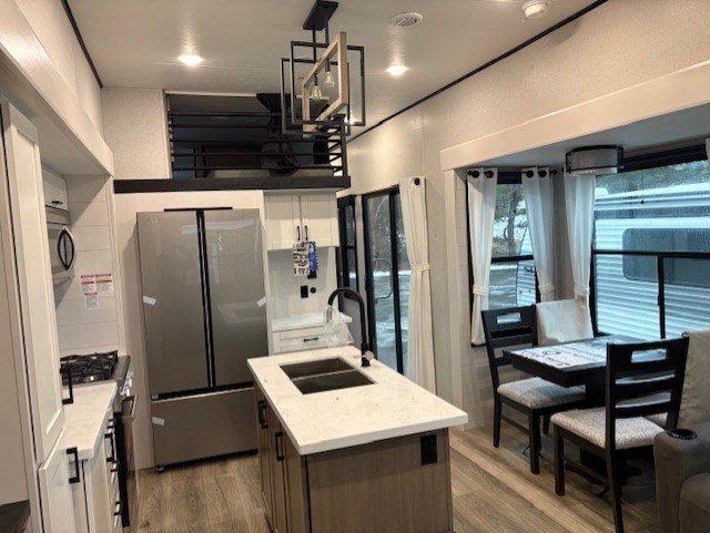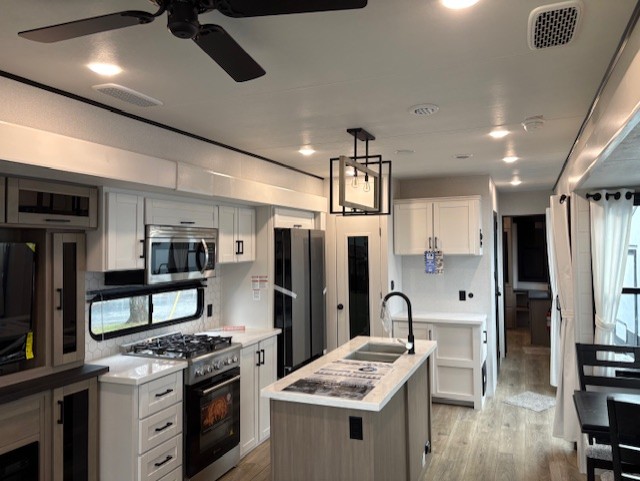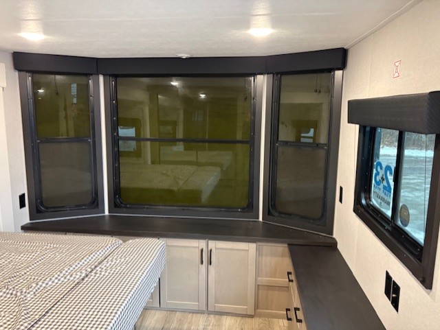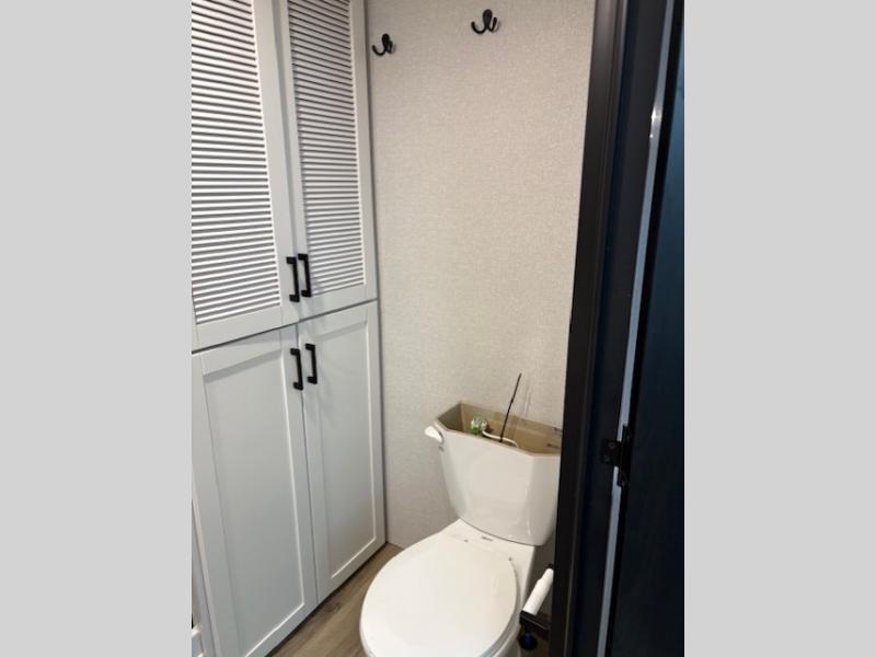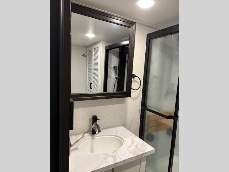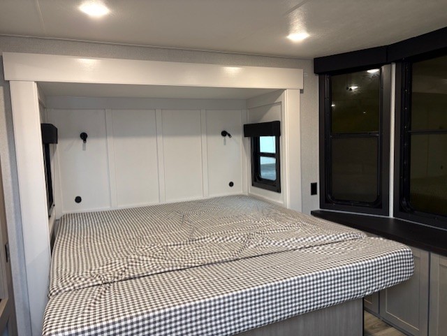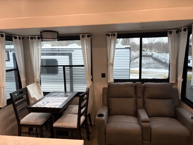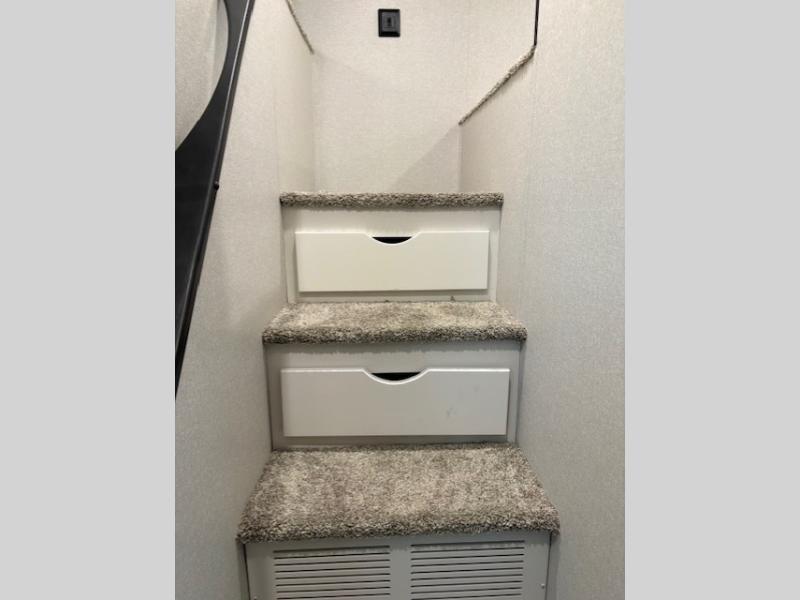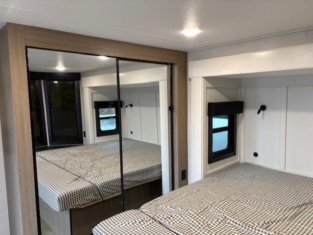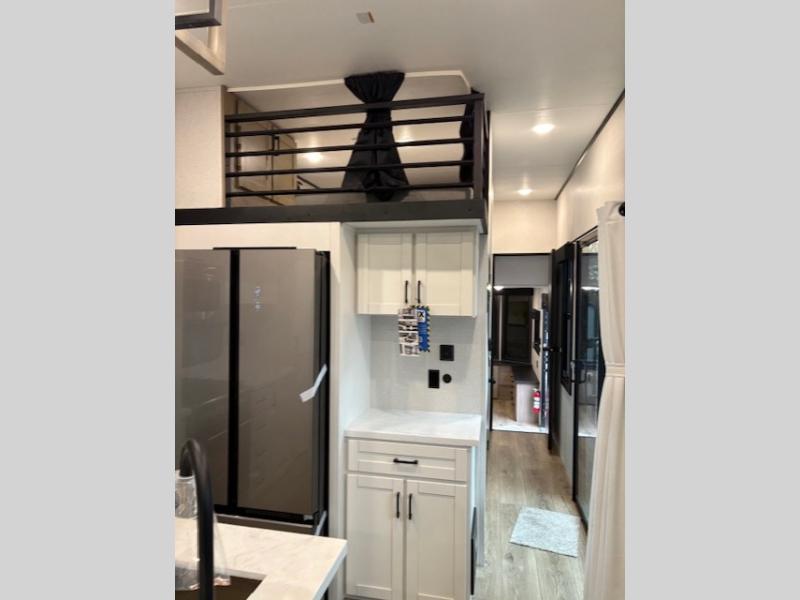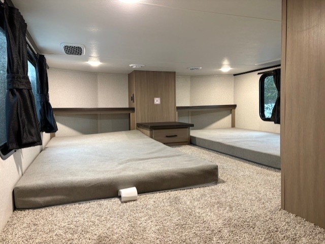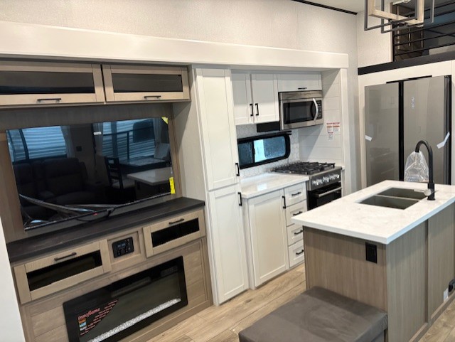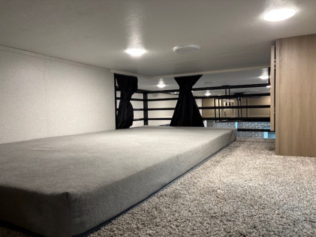 Wherever you choose you camp, you'll be camping in comfort with this travel trailer. There are dual opposing slides in the main living area, allowing everyone space to stretch out, and the cook will love having more space at the kitchen island. After dinner is cleaned up you can relax on the theater seat across from the TV and fireplace, or you can play a game at the free-standing table and chairs. The little ones are sure to head up to the double loft area to play or rest. Here, you'll find three bunk mats, two wardrobes, and shelves for plenty of storage space. The front private bedroom incudes a cozy queen bed, plus a dresser, wardrobe, and storage cabinets for all your belongings. You can even choose the king bed option in place of the queen bed if you want more space to stretch out!