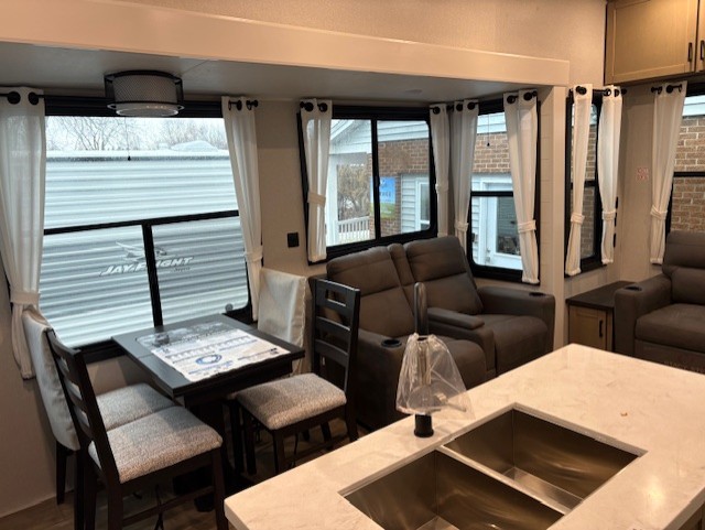 Each Jay Flight Bungalow travel trailer by Jayco features a Magnum Truss roof system, 12 in. I-Class cambered structural steel I-beams, and an insulated and enclosed underbelly for added protection against the elements. You will love the open living space and the atrium-style front wall, along with oversized side windows and hardwood look vinyl flooring. An on-demand tankless water heater will provide endless hot showers, and you're sure to stay comfortable with two A/C units. These travel trailers also include an AM/FM/Bluetooth stereo and marine grade exterior speakers, a power awning with an LED light, an outside shower, plus many more exterior conveniences!