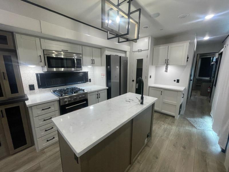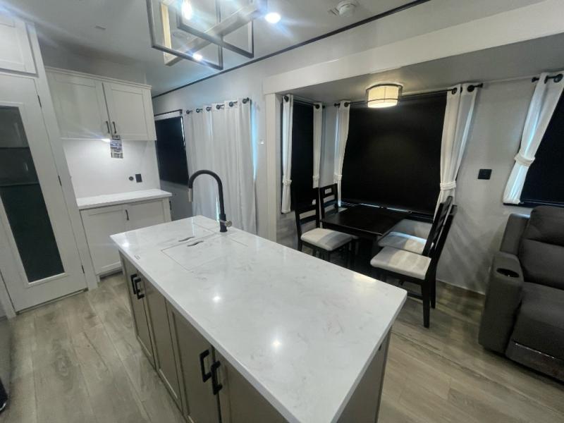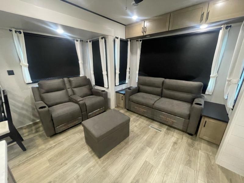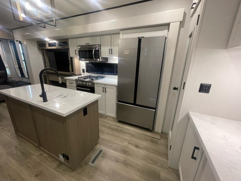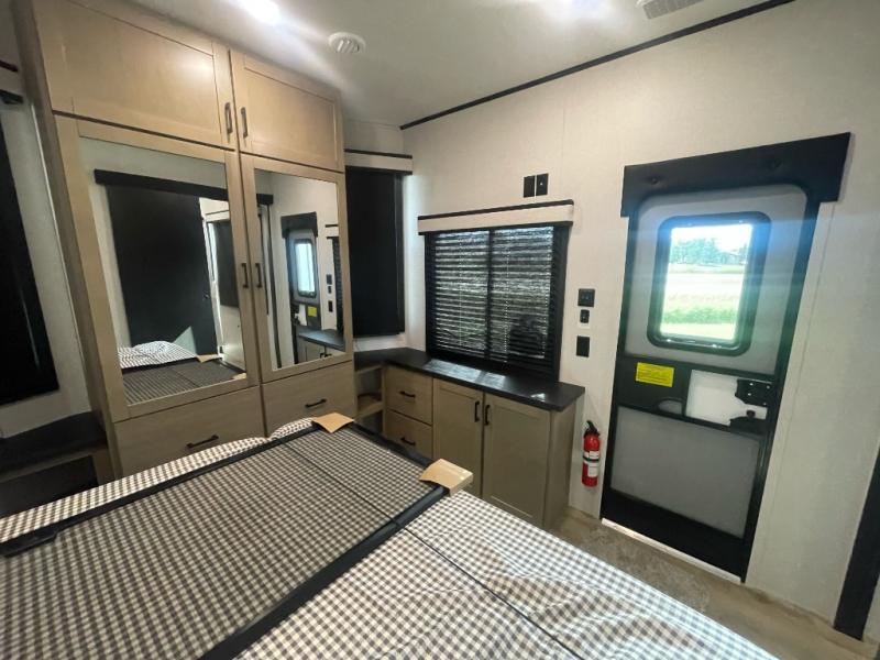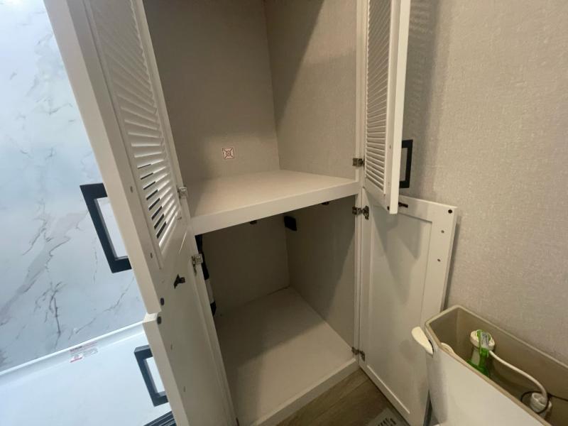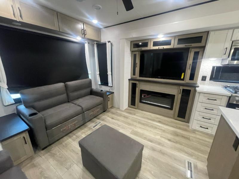 Extended stays are made easy in this travel trailer for four. You will love having your own bedroom up front with a queen bed slide, a wardrobe, plus two chests for your things, and your guests can sleep on the tri-fold sofa in the rear living area. A ceiling fan will keep the air moving while the chef makes eggs and bacon in the morning, and you all can dine at the free-standing table with chairs. Spend your day outdoors hiking, biking, or swimming, and the full bath will allow you to clean up after your adventures. You may want to make it a movie night since there is an entertainment center with a TV, or you can just relax by the fireplace and visit!