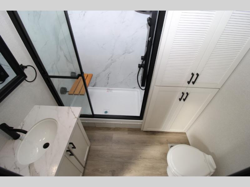 Extended stays are made easy in this travel trailer for four. You will love having your own bedroom up front with a queen bed slide, a wardrobe, plus two chests for your things, and your guests can sleep on the tri-fold sofa in the rear living area. A ceiling fan will keep the air moving while the chef makes eggs and bacon in the morning, and you all can dine at the free-standing table with chairs. Spend your day outdoors hiking, biking, or swimming, and the full bath will allow you to clean up after your adventures. You may want to make it a movie night since there is an entertainment center with a TV, or you can just relax by the fireplace and visit!
