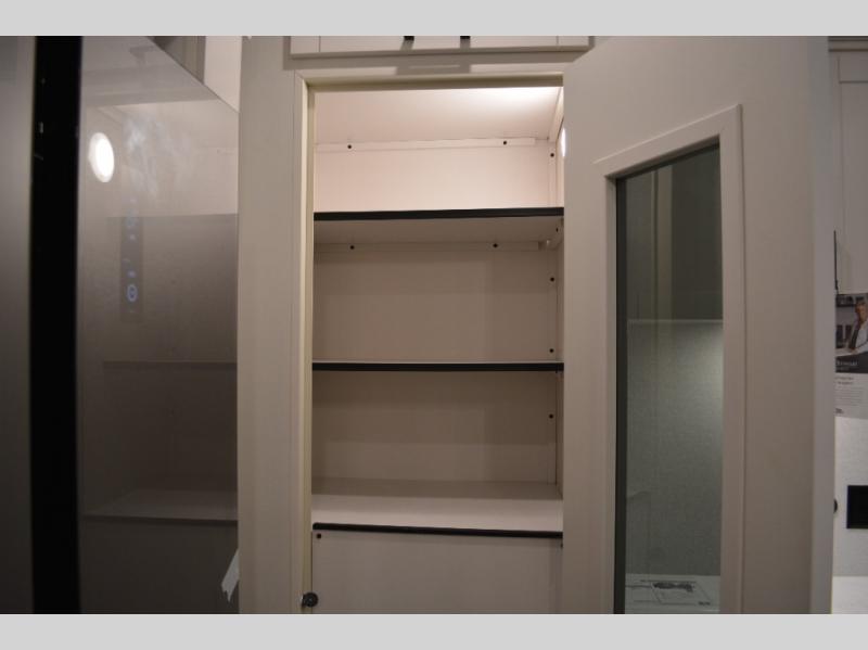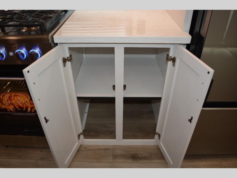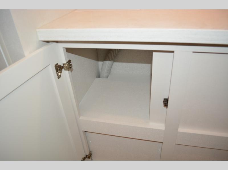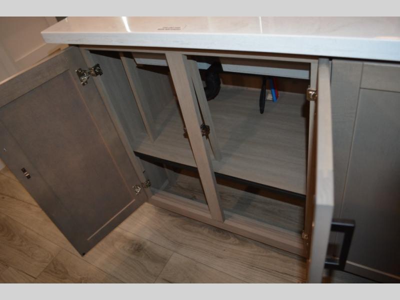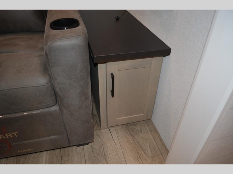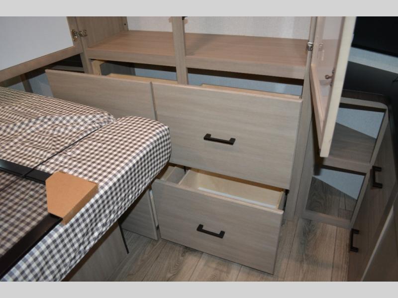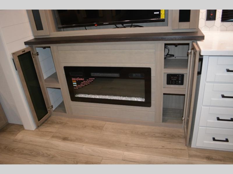 Extended stays are made easy in this travel trailer for four. You will love having your own bedroom up front with a queen bed slide, a wardrobe, plus two chests for your things, and your guests can sleep on the tri-fold sofa in the rear living area. A ceiling fan will keep the air moving while the chef makes eggs and bacon in the morning, and you all can dine at the free-standing table with chairs. Spend your day outdoors hiking, biking, or swimming, and the full bath will allow you to clean up after your adventures. You may want to make it a movie night since there is an entertainment center with a TV, or you can just relax by the fireplace and visit!