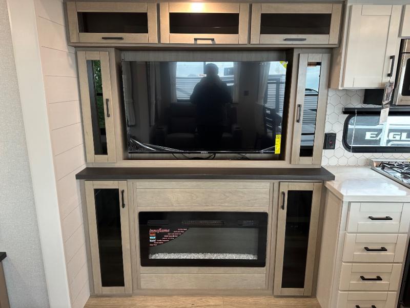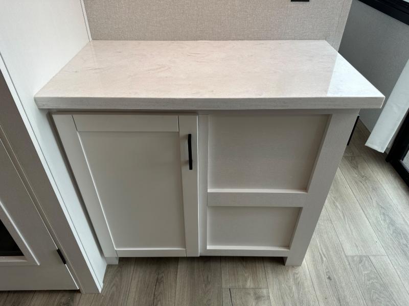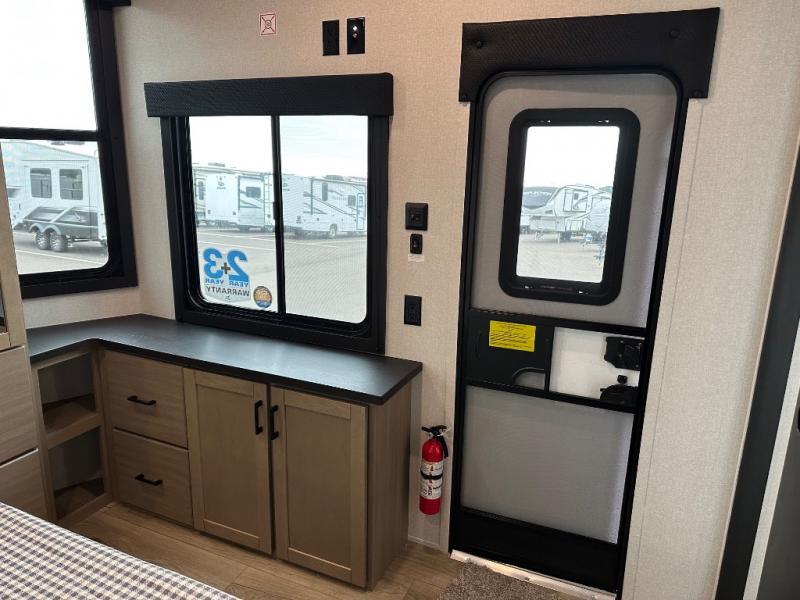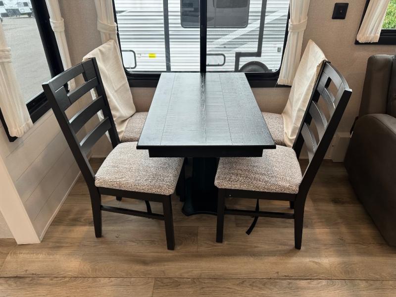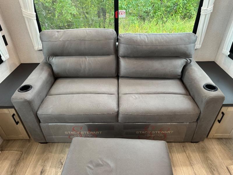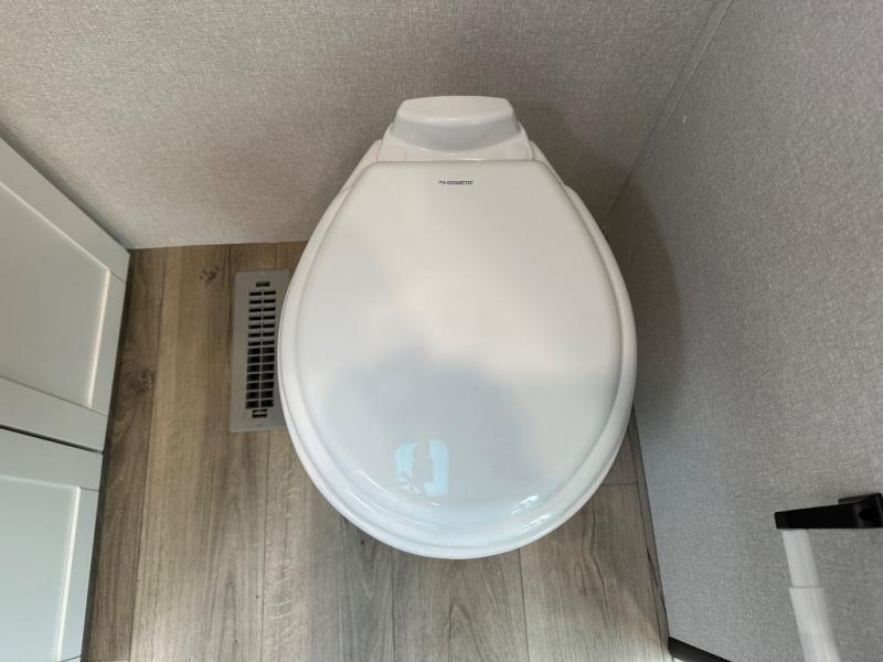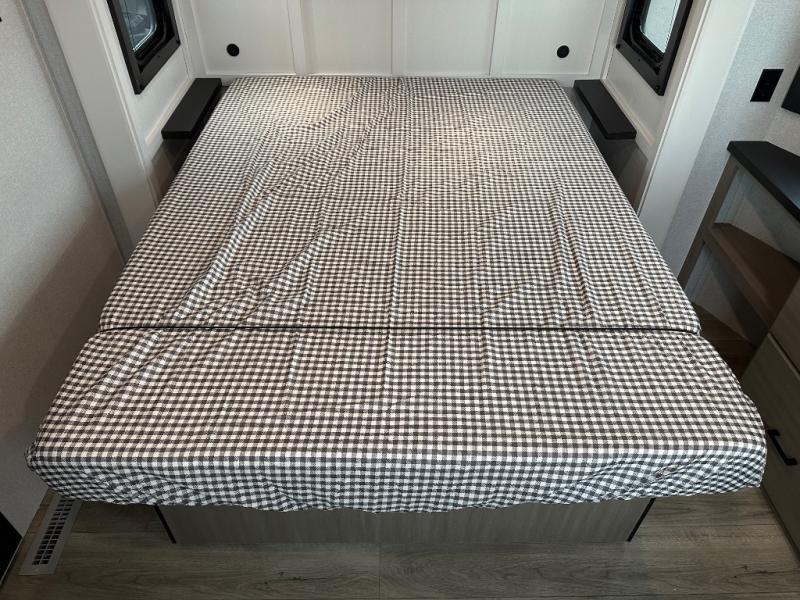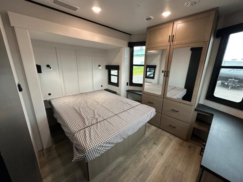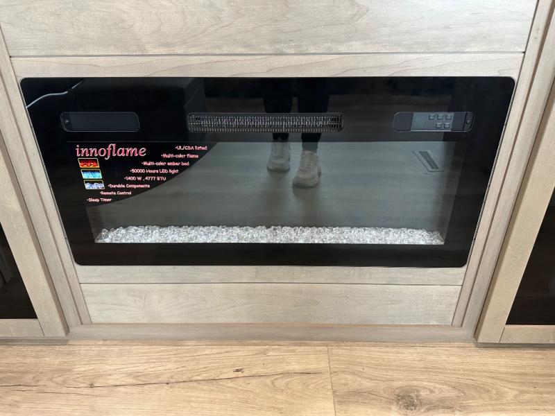 Extended stays are made easy in this travel trailer for four. You will love having your own bedroom up front with a queen bed slide, a wardrobe, plus two chests for your things, and your guests can sleep on the tri-fold sofa in the rear living area. A ceiling fan will keep the air moving while the chef makes eggs and bacon in the morning, and you all can dine at the free-standing table with chairs. Spend your day outdoors hiking, biking, or swimming, and the full bath will allow you to clean up after your adventures. You may want to make it a movie night since there is an entertainment center with a TV, or you can just relax by the fireplace and visit!