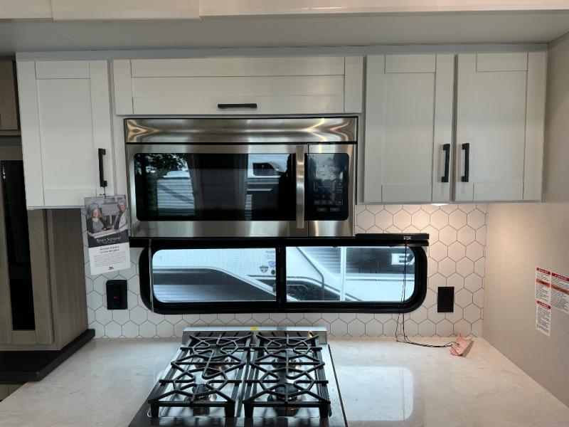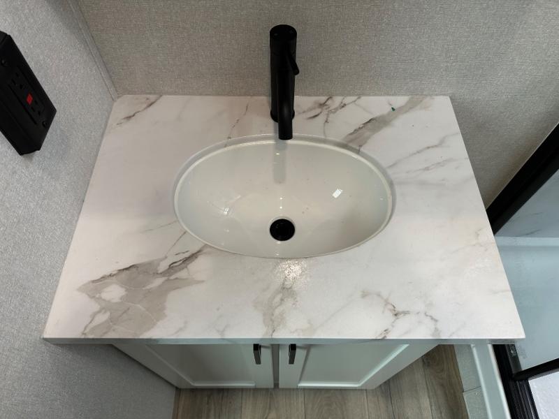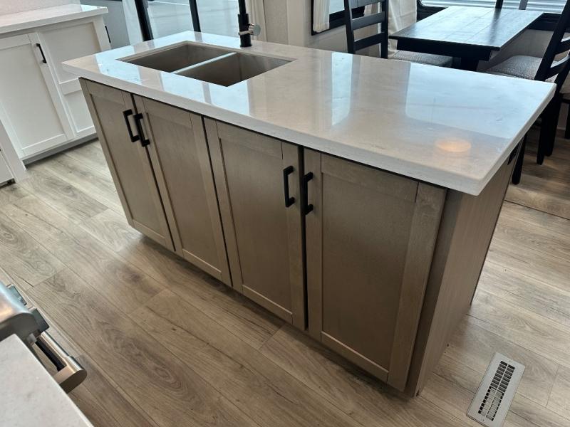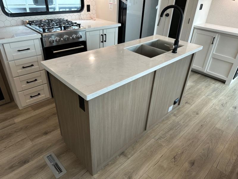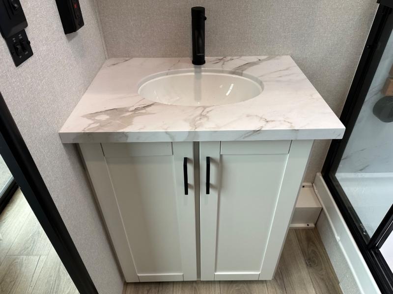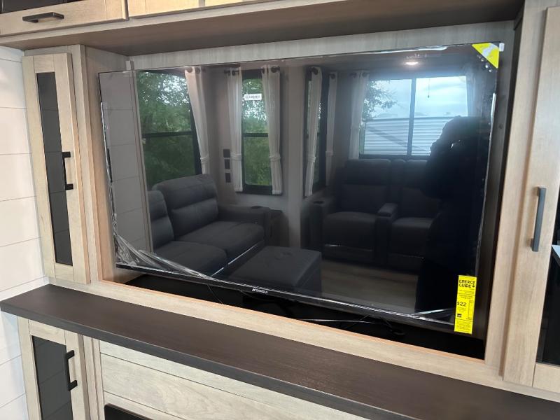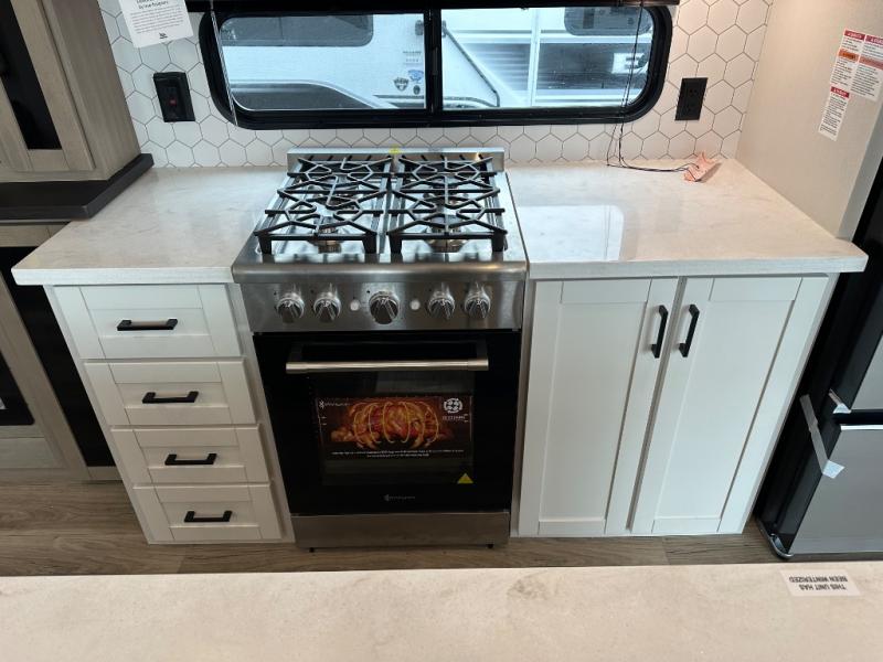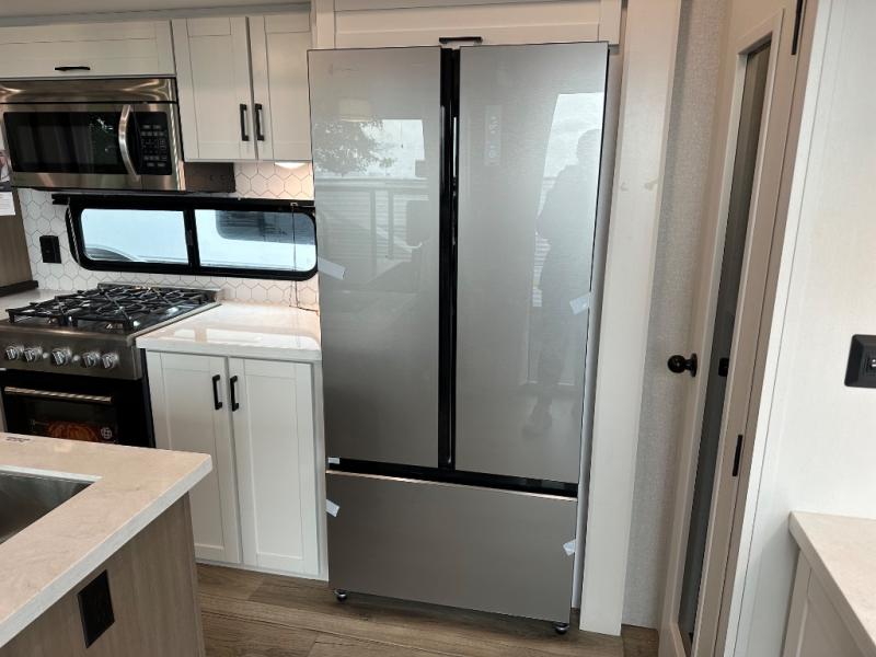 Extended stays are made easy in this travel trailer for four. You will love having your own bedroom up front with a queen bed slide, a wardrobe, plus two chests for your things, and your guests can sleep on the tri-fold sofa in the rear living area. A ceiling fan will keep the air moving while the chef makes eggs and bacon in the morning, and you all can dine at the free-standing table with chairs. Spend your day outdoors hiking, biking, or swimming, and the full bath will allow you to clean up after your adventures. You may want to make it a movie night since there is an entertainment center with a TV, or you can just relax by the fireplace and visit!