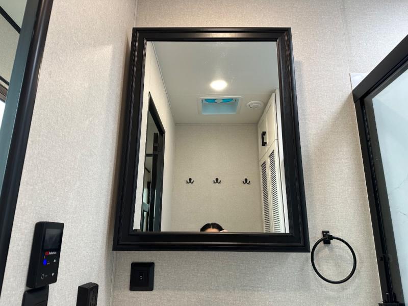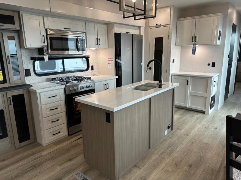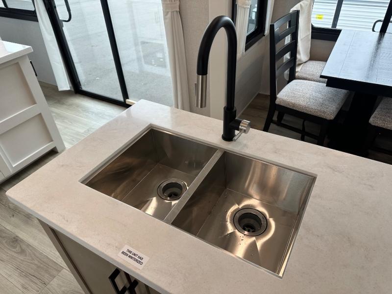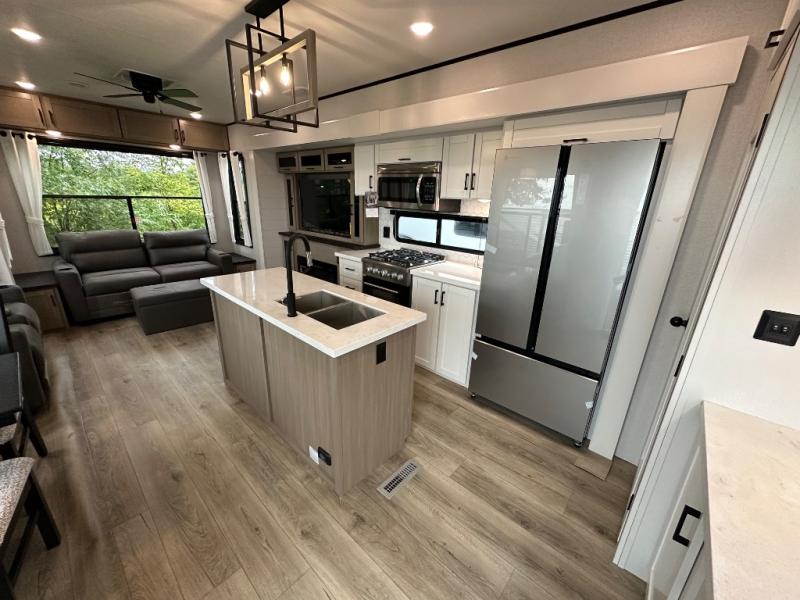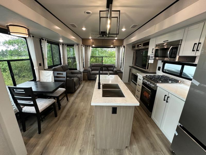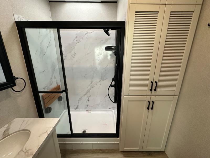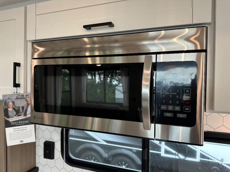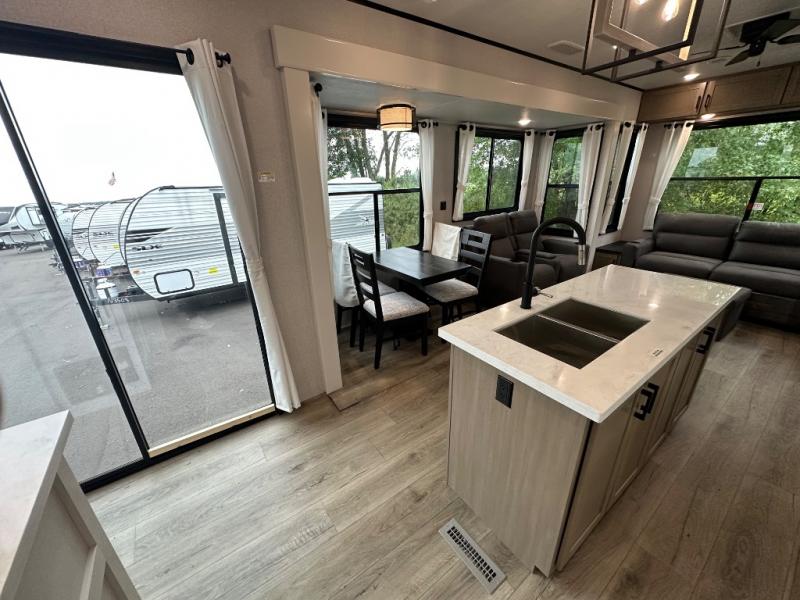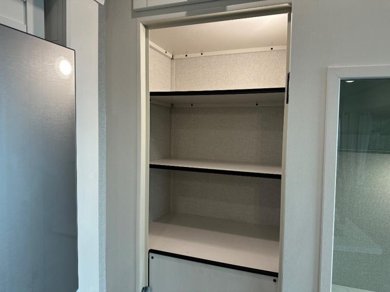 Extended stays are made easy in this travel trailer for four. You will love having your own bedroom up front with a queen bed slide, a wardrobe, plus two chests for your things, and your guests can sleep on the tri-fold sofa in the rear living area. A ceiling fan will keep the air moving while the chef makes eggs and bacon in the morning, and you all can dine at the free-standing table with chairs. Spend your day outdoors hiking, biking, or swimming, and the full bath will allow you to clean up after your adventures. You may want to make it a movie night since there is an entertainment center with a TV, or you can just relax by the fireplace and visit!