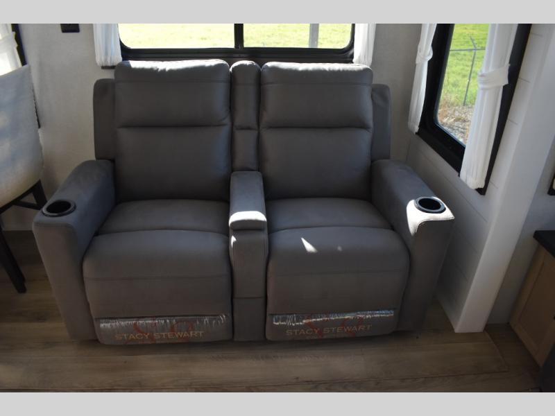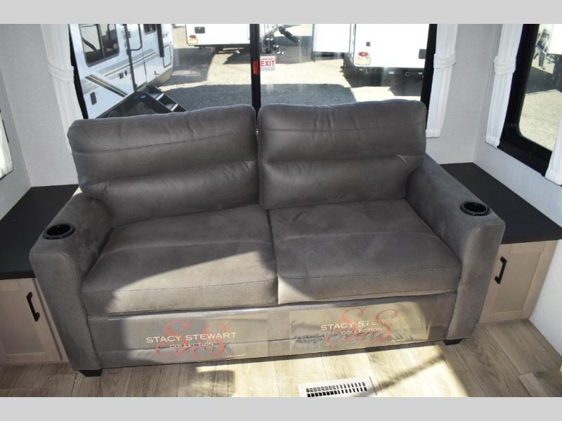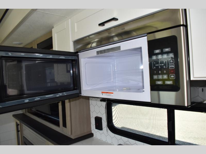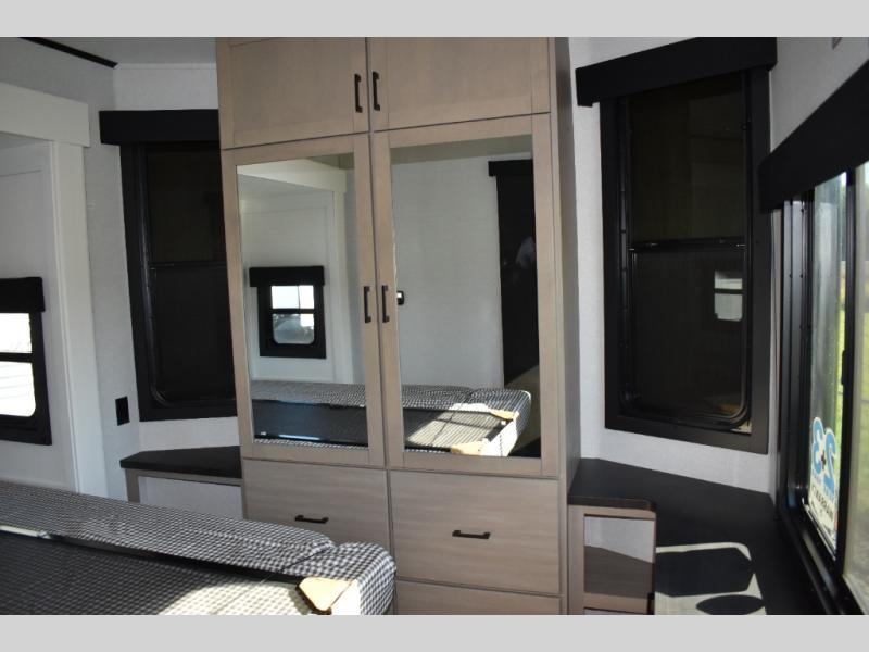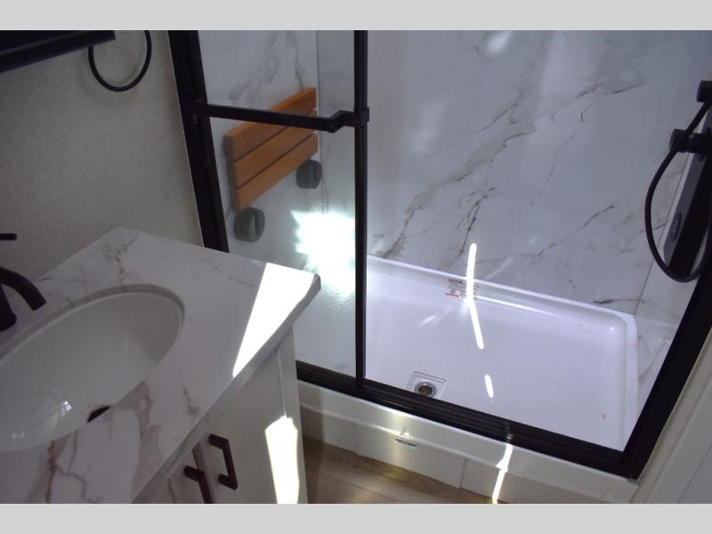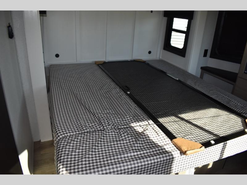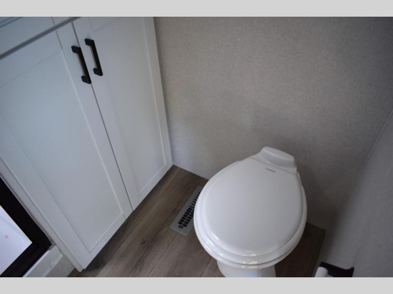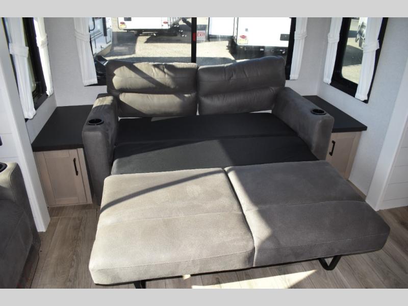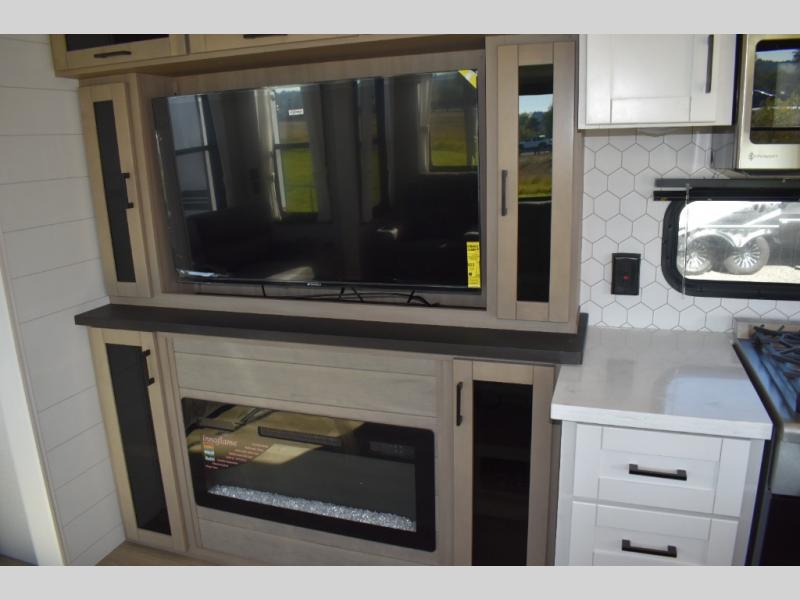 Extended stays are made easy in this travel trailer for four. You will love having your own bedroom up front with a queen bed slide, a wardrobe, plus two chests for your things, and your guests can sleep on the tri-fold sofa in the rear living area. A ceiling fan will keep the air moving while the chef makes eggs and bacon in the morning, and you all can dine at the free-standing table with chairs. Spend your day outdoors hiking, biking, or swimming, and the full bath will allow you to clean up after your adventures. You may want to make it a movie night since there is an entertainment center with a TV, or you can just relax by the fireplace and visit!