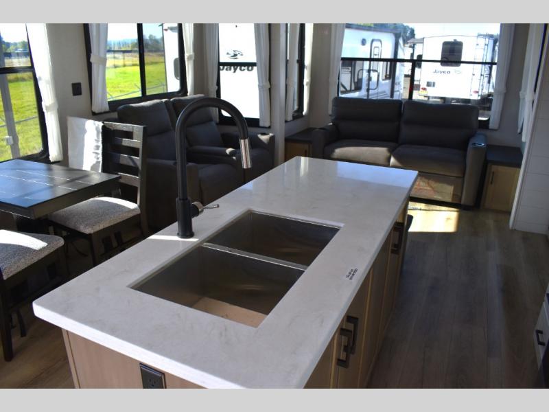 Each Jay Flight Bungalow travel trailer by Jayco features a Magnum Truss roof system, 12 in. I-Class cambered structural steel I-beams, and an insulated and enclosed underbelly for added protection against the elements. You will love the open living space and the atrium-style front wall, along with oversized side windows and hardwood look vinyl flooring. An on-demand tankless water heater will provide endless hot showers, and you're sure to stay comfortable with two A/C units. These travel trailers also include an AM/FM/Bluetooth stereo and marine grade exterior speakers, a power awning with an LED light, an outside shower, plus many more exterior conveniences!