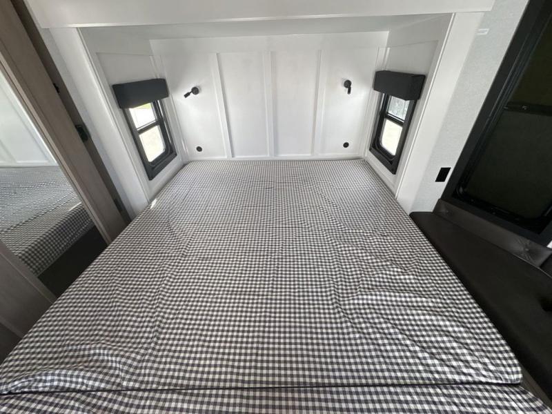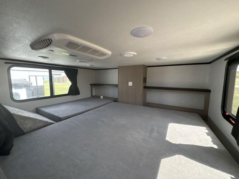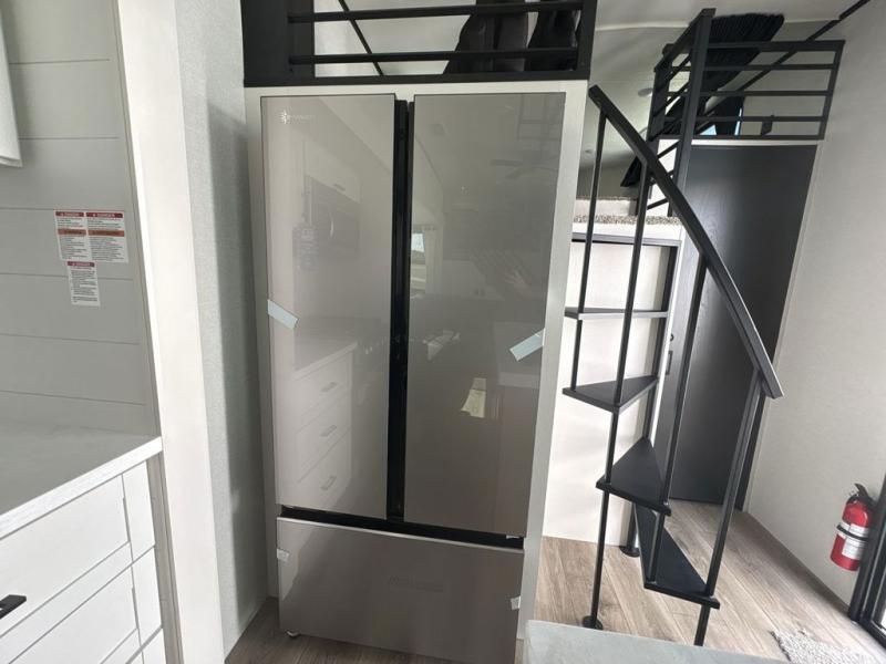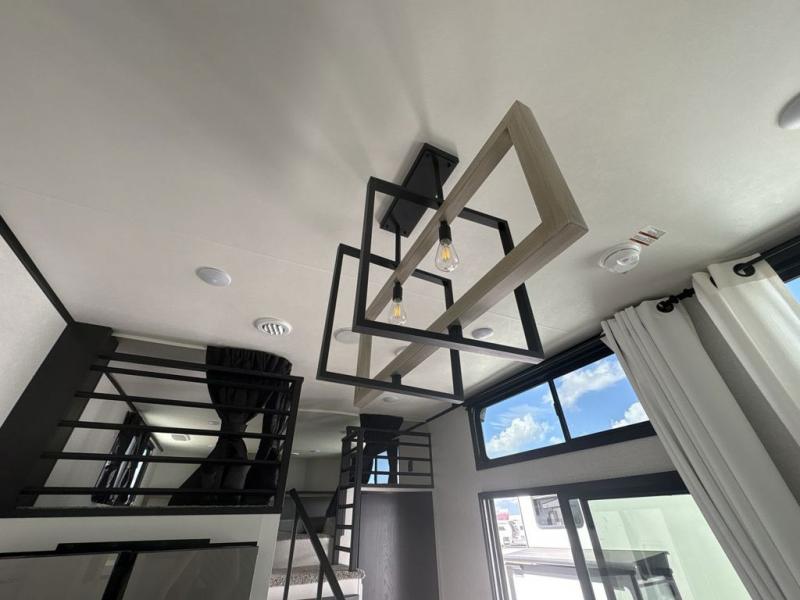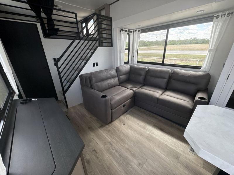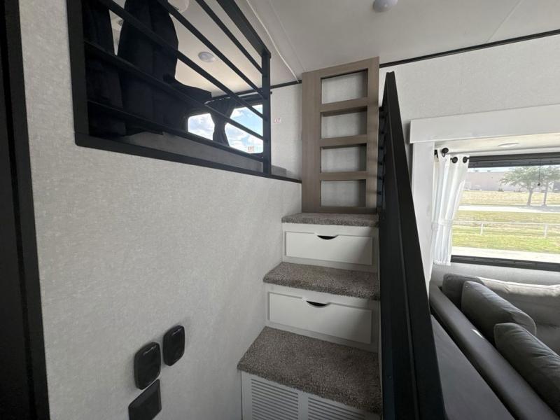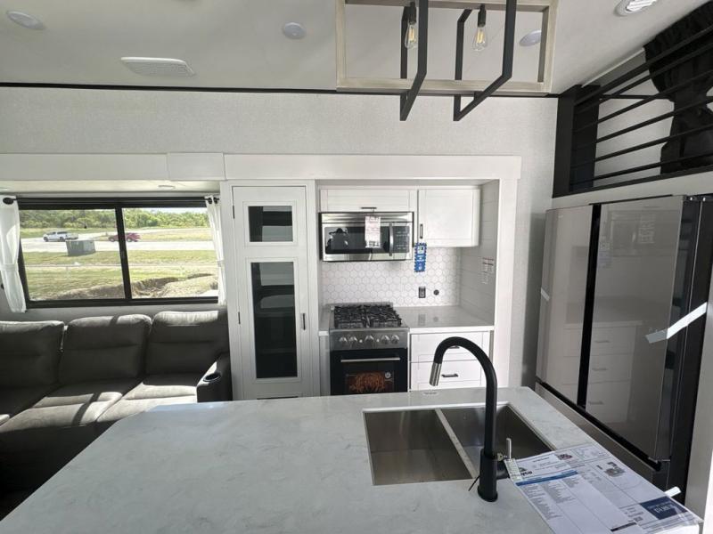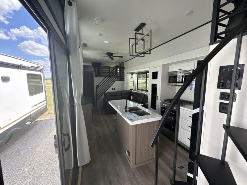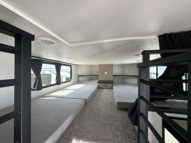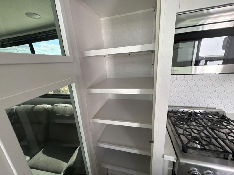 Travel in comfort with your family. You will love having your own bedroom up front with a queen bed, a bench with storage below, plus a dresser and overhead cabinet for your things. The front loft above the bedroom includes three bunk mats, a nightstand, and overhead shelves to keep this space tidy. In the living area, you will be able to enjoy the entertainment center, and a ceiling fan will keep the air moving while the chef cooks delicious meals in the morning. And you all can dine at the kitchen island which includes bar stools. The Kitchen is also fitted with a residential refrigerator, microwave, four cooktop burner, sink and pantry perfect to cook with luxury and comfort. Finally, you'll find a full rear bath with a walk-in shower plus washer and dryer prep. There is even a second loft above the bathroom for more sleeping or storage space!