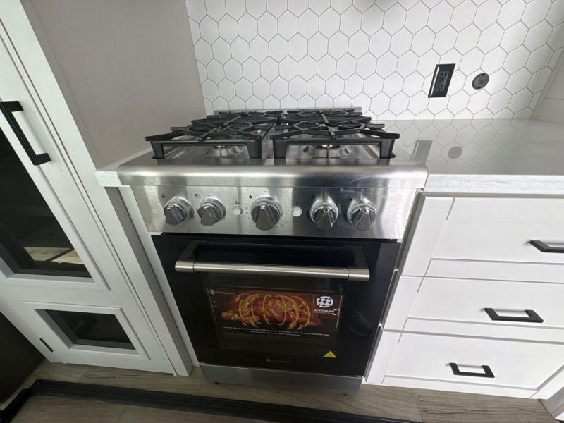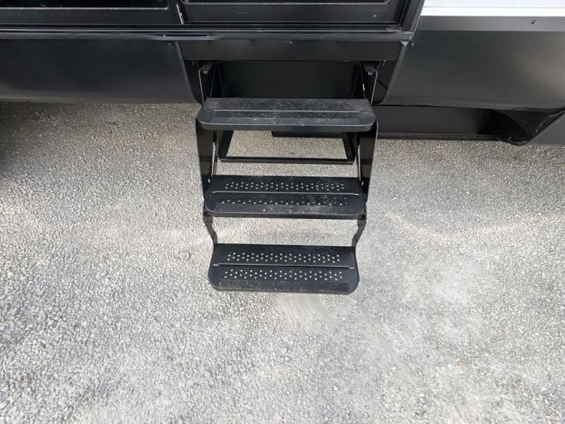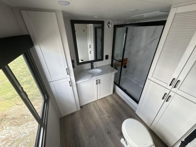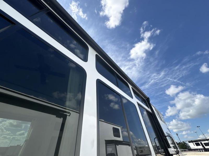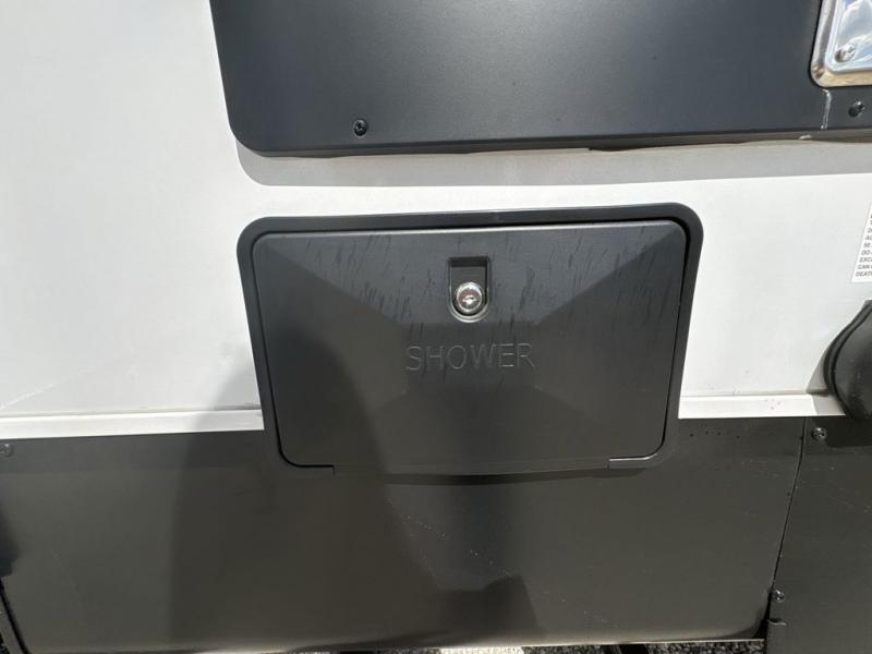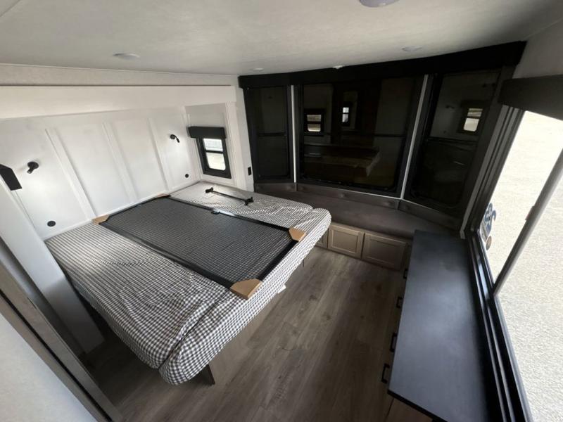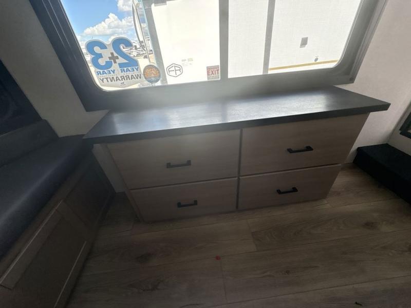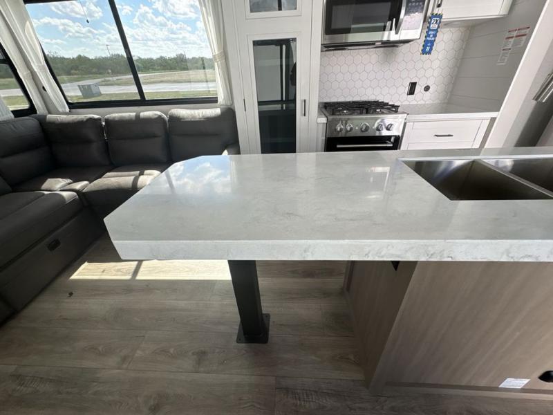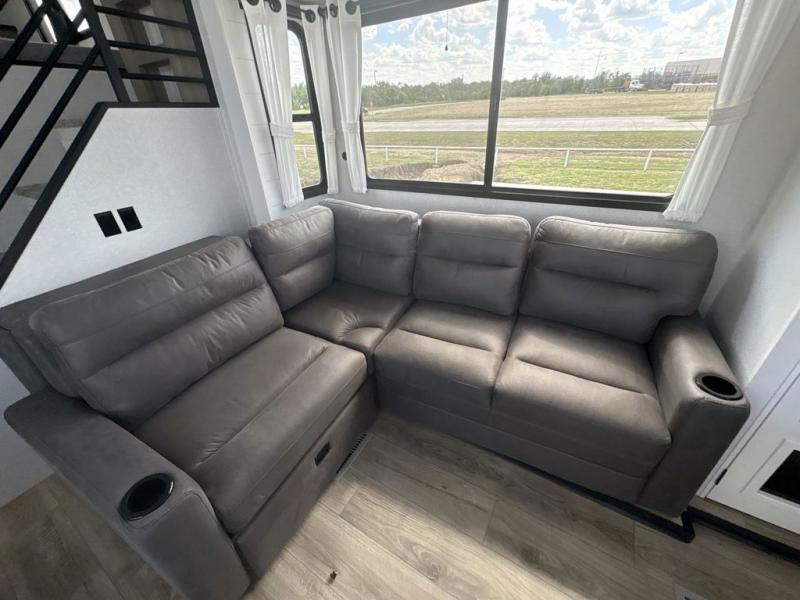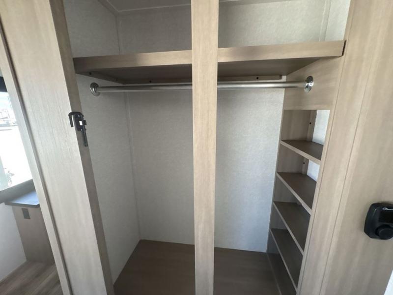 Travel in comfort with your family. You will love having your own bedroom up front with a queen bed, a bench with storage below, plus a dresser and overhead cabinet for your things. The front loft above the bedroom includes three bunk mats, a nightstand, and overhead shelves to keep this space tidy. In the living area, you will be able to enjoy the entertainment center, and a ceiling fan will keep the air moving while the chef cooks delicious meals in the morning. And you all can dine at the kitchen island which includes bar stools. The Kitchen is also fitted with a residential refrigerator, microwave, four cooktop burner, sink and pantry perfect to cook with luxury and comfort. Finally, you'll find a full rear bath with a walk-in shower plus washer and dryer prep. There is even a second loft above the bathroom for more sleeping or storage space!