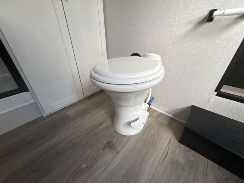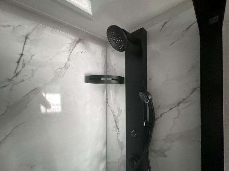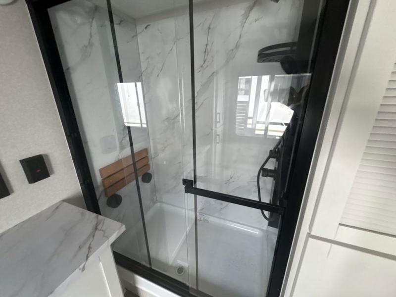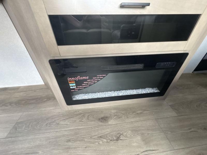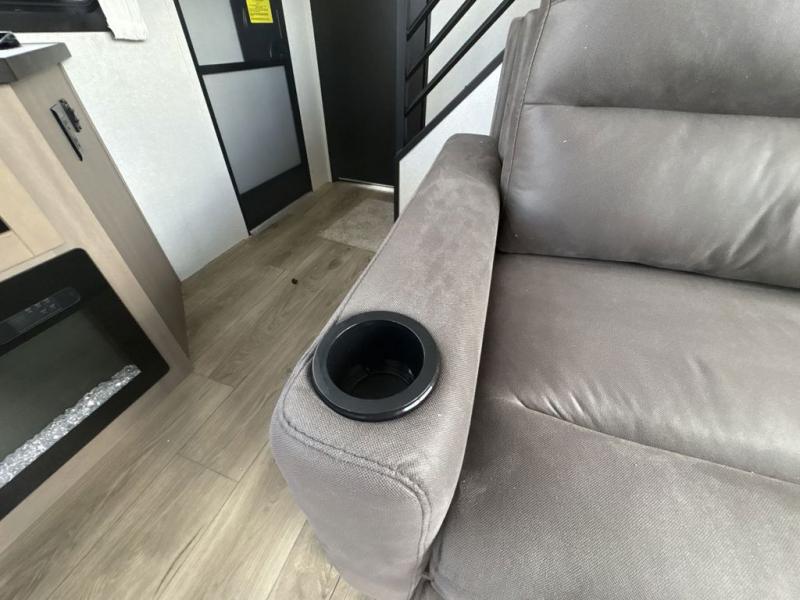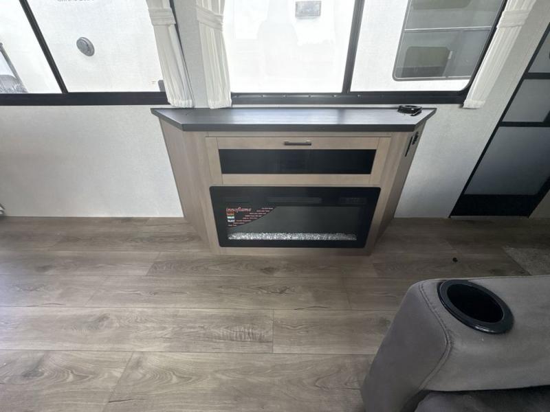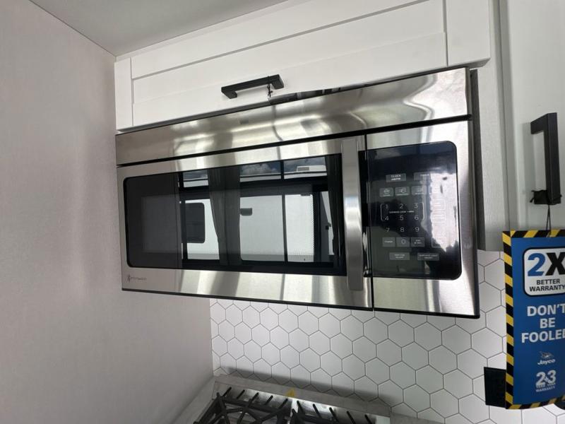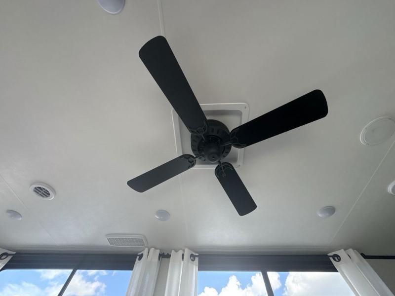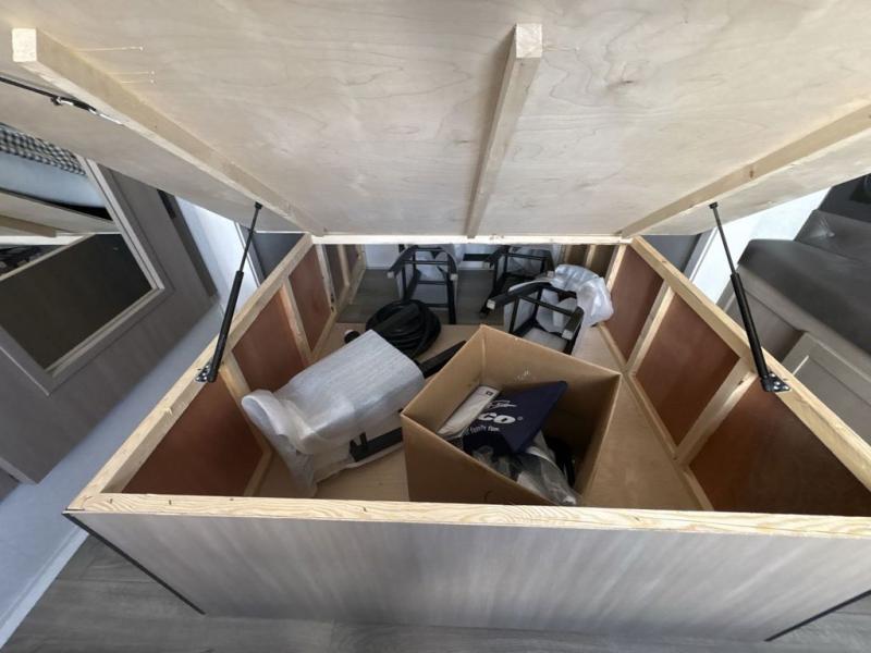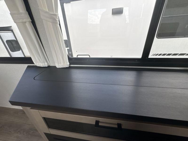 Travel in comfort with your family. You will love having your own bedroom up front with a queen bed, a bench with storage below, plus a dresser and overhead cabinet for your things. The front loft above the bedroom includes three bunk mats, a nightstand, and overhead shelves to keep this space tidy. In the living area, you will be able to enjoy the entertainment center, and a ceiling fan will keep the air moving while the chef cooks delicious meals in the morning. And you all can dine at the kitchen island which includes bar stools. The Kitchen is also fitted with a residential refrigerator, microwave, four cooktop burner, sink and pantry perfect to cook with luxury and comfort. Finally, you'll find a full rear bath with a walk-in shower plus washer and dryer prep. There is even a second loft above the bathroom for more sleeping or storage space!