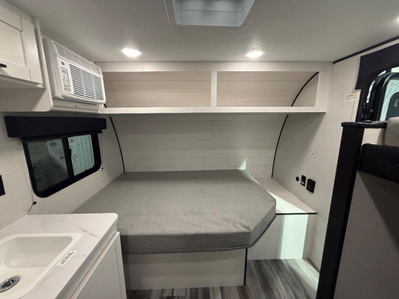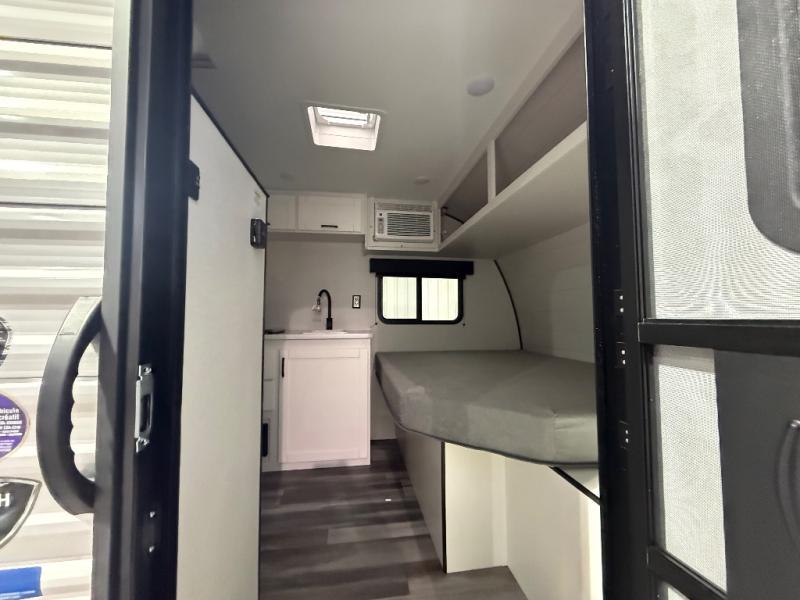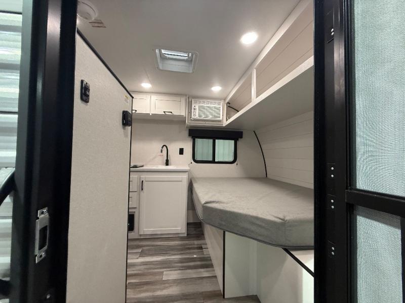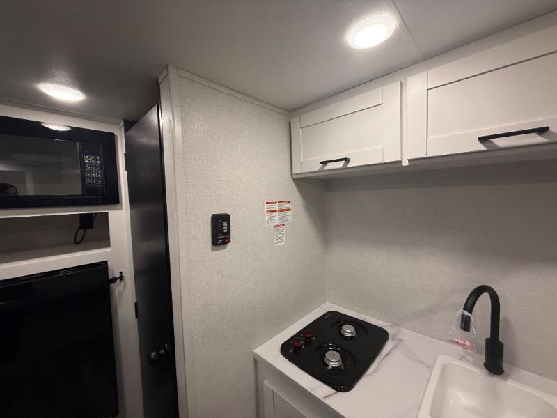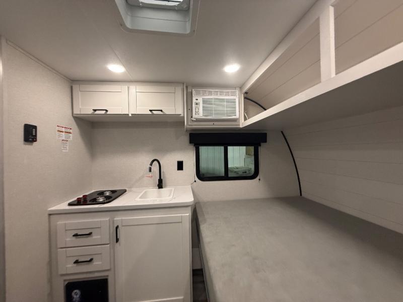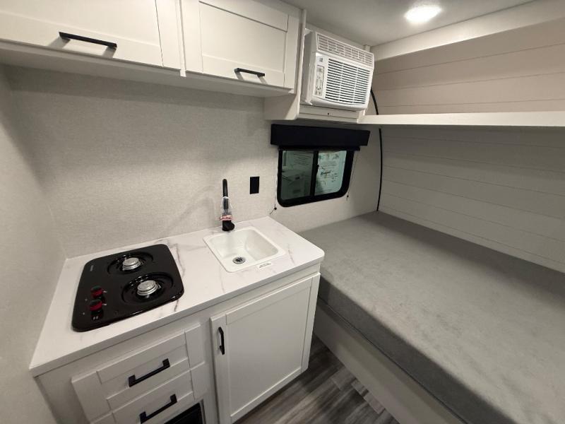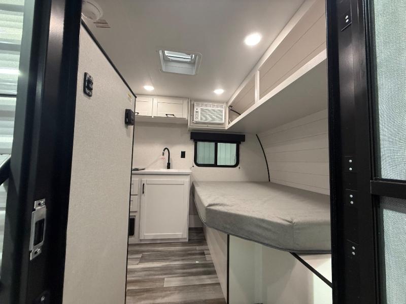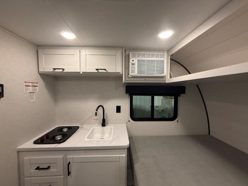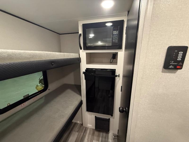 Your crew of four will love camping in this cozy travel trailer! There are bunk beds in the rear corner and a private bath in the other rear corner for easy nighttime use. You will have the front bed to yourselves, along with an overhead shelf and a nightstand/wardrobe for your clothes. The Customer Value Package on this Sport Edition model includes a 19K BTU furnace, stabilizer jacks, a power awning, an entry door with a window and shade prep, and many more stand-out features!