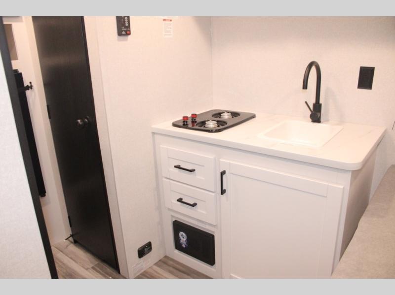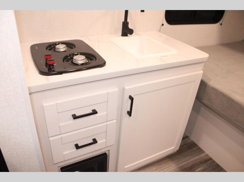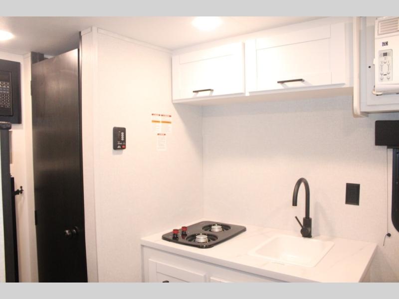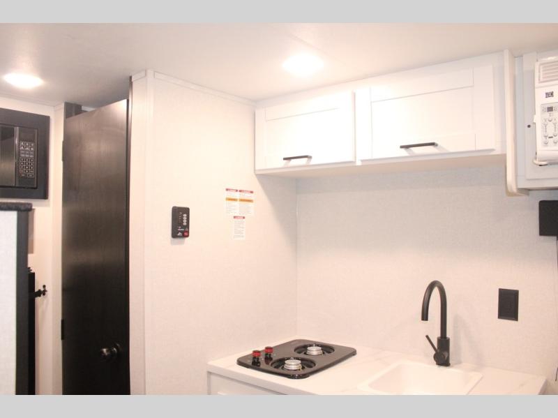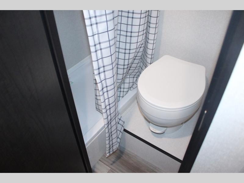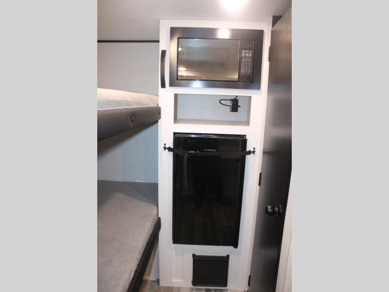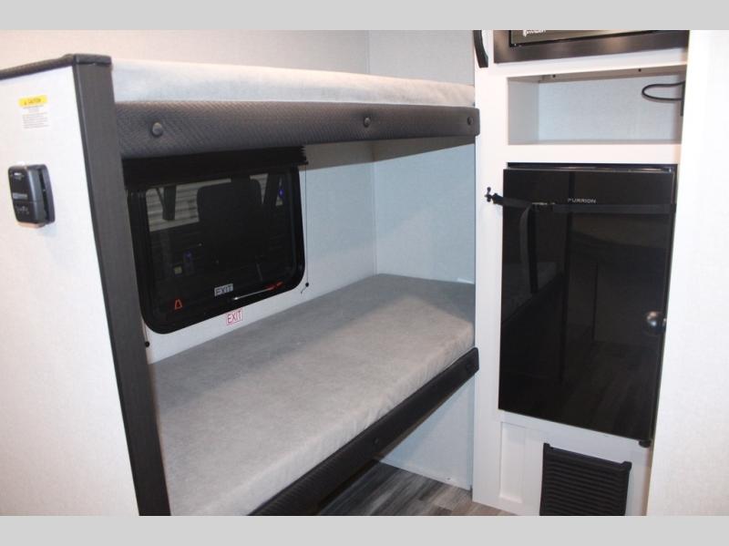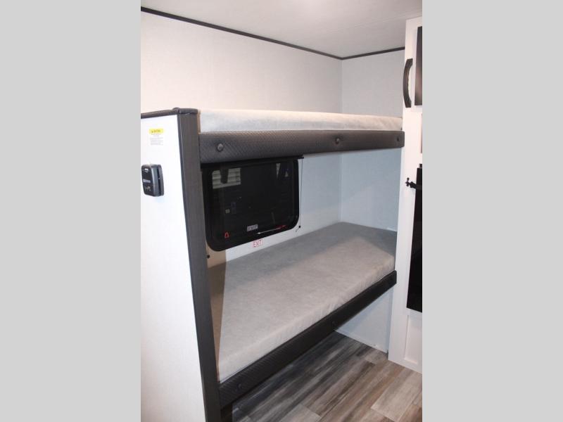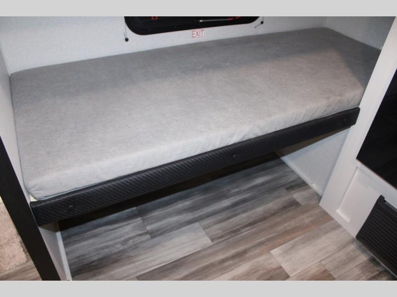 Your crew of four will love camping in this cozy travel trailer! There are bunk beds in the rear corner and a private bath in the other rear corner for easy nighttime use. You will have the front bed to yourselves, along with an overhead shelf and a nightstand/wardrobe for your clothes. The Customer Value Package on this Sport Edition model includes a 19K BTU furnace, stabilizer jacks, a power awning, an entry door with a window and shade prep, and many more stand-out features!