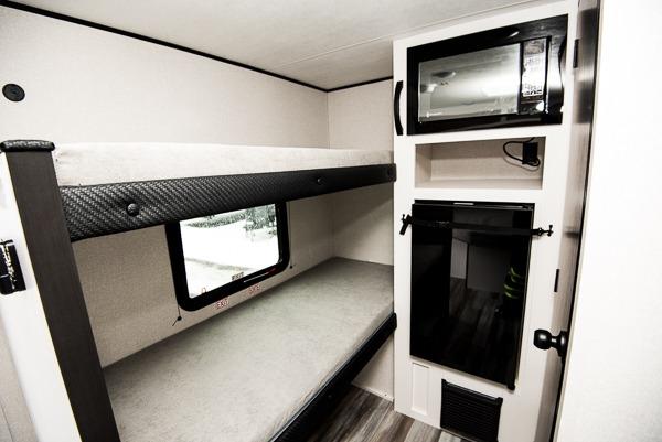 Your crew of four will love camping in this cozy travel trailer! There are bunk beds in the rear corner and a private bath in the other rear corner for easy nighttime use. You will have the front bed to yourselves, along with an overhead shelf and a nightstand/wardrobe for your clothes. The Customer Value Package on this Sport Edition model includes a 19K BTU furnace, stabilizer jacks, a power awning, an entry door with a window and shade prep, and many more stand-out features!