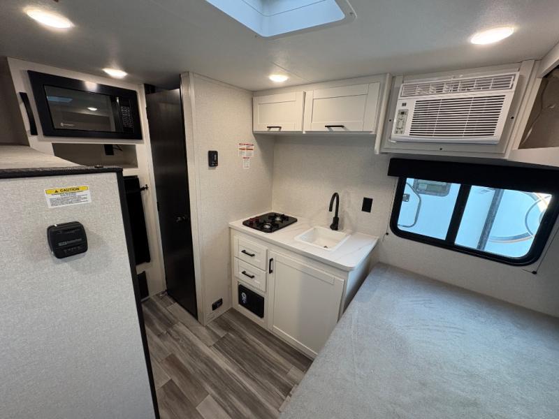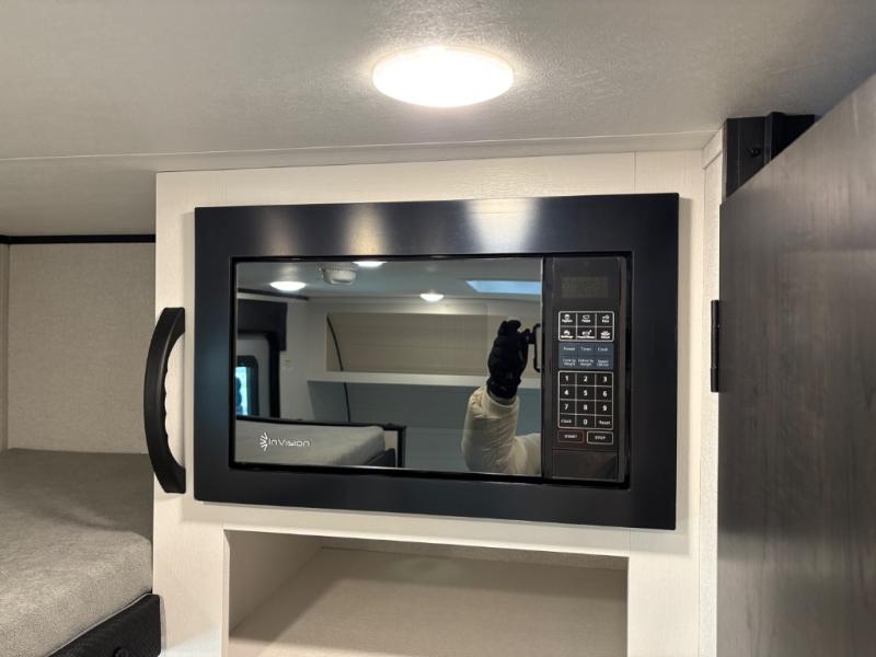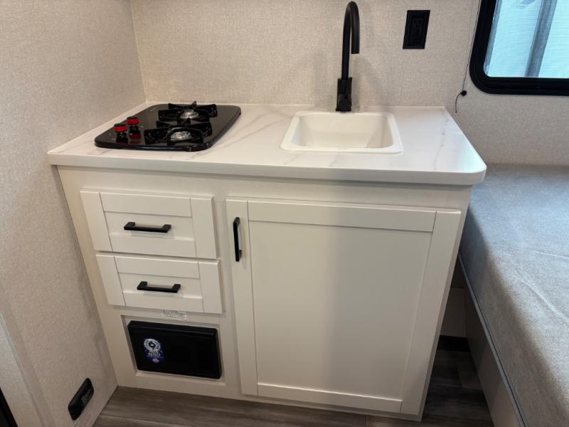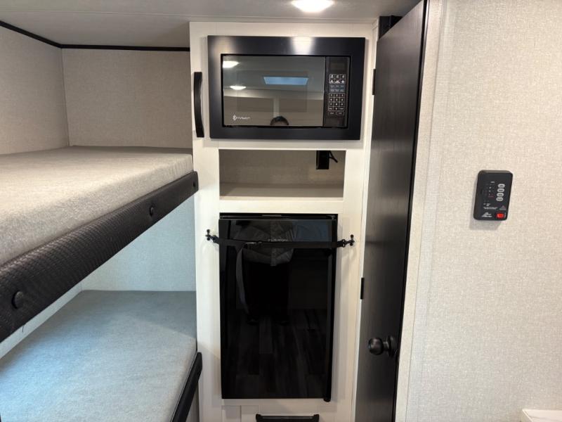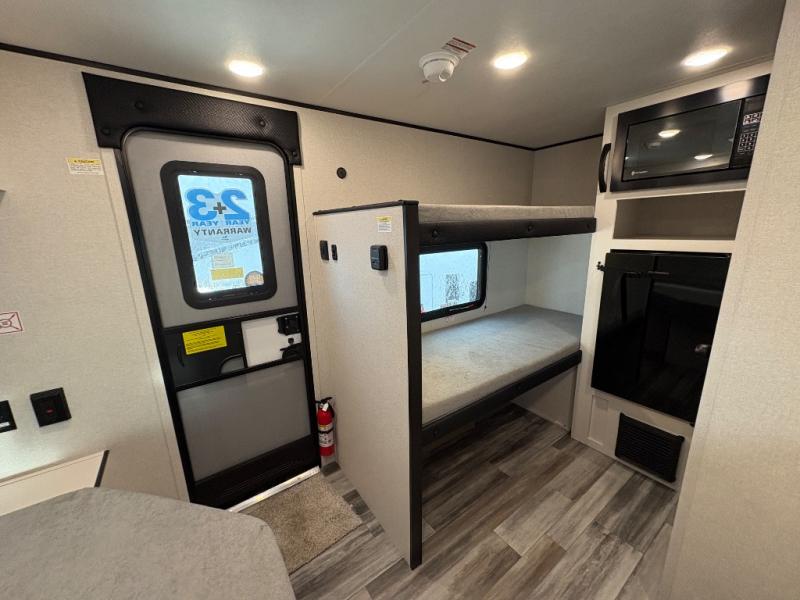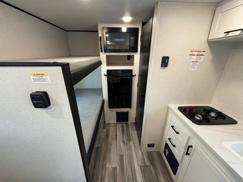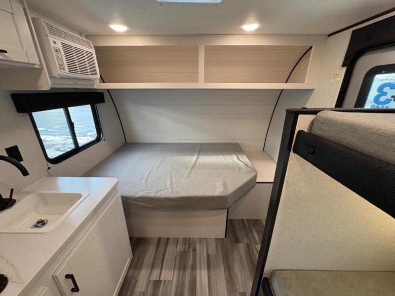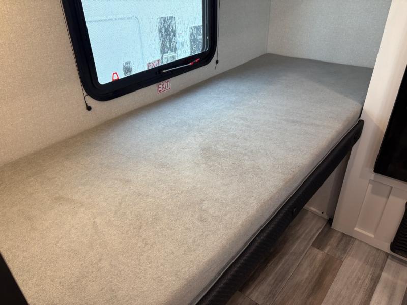 Your crew of four will love camping in this cozy travel trailer! There are bunk beds in the rear corner and a private bath in the other rear corner for easy nighttime use. You will have the front bed to yourselves, along with an overhead shelf and a nightstand/wardrobe for your clothes. The Customer Value Package on this Sport Edition model includes a 19K BTU furnace, stabilizer jacks, a power awning, an entry door with a window and shade prep, and many more stand-out features!