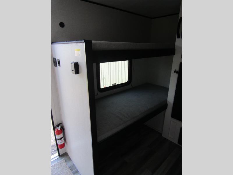 Your crew of four will love camping in this cozy travel trailer! There are bunk beds in the rear corner and a private bath in the other rear corner for easy nighttime use. You will have the front bed to yourselves, along with an overhead shelf and a nightstand/wardrobe for your clothes. The Customer Value Package on this Sport Edition model includes a 19K BTU furnace, stabilizer jacks, a power awning, an entry door with a window and shade prep, and many more stand-out features!