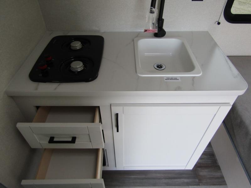 Your crew of four will love camping in this cozy travel trailer! There are bunk beds in the rear corner and a private bath in the other rear corner for easy nighttime use. You will have the front bed to yourselves, along with an overhead shelf and a nightstand/wardrobe for your clothes. The Customer Value Package on this Sport Edition model includes a 19K BTU furnace, stabilizer jacks, a power awning, an entry door with a window and shade prep, and many more stand-out features!