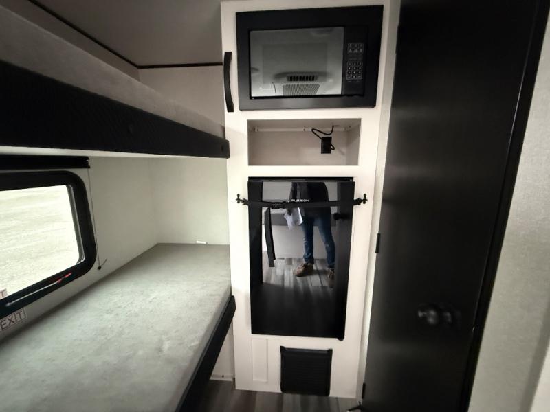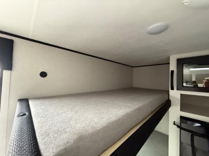 Your crew of four will love camping in this cozy travel trailer! There are bunk beds in the rear corner and a private bath in the other rear corner for easy nighttime use. You will have the front bed to yourselves, along with an overhead shelf and a nightstand/wardrobe for your clothes. The Customer Value Package on this Sport Edition model includes a 19K BTU furnace, stabilizer jacks, a power awning, an entry door with a window and shade prep, and many more stand-out features!