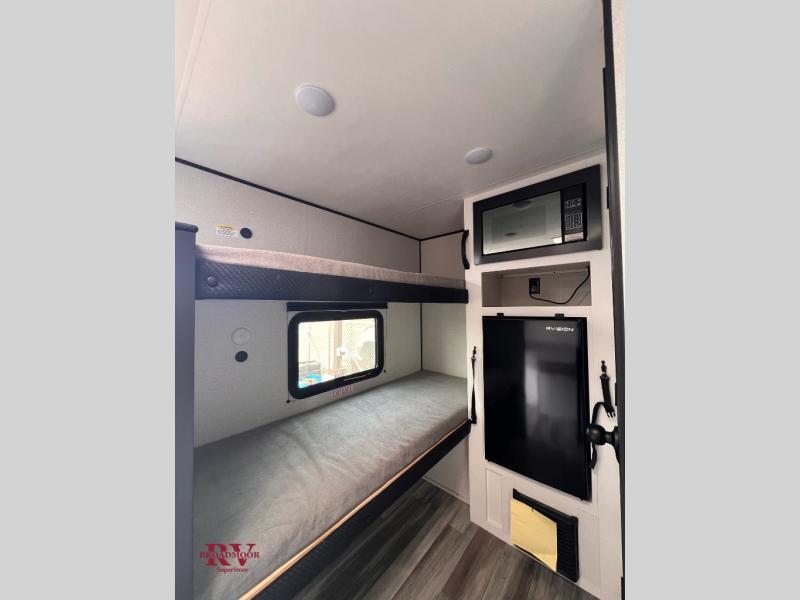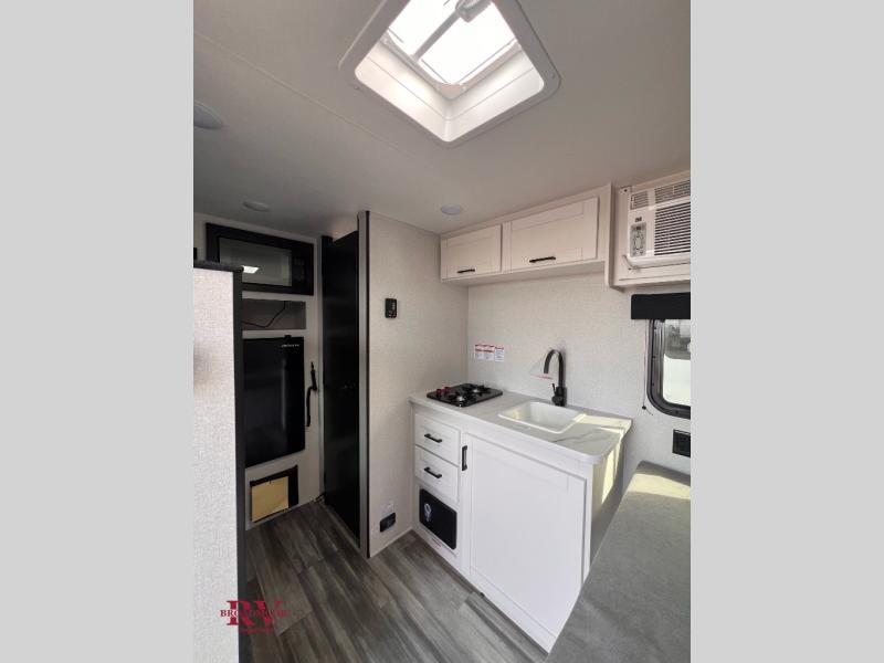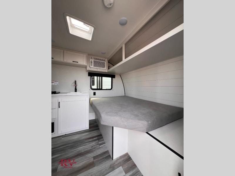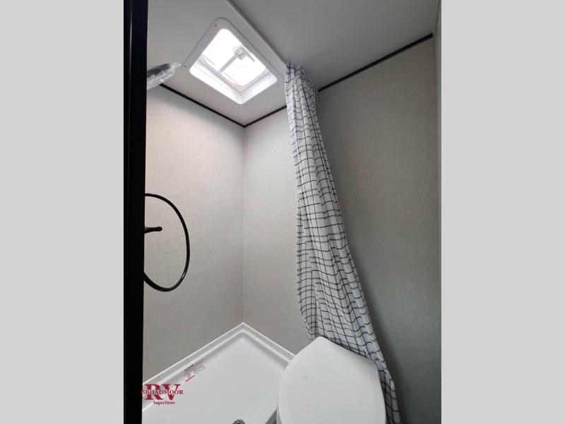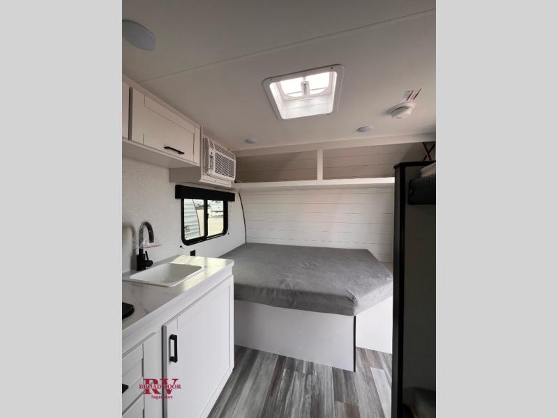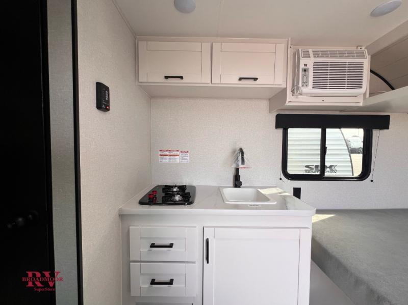 Your crew of four will love camping in this cozy travel trailer! There are bunk beds in the rear corner and a private bath in the other rear corner for easy nighttime use. You will have the front bed to yourselves, along with an overhead shelf and a nightstand/wardrobe for your clothes. The Customer Value Package on this Sport Edition model includes a 19K BTU furnace, stabilizer jacks, a power awning, an entry door with a window and shade prep, and many more stand-out features!
