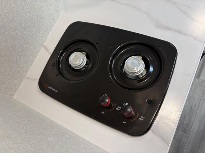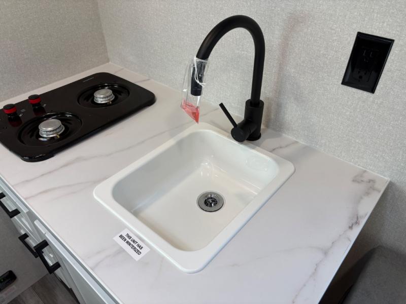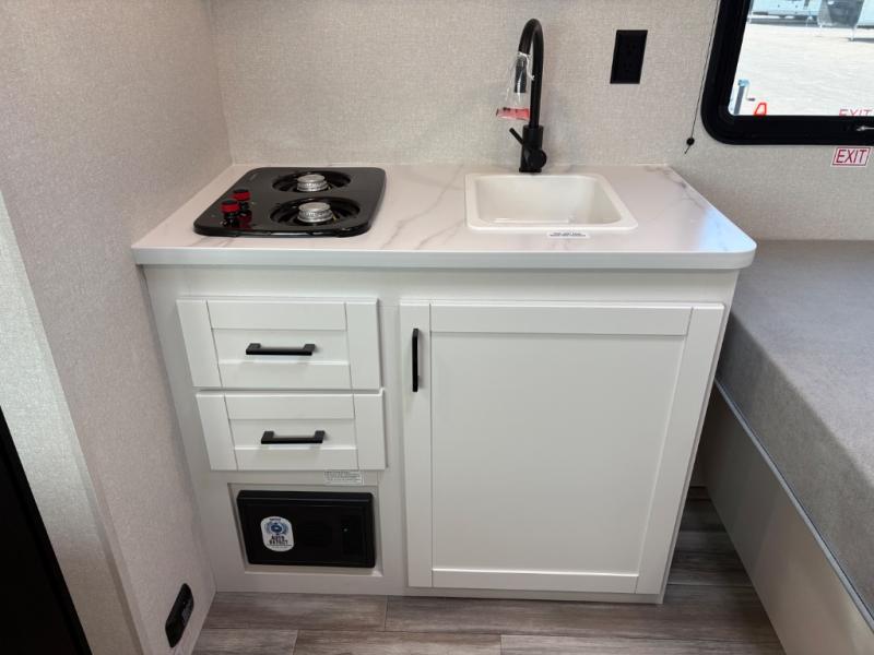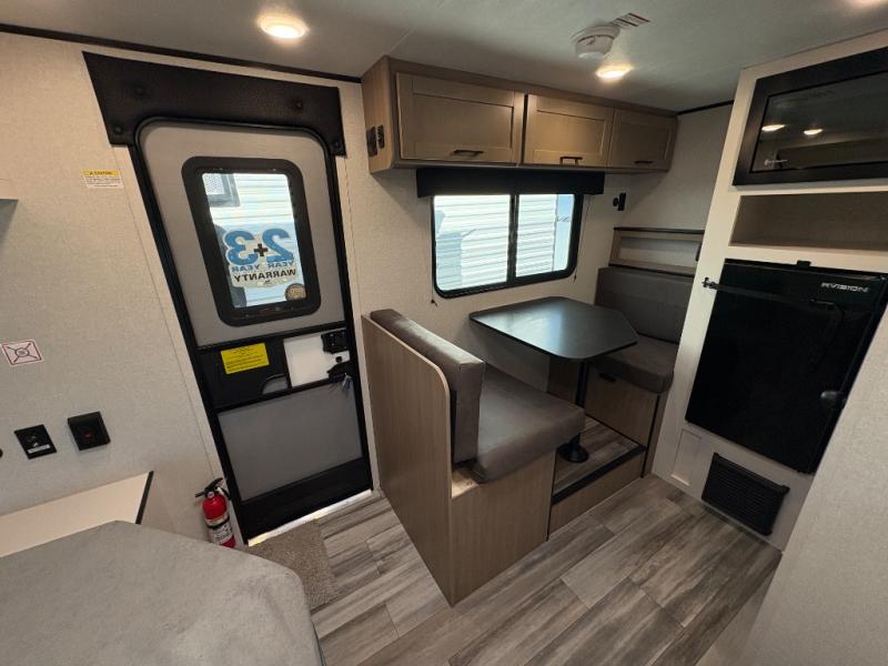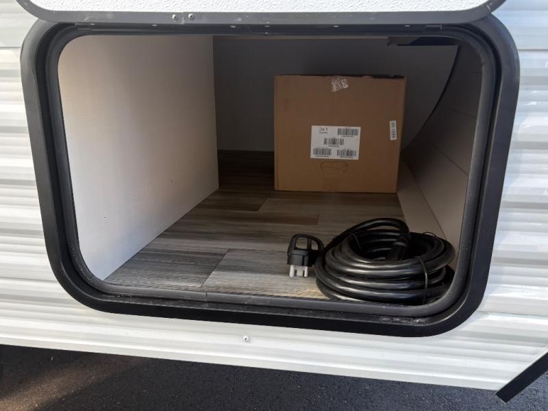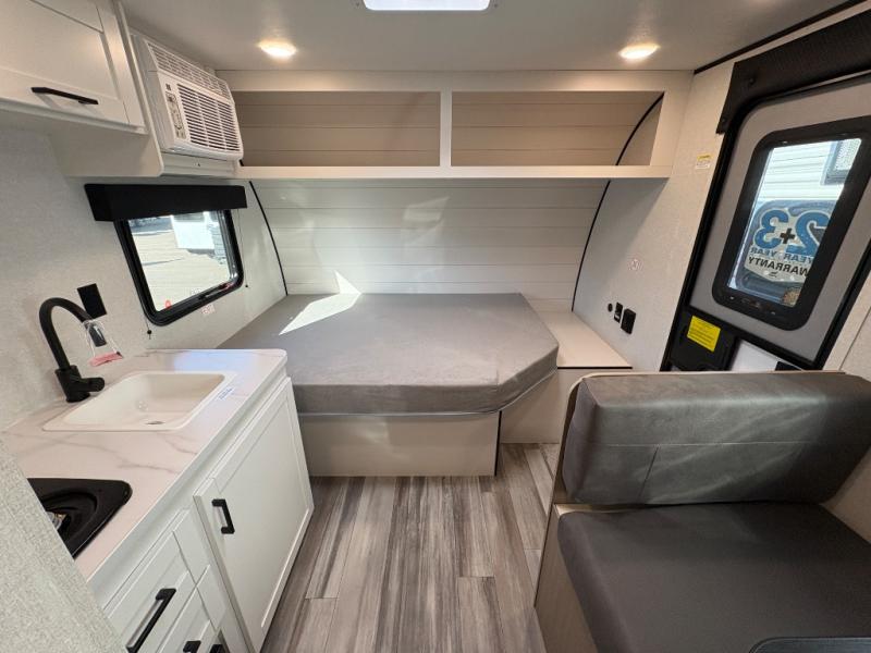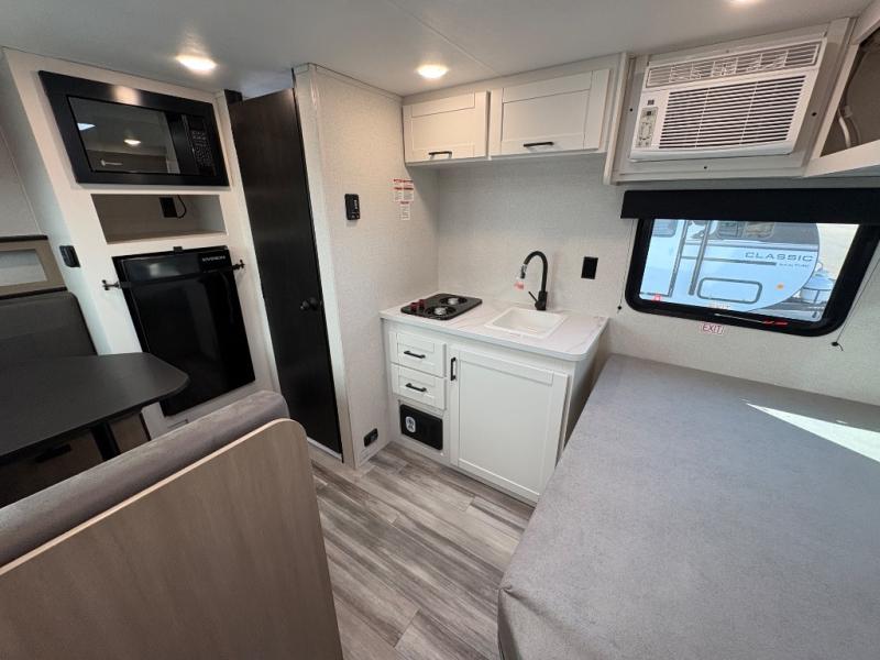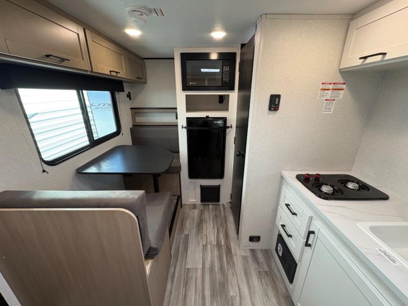 You will love camping in this cozy travel trailer! There is a rear corner booth dinette for dining space and a private bath in the other rear corner to freshen up. You will have the front bed to yourselves, along with an overhead shelf and a nightstand/wardrobe for your clothes. The Customer Value Package on this Sport Edition model includes a 19K BTU furnace, stabilizer jacks, a power awning, an entry door with a window and shade prep, and many more stand-out features!