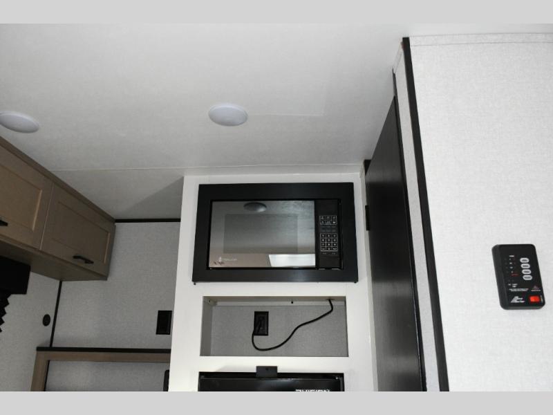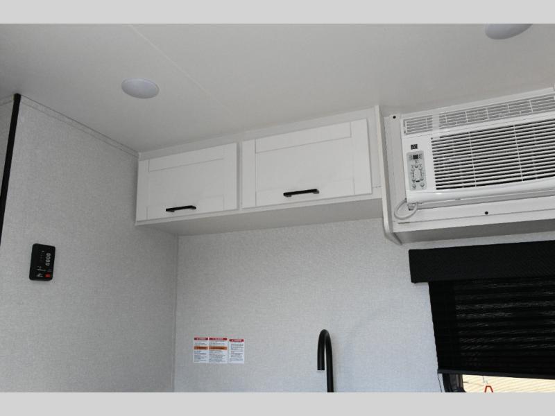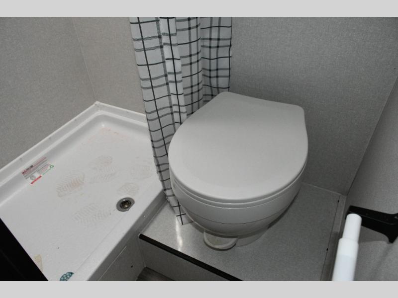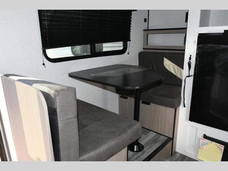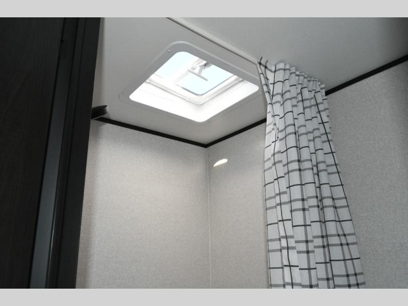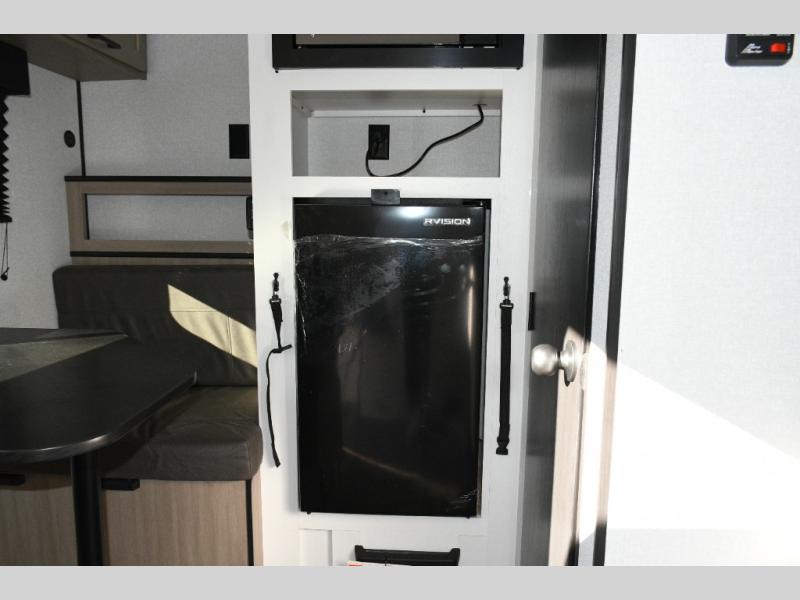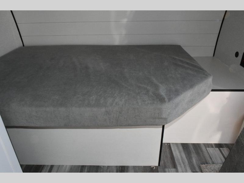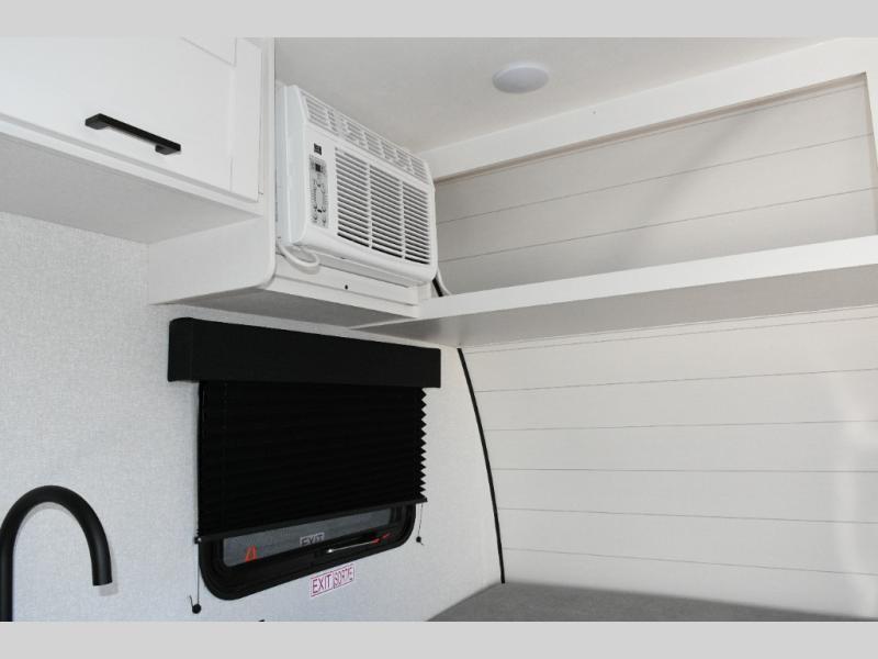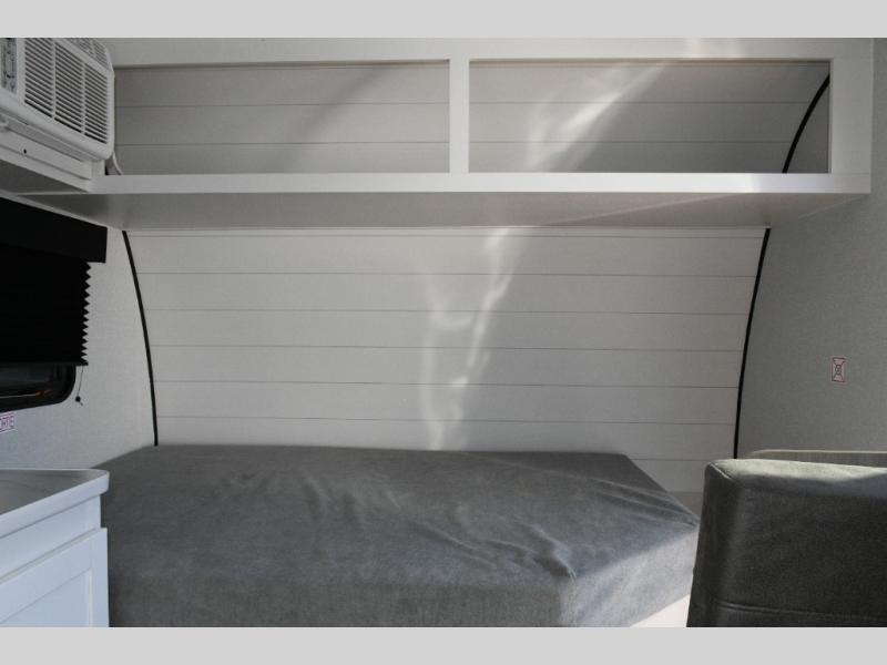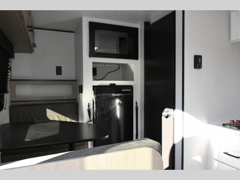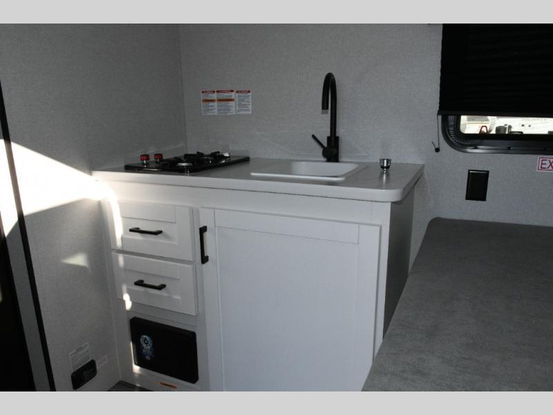 The main living area is designed for comfort and practicality, with a 12V refrigerator for storing meals and snacks. Outside, the 8' electric awning creates a shaded outdoor living space, perfect for relaxing after a day of exploring the campground or local trails.