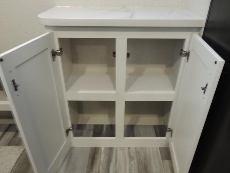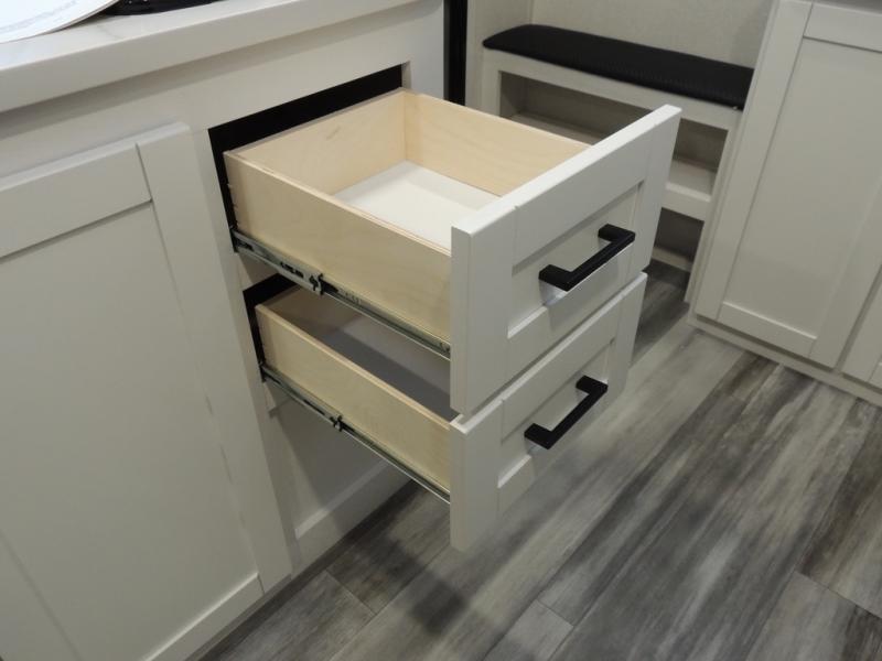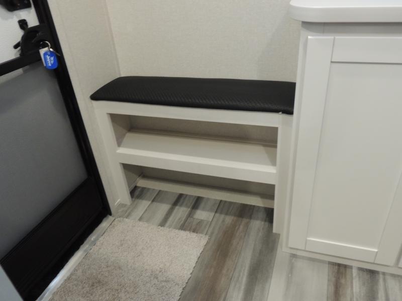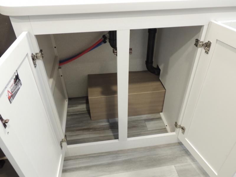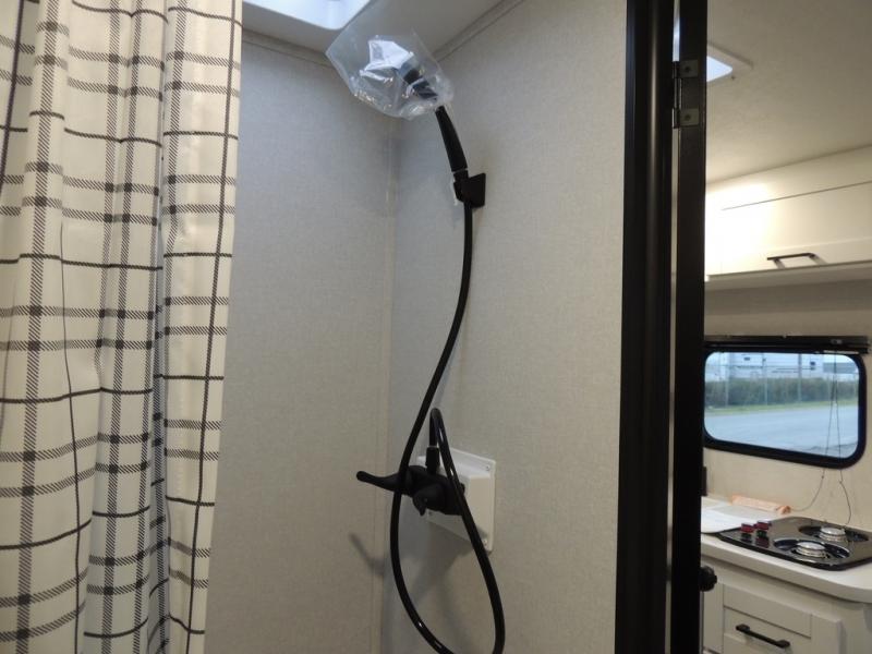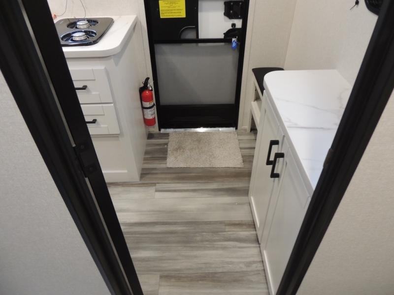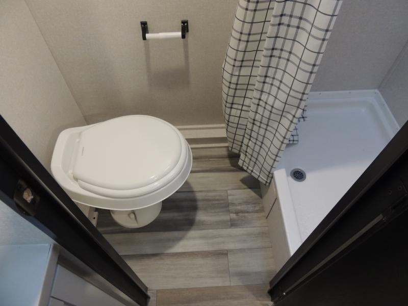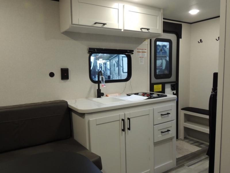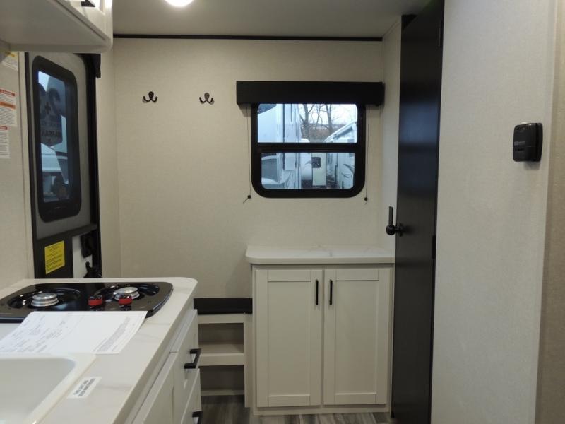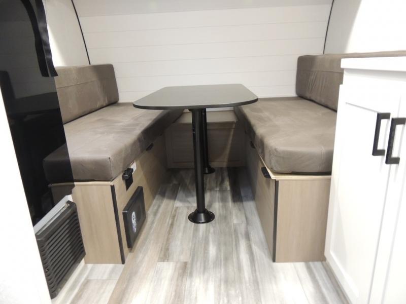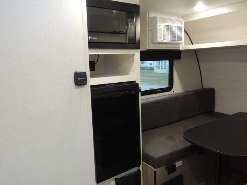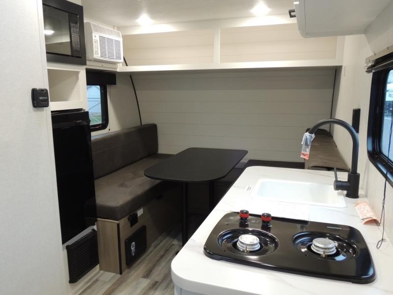 Easy to tow and versatile are just two ways to describe this travel trailer! The front twin beds/bench seats with a table can convert to a king-size bed, and you'll have an overhead shelf to keep your things organized. A two-burner stovetop and microwave will let you cook meals each day, and a 12V refrigerator will keep food fresh. The private bath includes a toilet and shower to clean up in each day, and the dresser just outside the bath will be perfect for clean clothes and towels!