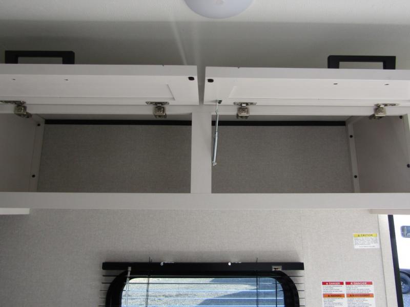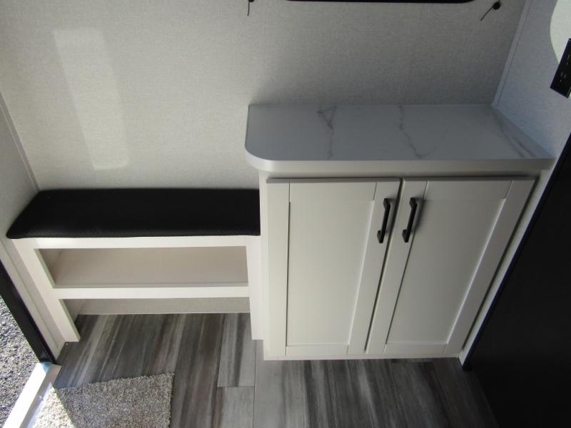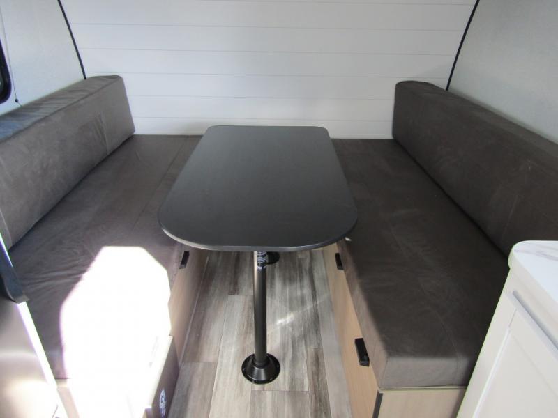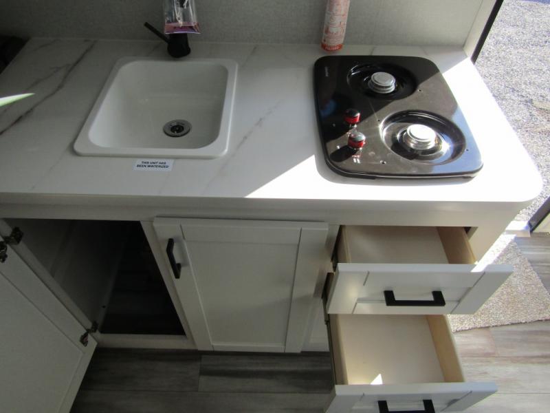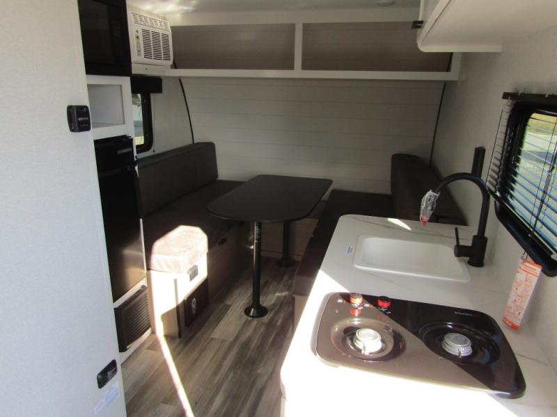 Easy to tow and versatile are just two ways to describe this travel trailer! The front twin beds/bench seats with a table can convert to a king-size bed, and you'll have an overhead shelf to keep your things organized. A two-burner stovetop and microwave will let you cook meals each day, and a 12V refrigerator will keep food fresh. The private bath includes a toilet and shower to clean up in each day, and the dresser just outside the bath will be perfect for clean clothes and towels!