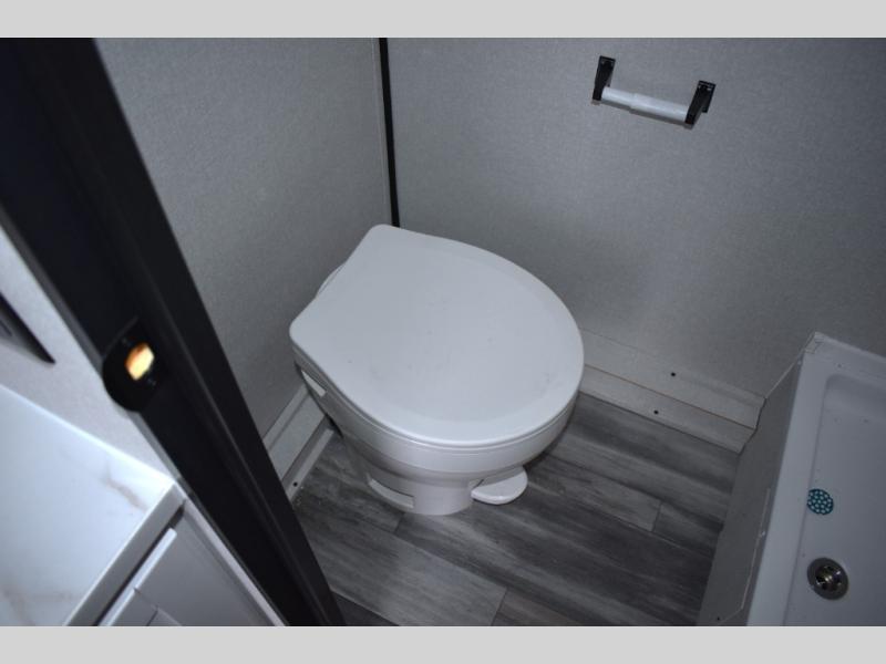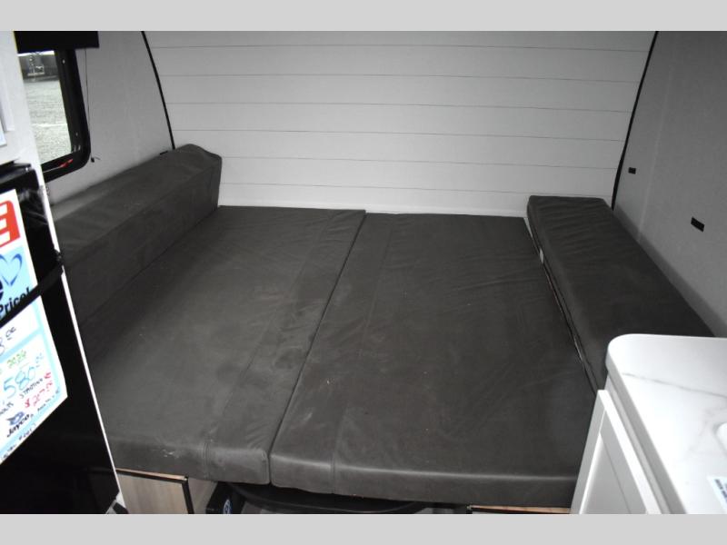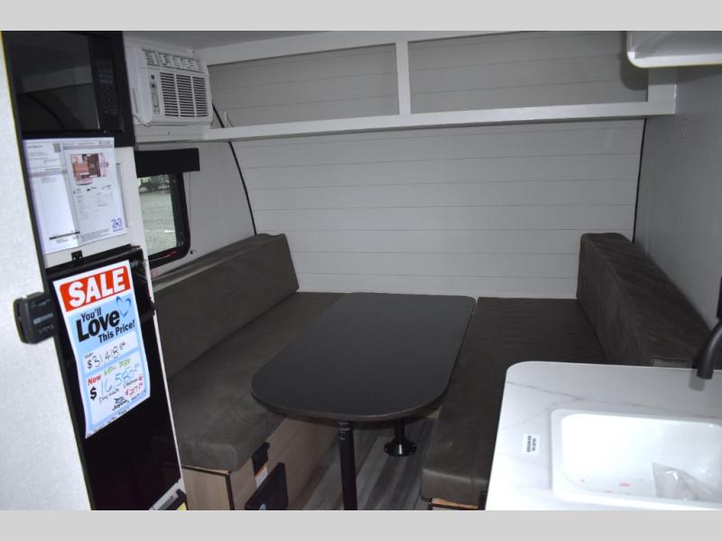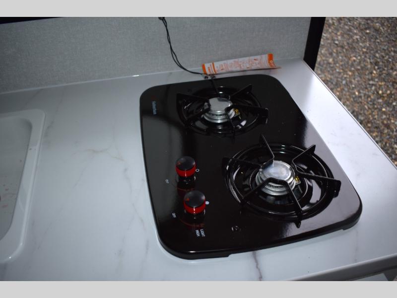 Easy to tow and versatile are just two ways to describe this travel trailer! The front twin beds/bench seats with a table can convert to a king-size bed, and you'll have an overhead shelf to keep your things organized. A two-burner stovetop and microwave will let you cook meals each day, and a 12V refrigerator will keep food fresh. The private bath includes a toilet and shower to clean up in each day, and the dresser just outside the bath will be perfect for clean clothes and towels!