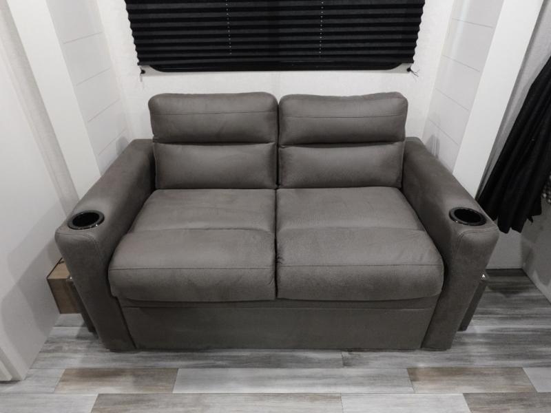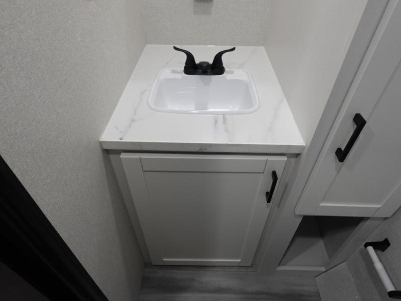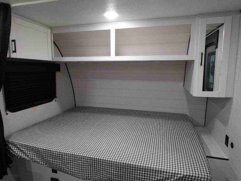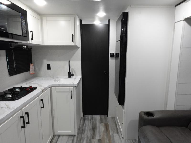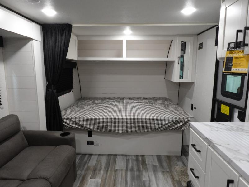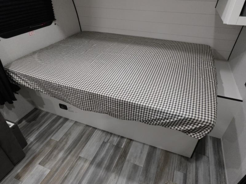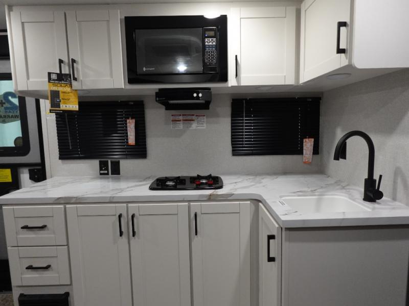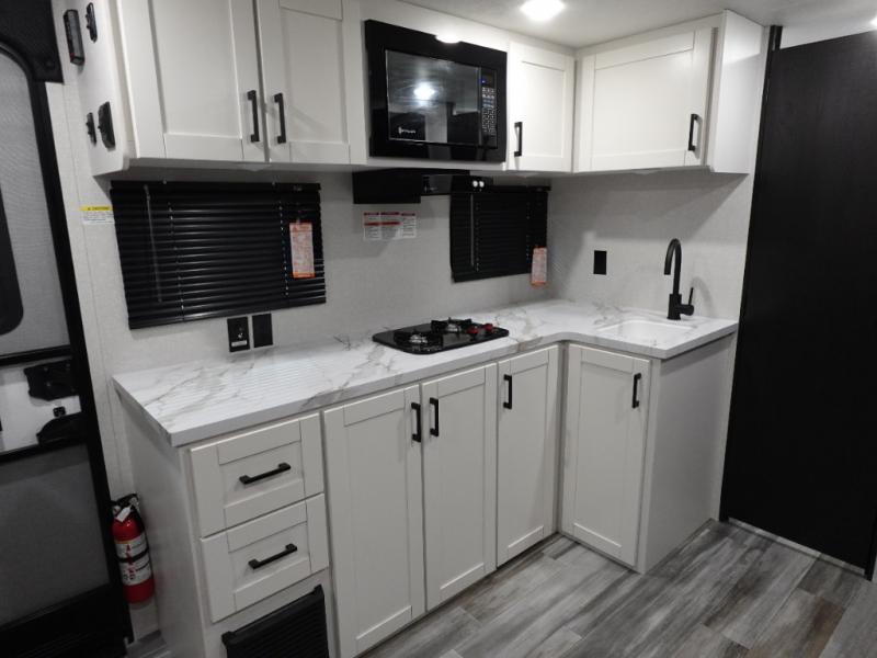 This single-axle couple's travel trailer is sure to bring you happiness at the campground. There is a front queen bed with a privacy curtain if you have a guest staying over on the jack-knife sofa, and the movable table in front of the sofa will provide more floor space when needed. A cooktop and microwave oven will let you make meals each day, and an 8 cu. ft. 12V refrigerator will be perfect for perishables. This model also includes a full rear bath with a tub/shower, a toilet, plus a sink and a linen closet for clean towels. The optional STX Edition can be added on this model which includes 16 in. off-road tires, triple entry steps, a power tongue jack, and more!