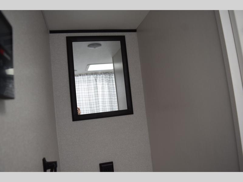 This single-axle couple's travel trailer is sure to bring you happiness at the campground. There is a front queen bed with a privacy curtain if you have a guest staying over on the jack-knife sofa, and the movable table in front of the sofa will provide more floor space when needed. A cooktop and microwave oven will let you make meals each day, and an 8 cu. ft. 12V refrigerator will be perfect for perishables. This model also includes a full rear bath with a shower, a toilet, plus a sink and a linen closet for clean towels.
