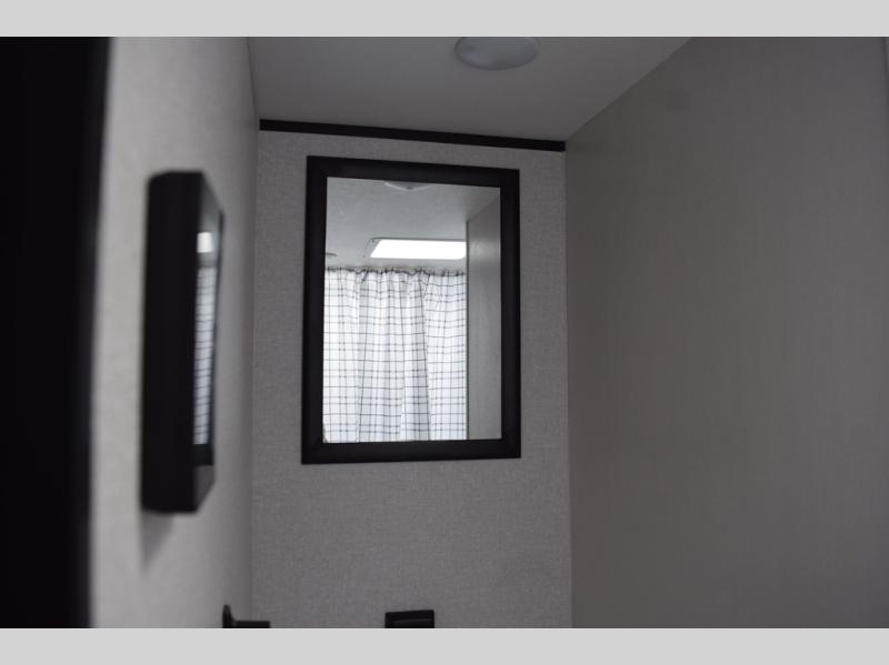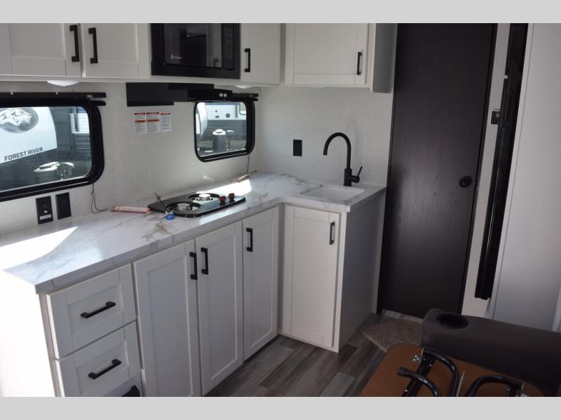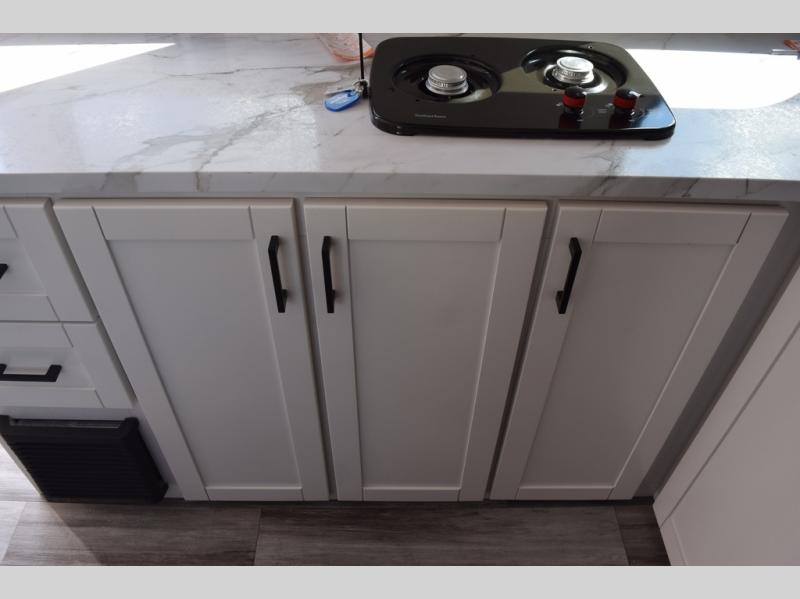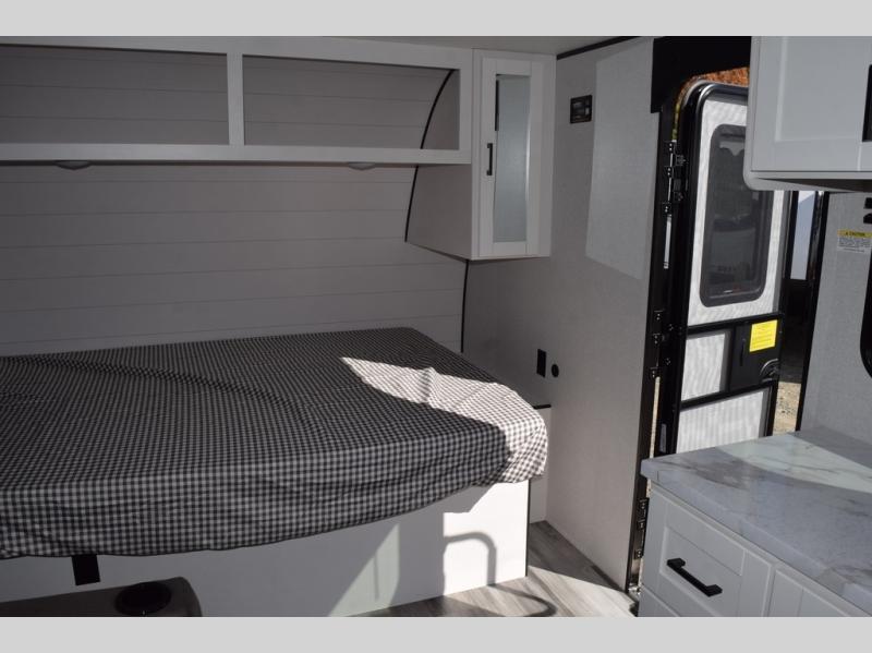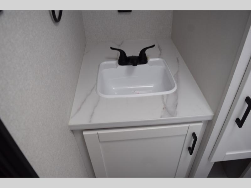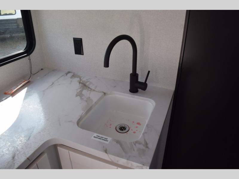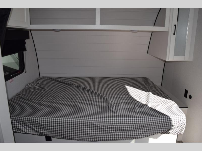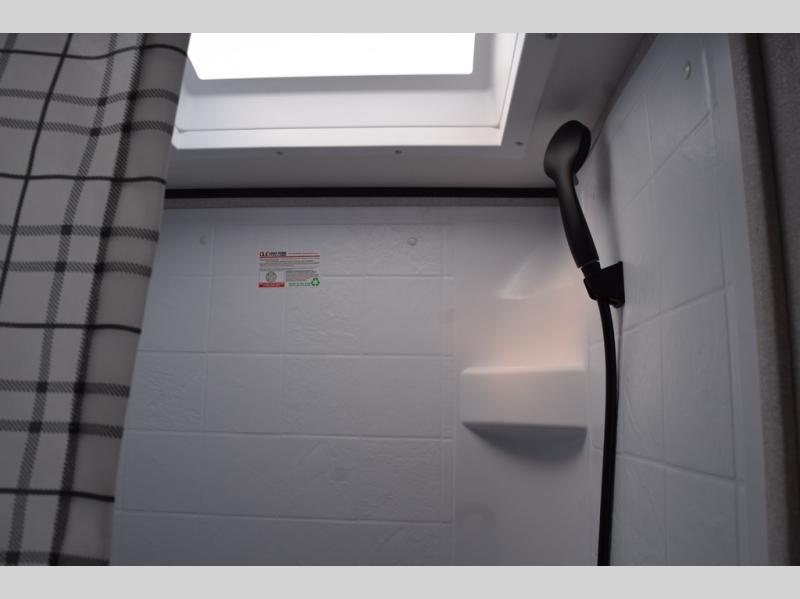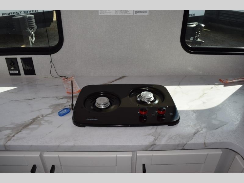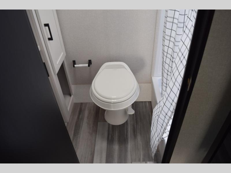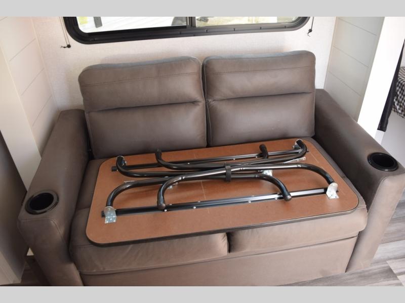 This single-axle couple's travel trailer is sure to bring you happiness at the campground. There is a front queen bed with a privacy curtain if you have a guest staying over on the jack-knife sofa, and the movable table in front of the sofa will provide more floor space when needed. A cooktop and microwave oven will let you make meals each day, and an 8 cu. ft. 12V refrigerator will be perfect for perishables. This model also includes a full rear bath with a shower, a toilet, plus a sink and a linen closet for clean towels.