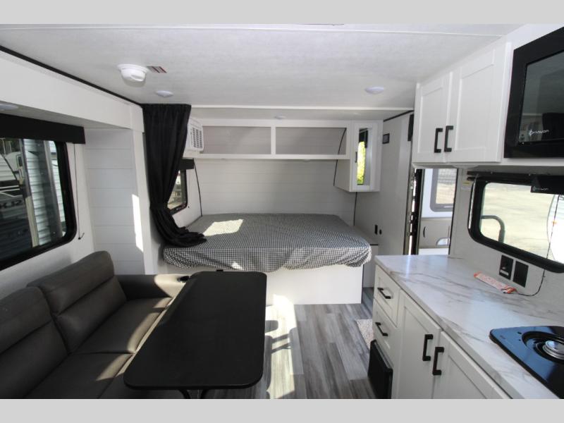 This single-axle couple's travel trailer is sure to bring you happiness at the campground. There is a front queen bed with a privacy curtain if you have a guest staying over on the jack-knife sofa, and the movable table in front of the sofa will provide more floor space when needed. A cooktop and microwave oven will let you make meals each day, and an 8 cu. ft. 12V refrigerator will be perfect for perishables. This model also includes a full rear bath with a shower, a toilet, plus a sink and a linen closet for clean towels.