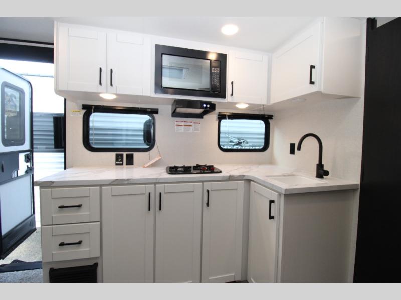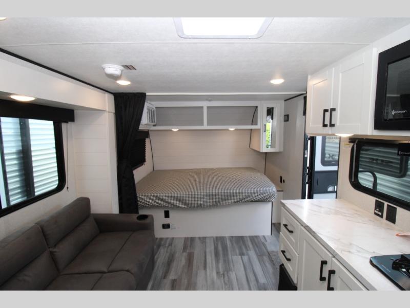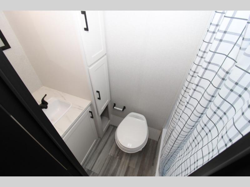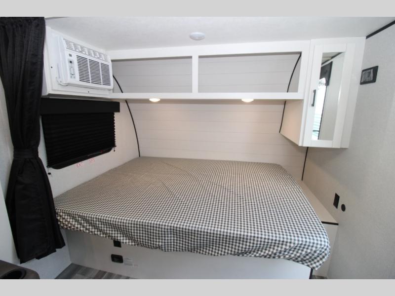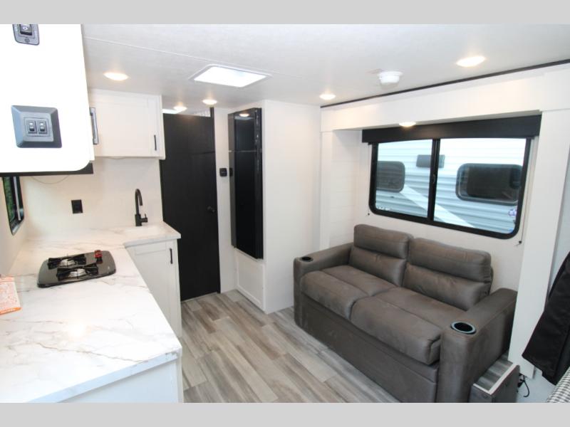 This single-axle couple's travel trailer is sure to bring you happiness at the campground. There is a front queen bed with a privacy curtain if you have a guest staying over on the jack-knife sofa, and the movable table in front of the sofa will provide more floor space when needed. A cooktop and microwave oven will let you make meals each day, and an 8 cu. ft. 12V refrigerator will be perfect for perishables. This model also includes a full rear bath with a shower, a toilet, plus a sink and a linen closet for clean towels.