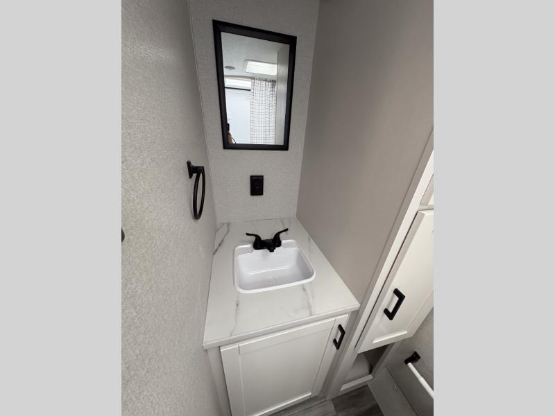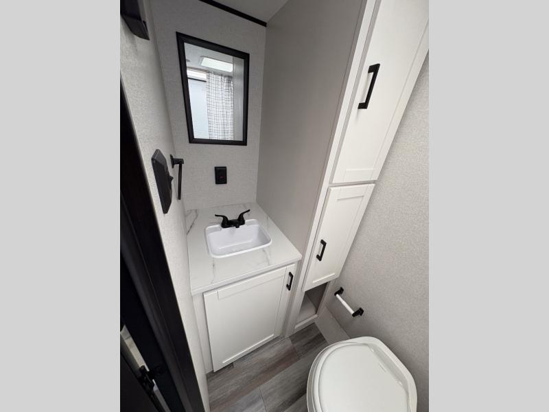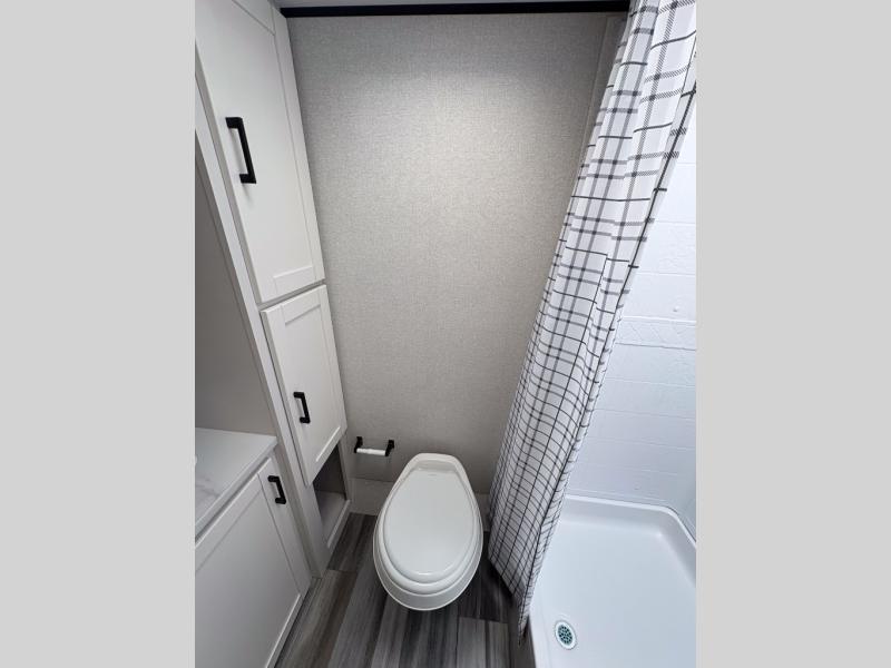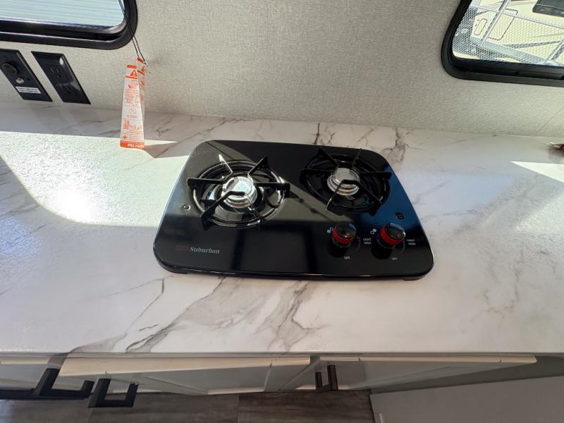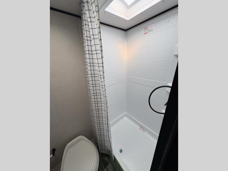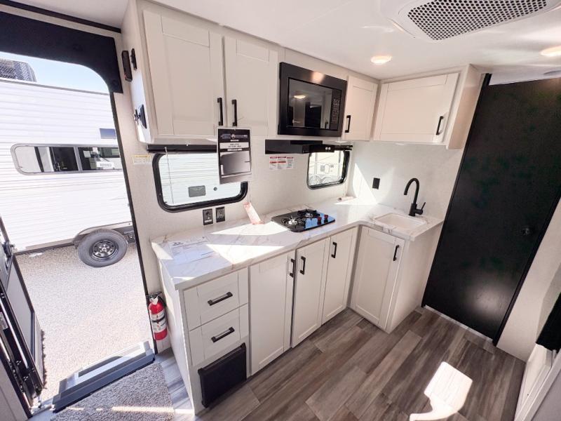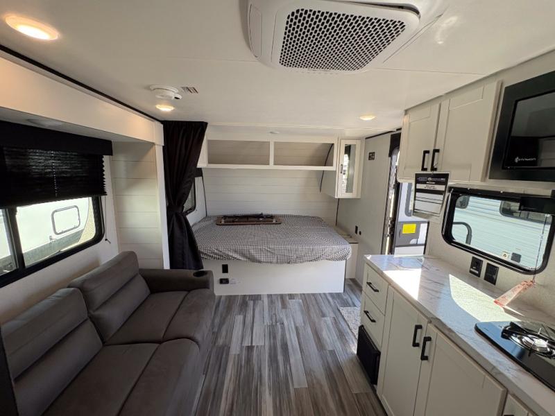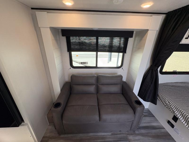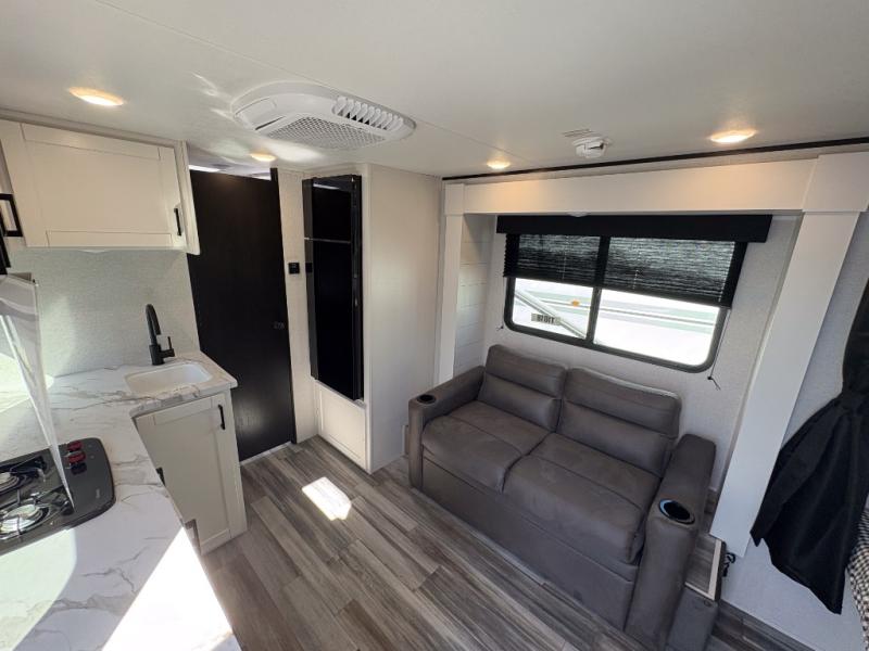 This single-axle couple's travel trailer is sure to bring you happiness at the campground. There is a front queen bed with a privacy curtain if you have a guest staying over on the jack-knife sofa, and the movable table in front of the sofa will provide more floor space when needed. A cooktop and microwave oven will let you make meals each day, and an 8 cu. ft. 12V refrigerator will be perfect for perishables. This model also includes a full rear bath with a shower, a toilet, plus a sink and a linen closet for clean towels.