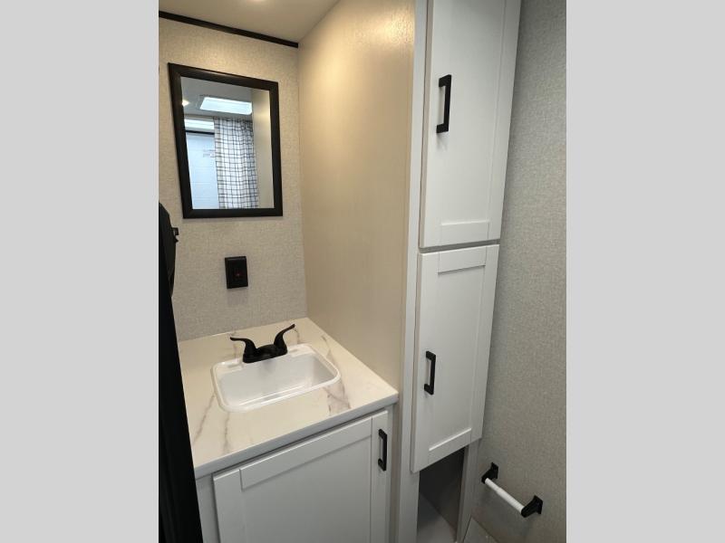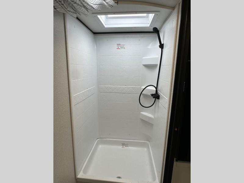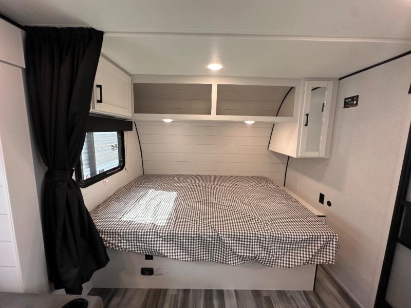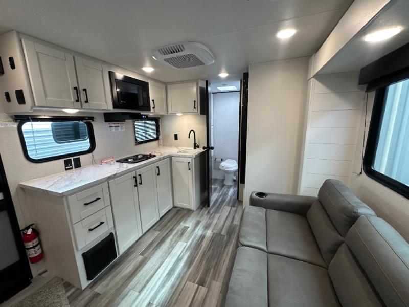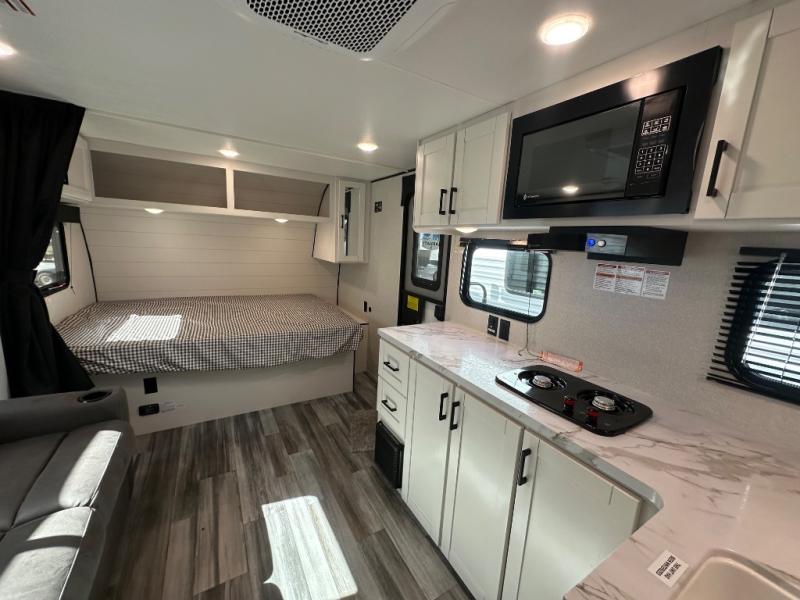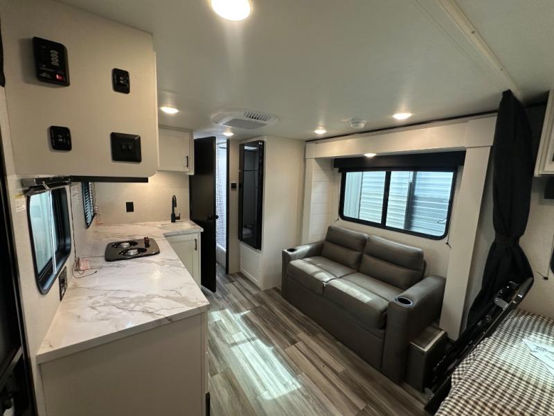 This single-axle couple's travel trailer is sure to bring you happiness at the campground. There is a front queen bed with a privacy curtain if you have a guest staying over on the jack-knife sofa, and the movable table in front of the sofa will provide more floor space when needed. A cooktop and microwave oven will let you make meals each day, and an 8 cu. ft. 12V refrigerator will be perfect for perishables. This model also includes a full rear bath with a shower, a toilet, plus a sink and a linen closet for clean towels.