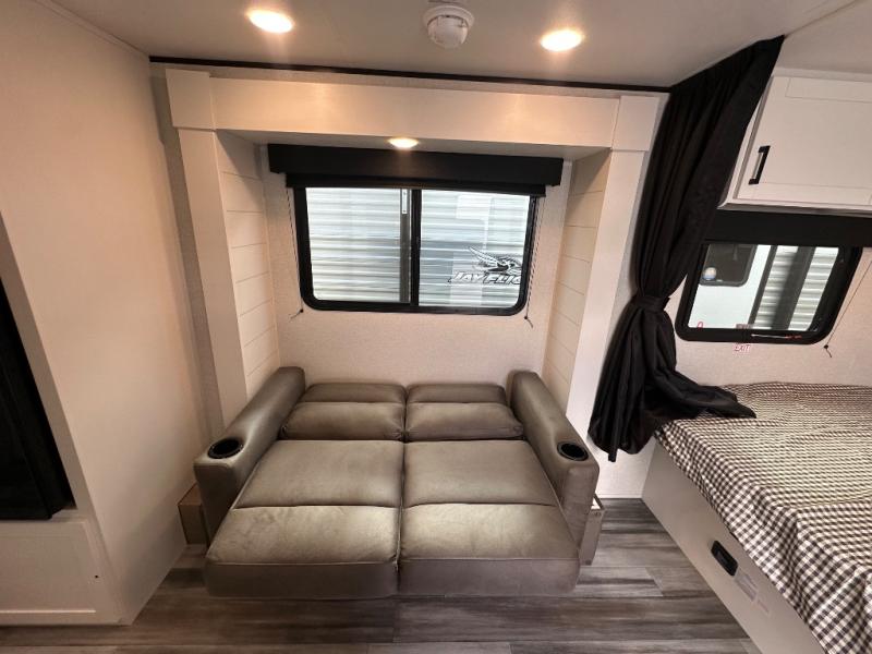 The Jayco Jay Flight SLX travel trailer is quite easy to own because it is lightweight for an easier towing experience. Built on a fully integrated A-frame with galvanized-steel, impact-resistant wheel wells, the Jay Flight SLX has quality at its very foundation. That quality continues on to the electric self-adjusting brakes, easy-lube hubs, Magnum Truss roof system, and LP quick connect. Some of what the mandatory Customer Value Package includes is backup camera prep, Keyed-Alike entry and baggage doors, and an on-demand tankless water heater.