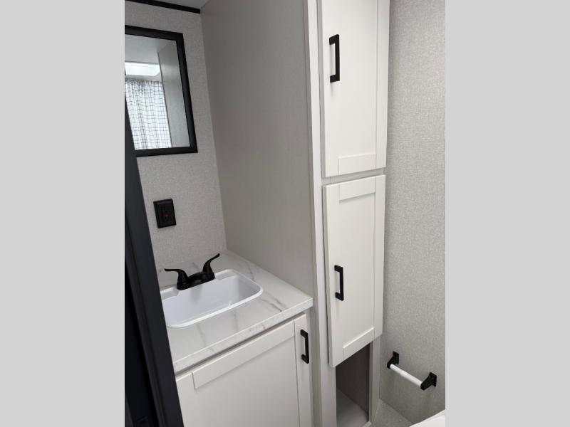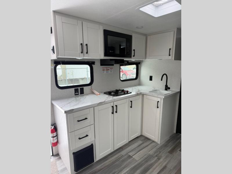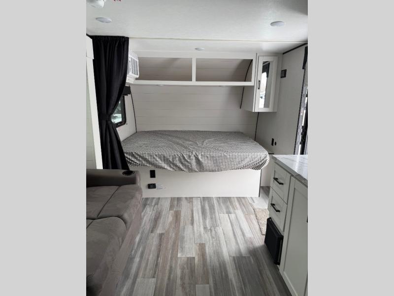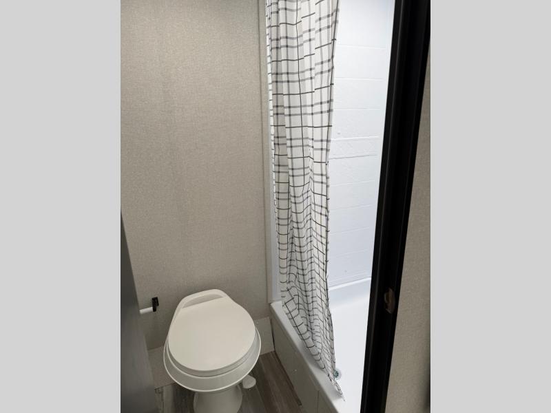 This single-axle couple's travel trailer is sure to bring you happiness at the campground. There is a front queen bed with a privacy curtain if you have a guest staying over on the jack-knife sofa, and the movable table in front of the sofa will provide more floor space when needed. A cooktop and microwave oven will let you make meals each day, and an 8 cu. ft. 12V refrigerator will be perfect for perishables. This model also includes a full rear bath with a shower, a toilet, plus a sink and a linen closet for clean towels.