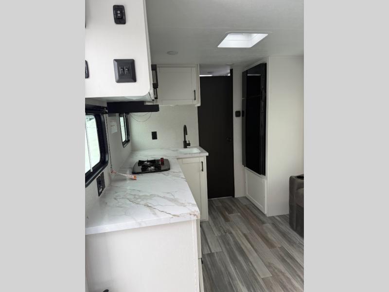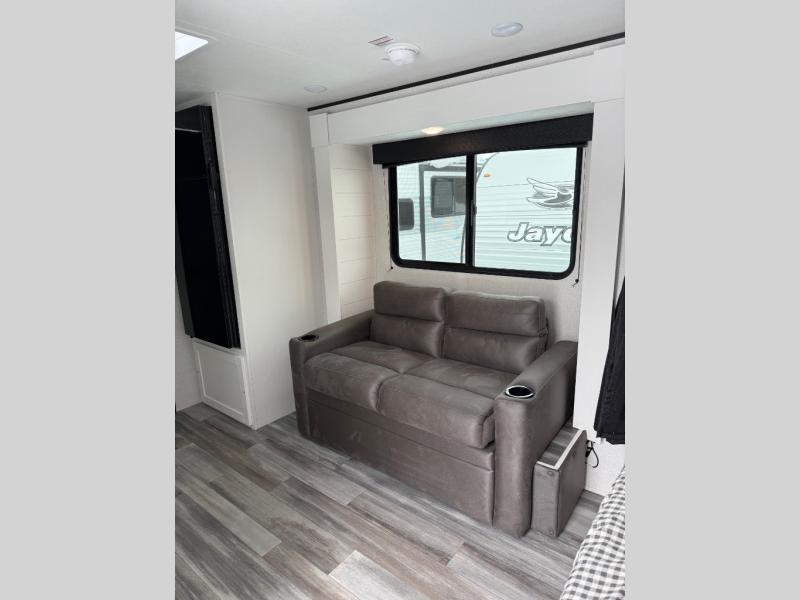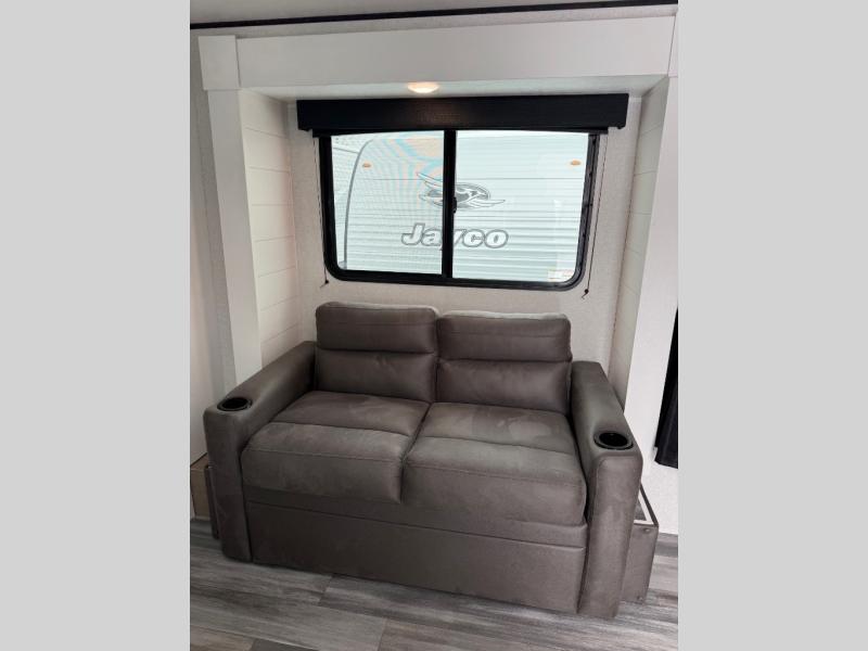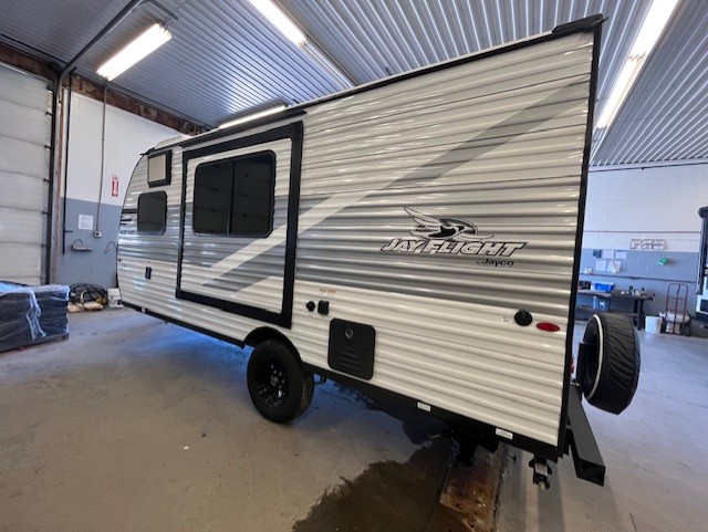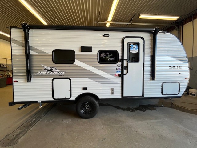 The Jayco Jay Flight SLX travel trailer is quite easy to own because it is lightweight for an easier towing experience. Built on a fully integrated A-frame with galvanized-steel, impact-resistant wheel wells, the Jay Flight SLX has quality at its very foundation. That quality continues on to the electric self-adjusting brakes, easy-lube hubs, Magnum Truss roof system, and LP quick connect. Some of what the mandatory Customer Value Package includes is backup camera prep, Keyed-Alike entry and baggage doors, and an on-demand tankless water heater.